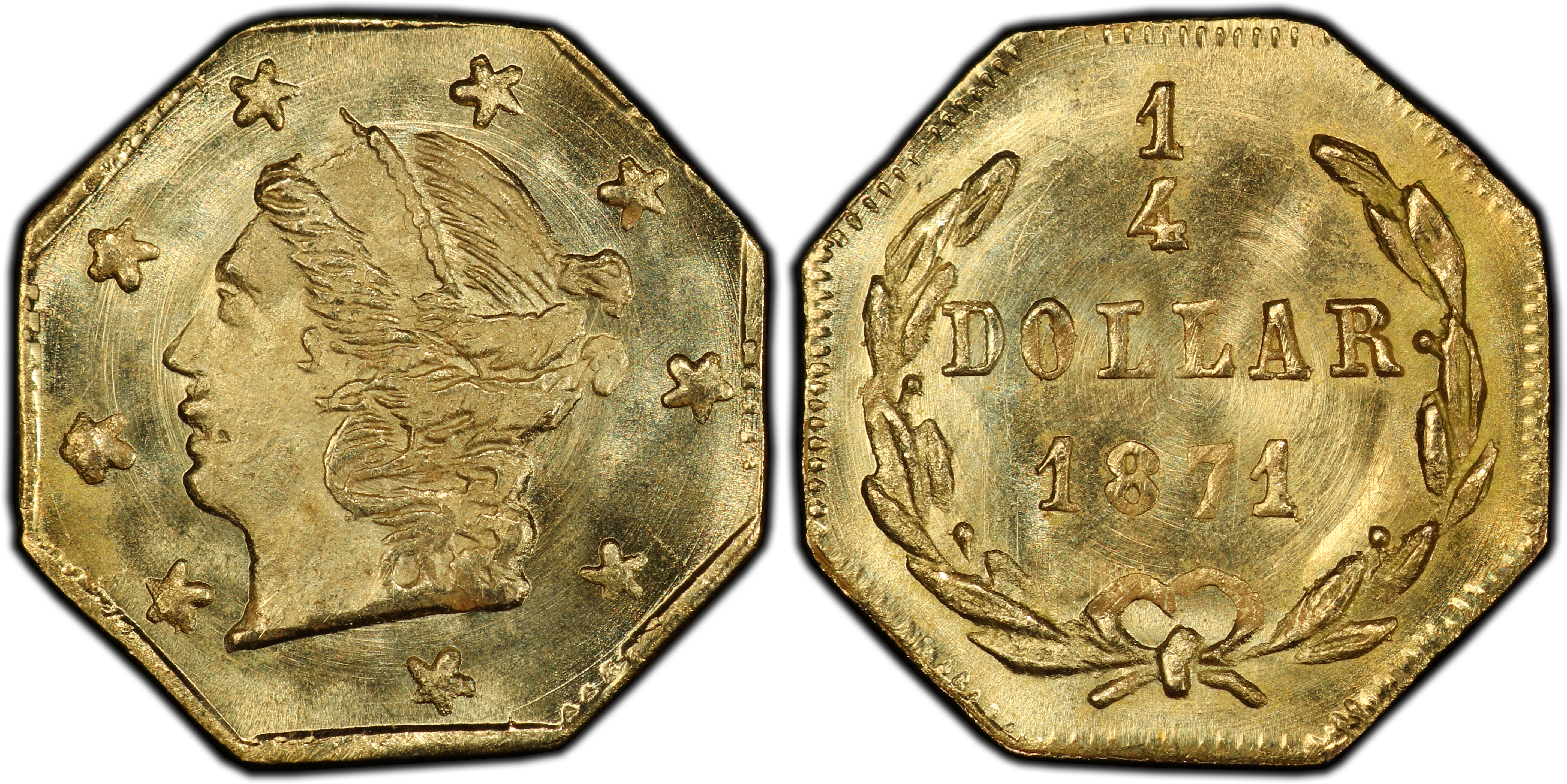 Relevant Grade TypesOriginal 1871 BG-717 coins were business strikes intended for commercial sale as souvenirs, and are found in Circulated (1-58) and Mint State (MS, 60-70) grades. No true Proofs were struck during the original period of issue. However, coins struck with freshly polished dies may exhibit reflective surfaces and receive a Prooflike (PL) or Deep Prooflike (DPL) designation from grading services; these are not a separate issue but rather a desirable manufacturing variance of the business strike.
