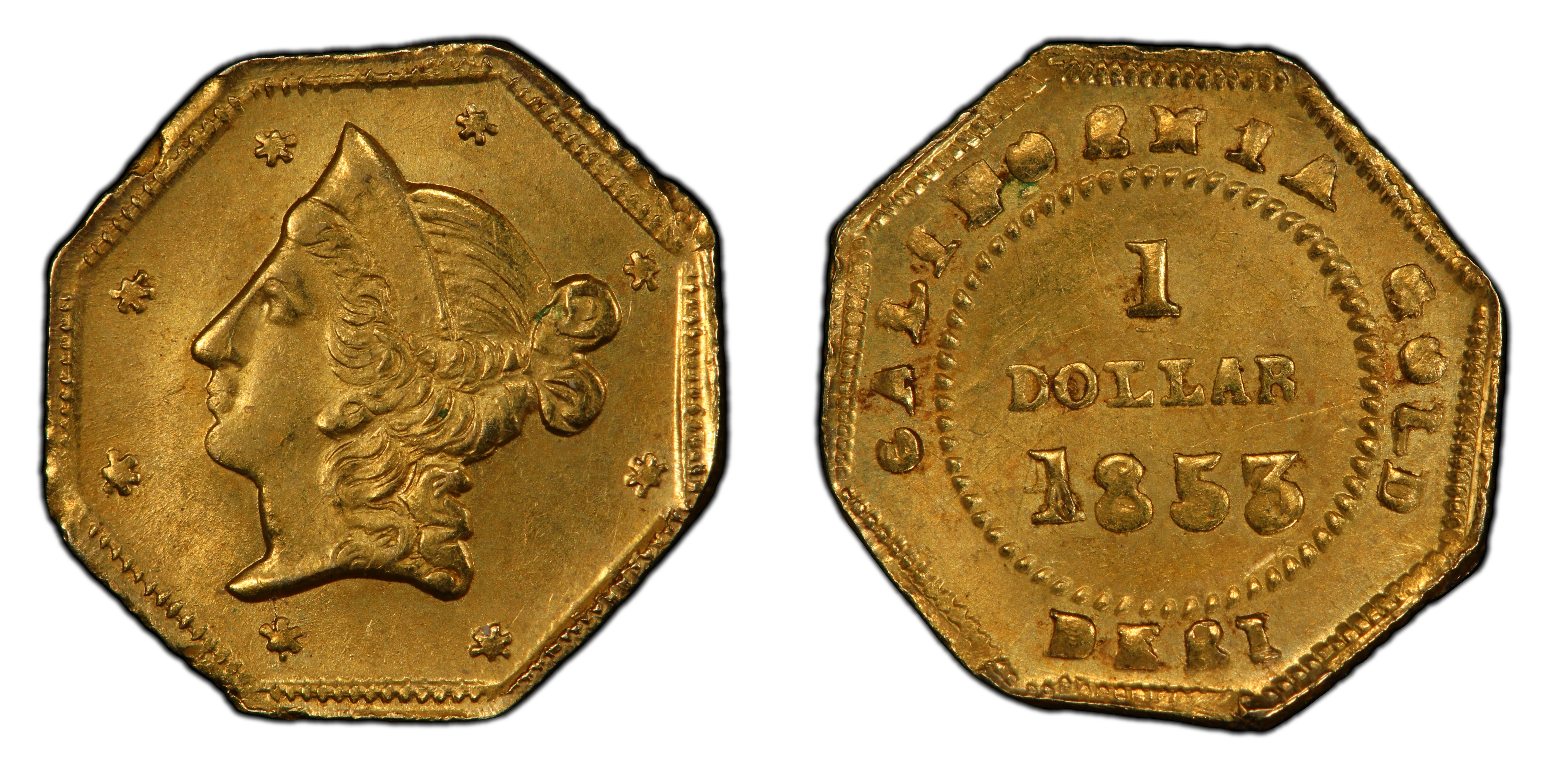 Reverse DescriptionA defiant-looking eagle with outstretched wings, head turned to its right, clutching branches and arrows. The inscription 'CALIFORNIA GOLD' appears above the eagle along the upper facets of the octagon. The denomination '1 D.' is below the eagle. The style of the eagle is unique and somewhat primitive compared to federal issues.