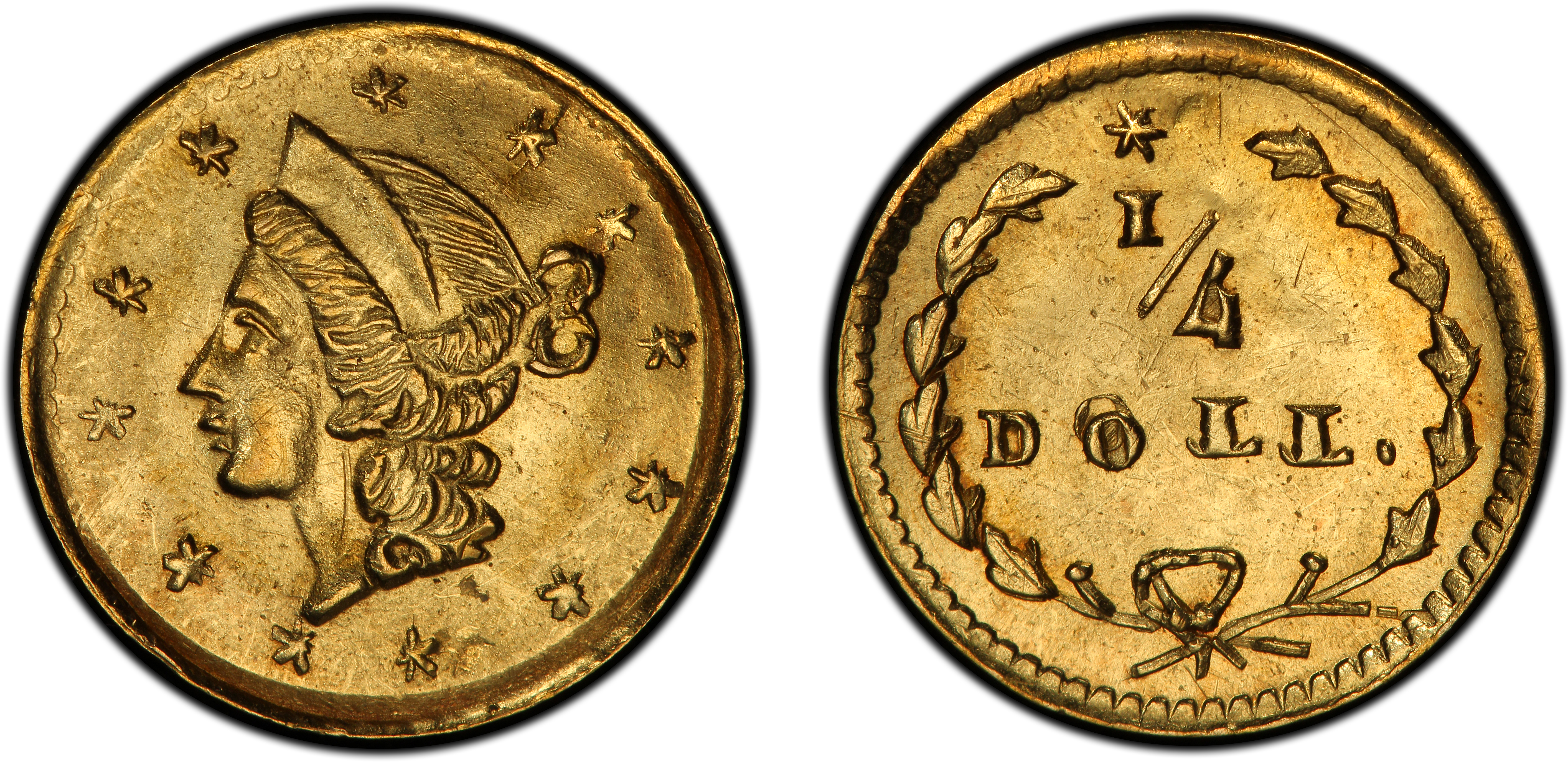 Obverse Inscription Reverse DescriptionThe reverse is dominated by a simple wreath composed of two branches tied by a bow at the bottom. Inside the wreath, the denomination is expressed as '1/4 DOLLAR'. A key diagnostic for this variety is a clearly double-punched 'O' in 'DOLLAR'. The legend CALIFORNIA GOLD often appears around the periphery, though its presence and clarity can vary based on strike quality.