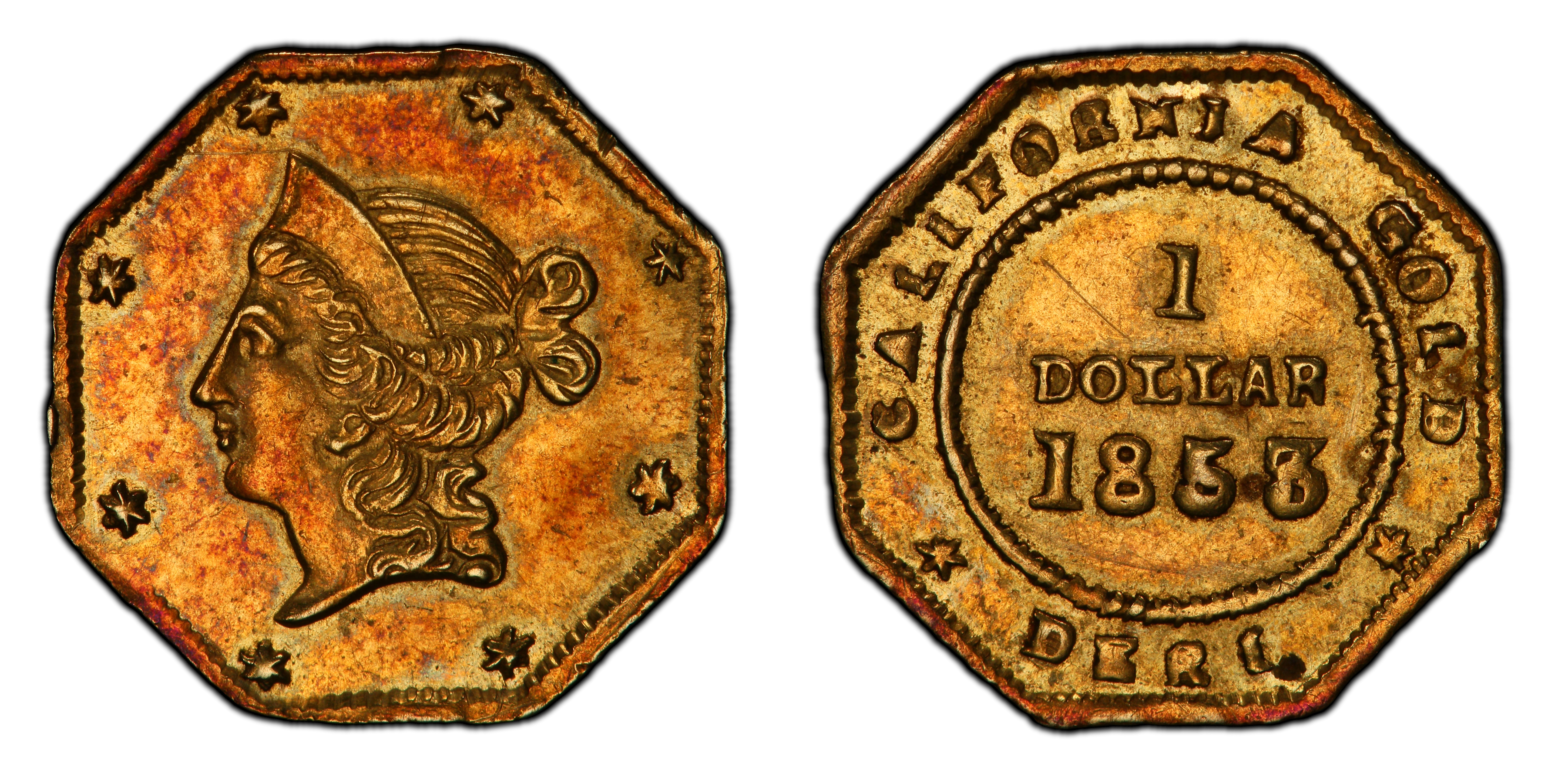 The 1853 G$1 BG-520 is a numismatic artifact of immense rarity, born from the chaotic and economically volatile crucible of the California Gold Rush. Following the discovery of gold at Sutter's Mill in 1848, a massive influx of prospectors and merchants descended upon California, creating a vibrant but haphazard economy. Gold dust, the primary medium of exchange, was imprecise and inconvenient for small, everyday transactions. This created a severe shortage of small-denomination coinage, a void the federal government was slow to fill; the San Francisco Mint would not begin operations until 1854. In response to this critical commercial need, a number of private manufacturing jewelers in San Francisco began striking their own coinage in 1852. These pieces, known as 'Period One' (1852-1857) California Fractional Gold, were intended to, and did, circulate as currency. The BG-520 dollar, attributed to the French jeweler Antoine Louis Nouizillet, is a prime example of this fascinating genre. Struck in 1853, it represents a period when private minters were at their peak, producing octagonal and round coins that mimicked federal designs to inspire public confidence. These coins were typically hammered—a process where a top die was struck with a sledgehammer onto a planchet resting on a bottom die—resulting in strikes of varying quality. Despite their utility, these fractional pieces were technically illegal, as the U.S. Constitution grants coinage authority solely to the federal government. Furthermore, most were significantly underweight, containing less than their face value in gold, making them a highly profitable venture for their makers. The BG-520 is a ghost of this era; its extreme rarity (R-8) suggests a minuscule original mintage, perhaps as a trial or part of a very small, rapidly withdrawn batch. The few surviving examples are treasured relics, tangible links to a time when the desperate need for a functional currency in the West was met by entrepreneurial, and perhaps opportunistic, private enterprise.