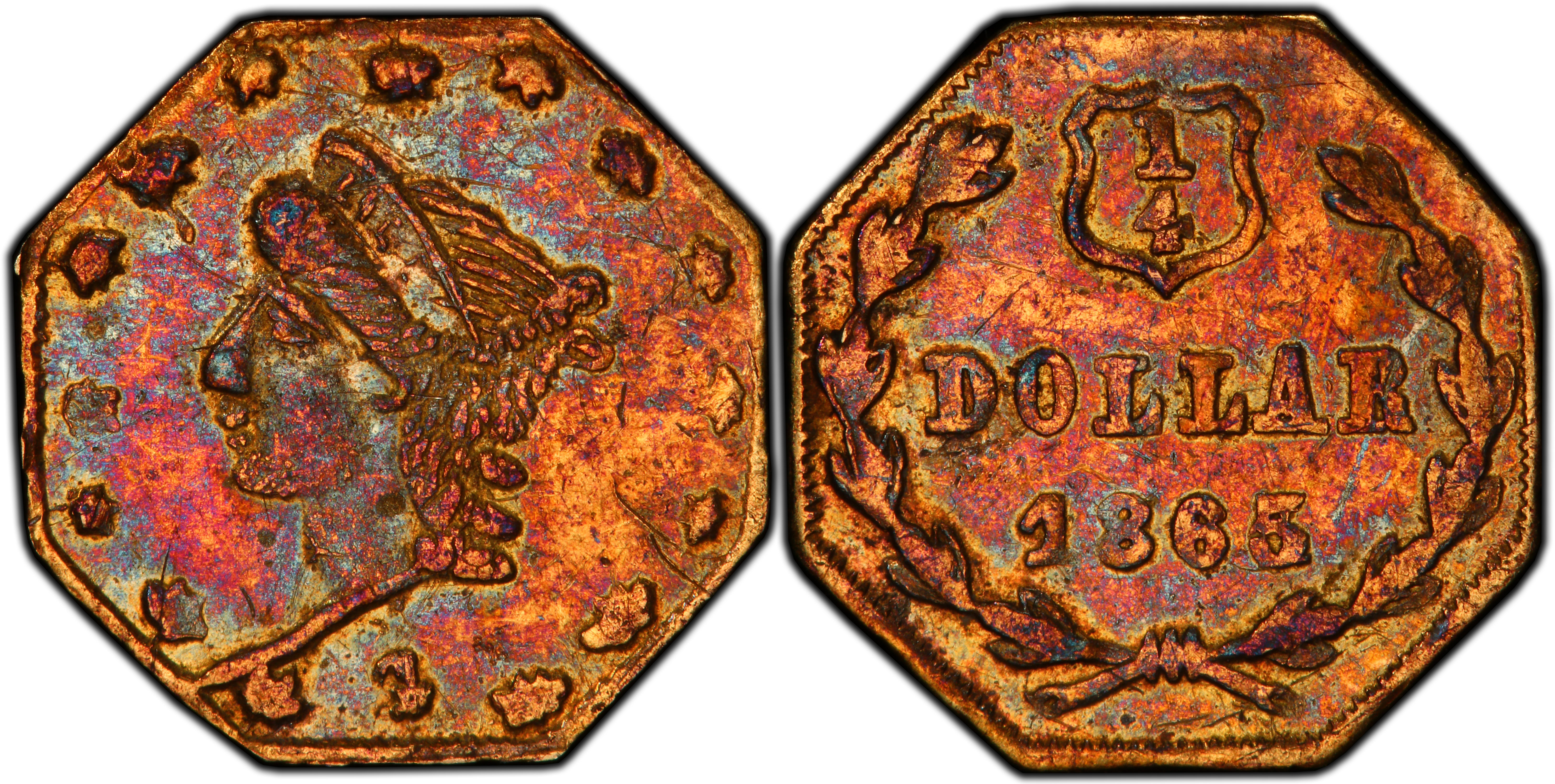 The 1865/4 25 Cents, cataloged as BG-736, is a quintessential example of 'Period Two' California Fractional Gold. By the mid-1860s, the initial, acute shortage of small change that characterized the early Gold Rush had been largely resolved by the output of the San Francisco Mint. The raison d'ĂȘtre for fractional gold had shifted from necessity to novelty. These diminutive gold pieces were no longer primarily instruments of commerce but were instead produced by jewelers as souvenirs, keepsakes, and curiosities for tourists and locals enchanted by the romance of the Gold Rush. This variety, struck by the firm of Robert B. Gray & Co. in San Francisco, is a fascinating numismatic artifact of this transitional period. The coin exhibits an overdate, with the digit '5' clearly punched over a '4' in the die, a common practice among private minters to economize and reuse existing dies. The dies used for BG-736 were, according to Breen and Gillio, 'drastically repolished,' likely to efface clash marks or extend their usable life. This heavy polishing resulted in a distinctive and consistent appearance across surviving examples: a weakly defined portrait of Liberty, stars that appear as indistinct blobs, and a generally soft strike. This was not a result of carelessness but rather a reflection of their intended market; precision and intrinsic value were secondary to their function as affordable mementos. The Private Coinage Act of April 22, 1864, had already outlawed the issuance of private coins, but enforcement was lax, particularly for these small, low-value tokens which were not seen as a significant threat to federal currency. Production continued, albeit somewhat clandestinely, for nearly two more decades. The BG-736, with its mid-war date and recycled die, tells the story of a cottage industry adapting to a new economic reality, its products cherished more for their symbolism than their utility in daily transactions.