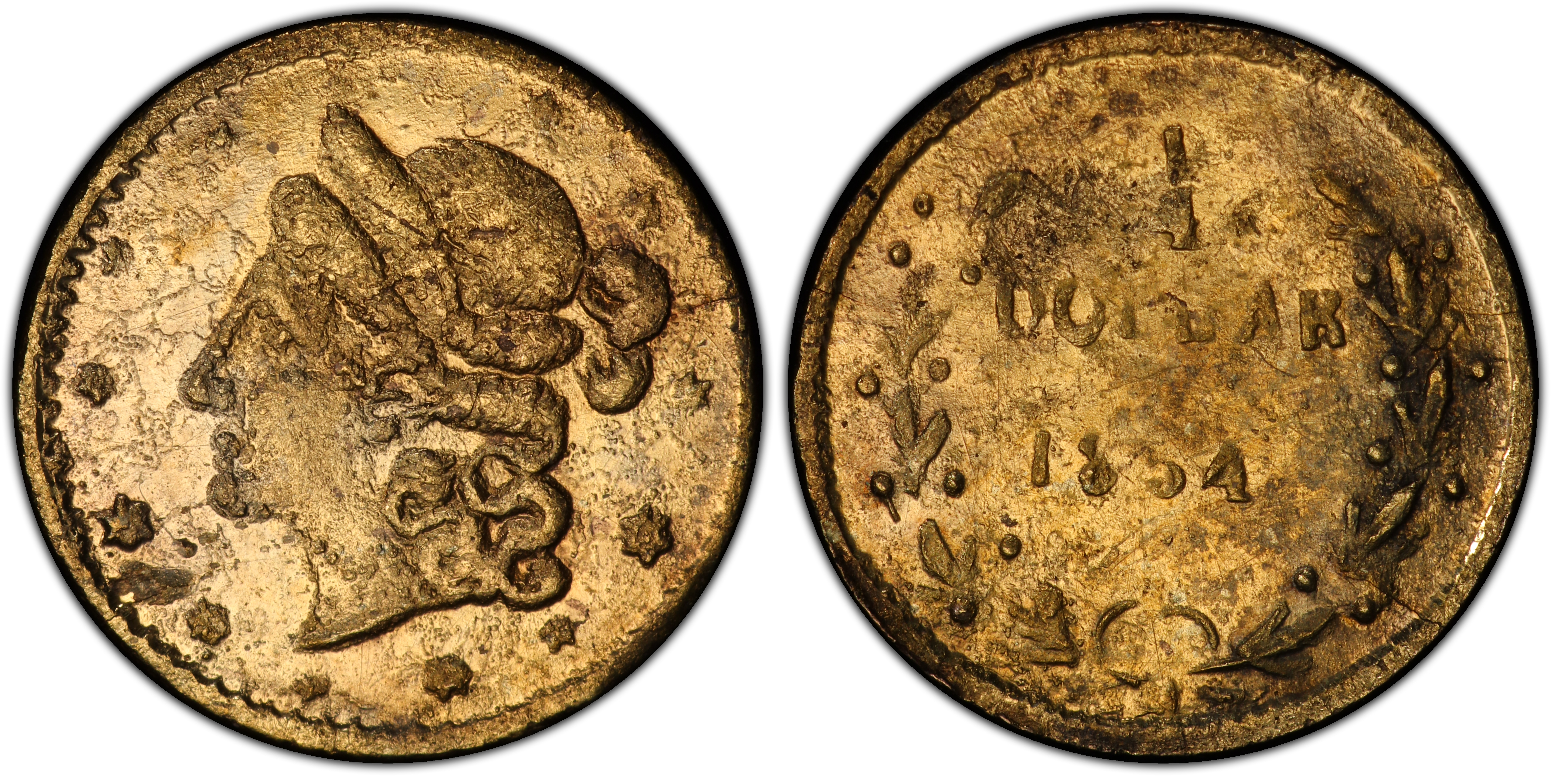 Authentication TipsGenuine BG-216 examples will exhibit a characteristic granular, slightly pock-marked surface texture on the obverse from the heavily polished rusty die. The strike will often appear soft, especially on the stars and the wreath. The specific placement of the date relative to 'DOLLAR' is a key diagnostic. Counterfeits are common in the series; they are often thicker, have a 'soapy' or cast appearance, incorrect weight, and may be made of brass or low-purity gold. Any piece lacking the denomination 'DOLLAR' is a later token or replica. Authentication by a leading third-party grading service is highly recommended.