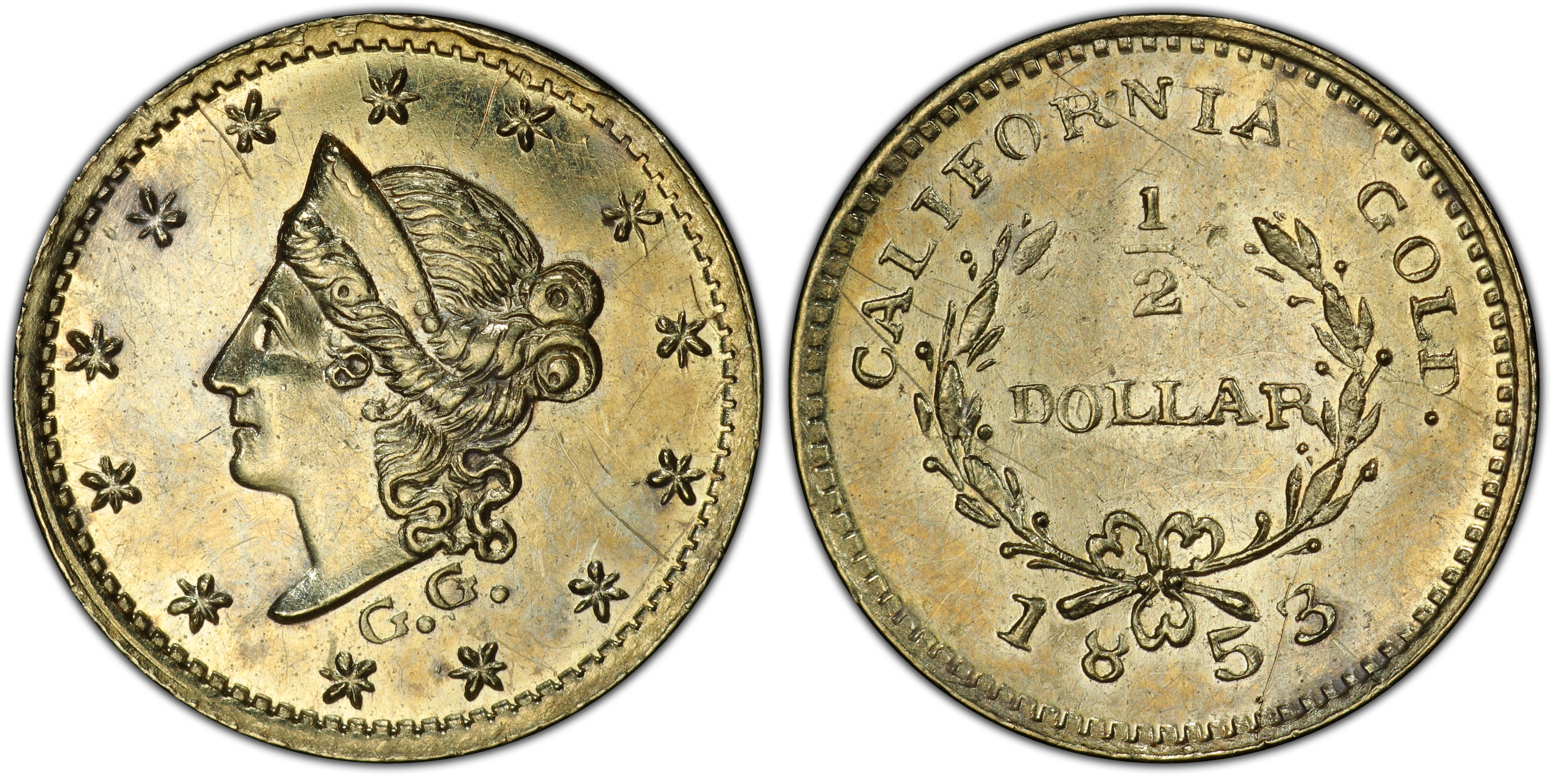 The 1853 Gold 50 Cents, cataloged as Breen-Gillio 414, is a quintessential artifact from the chaotic and economically vibrant era of the California Gold Rush. Following the discovery of gold at Sutter's Mill in 1848, a massive influx of prospectors and merchants descended upon California, creating a booming economy almost overnight. However, this rapid growth far outpaced the supply of official United States coinage, leading to a severe shortage of small change for daily transactions. While gold dust and nuggets served for larger purchases, the need for fractional currency to buy a meal, a drink, or basic supplies was acute. In response to this commercial crisis, private jewelers and metallurgists in San Francisco began striking their own small-denomination gold coins in 1852. The BG-414 is a 'Period One' issue, a designation given to coins struck between 1852 and 1857 that were genuinely intended to circulate and alleviate the coin shortage. Unlike the later, often underweight 'Period Two' souvenir pieces, these early issues were generally accepted in local commerce. The production method for these tiny coins was rudimentary, typically involving hand-cut dies and a hammer strike, which resulted in significant variation between specimens. The anonymous minter of BG-414 likely operated a small, efficient establishment, producing coins that mimicked the general appearance of federal gold coinage to inspire public trust. These fractional pieces, however, were almost universally underweight, providing a tidy profit for their makers. The BG-414, like its contemporaries, filled a vital monetary niche until the San Francisco Mint began full-scale production of federal coinage in the mid-1850s, gradually rendering the private issues obsolete. Today, the BG-414 is a tangible link to the rugged, entrepreneurial spirit of Gold Rush California, representing a private solution to a public economic problem.