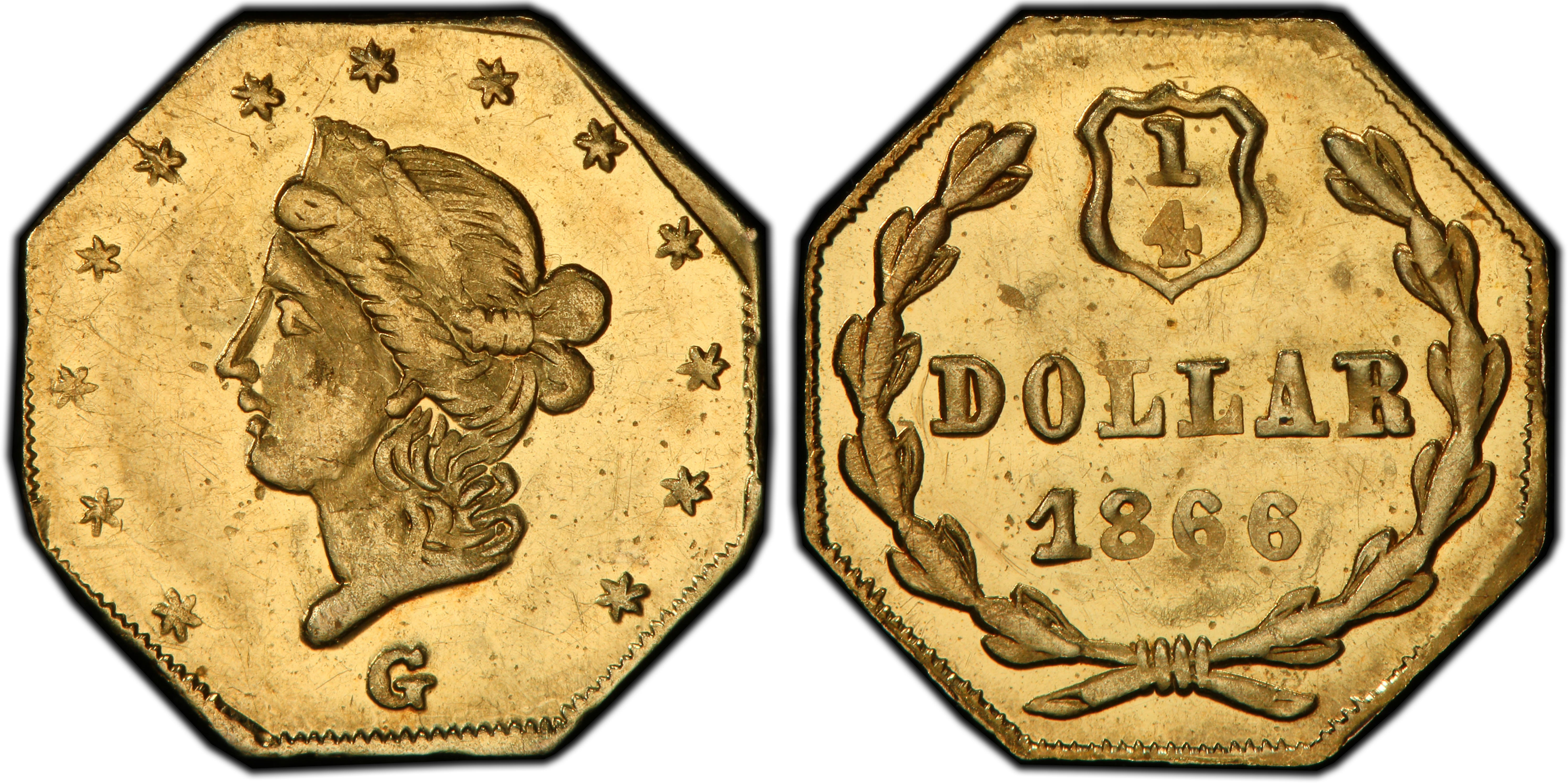 The 1866 25 Cents, cataloged as Breen-Gillio 737, is a quintessential example of a 'Period Two' California Fractional Gold piece. By the mid-1860s, the initial, desperate need for small denomination coinage that fueled the creation of the earlier 'Period One' issues (1852-1857) had largely subsided. The San Francisco Mint was in full operation, producing ample federal silver and gold coins for commerce. However, the allure of the Gold Rush and the romance of private gold coinage had created a new market: souvenirs and keepsakes. San Francisco jewelers, leveraging their metallurgical skills, stepped in to fill this demand. These 'jeweler's issues' were not intended to circulate as money in the same way as their predecessors, but were instead sold as charms, mementos for tourists, or novelties for those back East captivated by tales of California gold. The year 1866 is particularly significant as it falls two years after the Coinage Act of 1864, which explicitly made the private minting of coinage illegal. Despite this federal law, enforcement by the Secret Service was inconsistent and not fully realized in California until the 1880s. This legal gray area allowed for the continued production of denominated pieces like the BG-737. Stylistically, BG-737 is often associated with the workshop of Robert B. Gray & Co., a prolific producer of fractional gold during this era. Gray had purchased the business of another jeweler, Antoine Nouizillet, around 1859-60 and continued producing pieces with both old and new dies. While this specific variety lacks the characteristic 'G' mintmark found on many of Gray's other issues, the overall fabric, die work, and quality are consistent with his known output. These pieces were typically struck with manually operated presses, often leading to variations in strike quality. The use of dies beyond their optimal lifespan was common, resulting in issues struck from rusted or deteriorating dies, a known characteristic of the BG-737 variety. Their intrinsic value was often less than their face value, a defining feature of Period Two issues, confirming their status as commercial novelties rather than true coinage meant to pass at par in daily transactions.