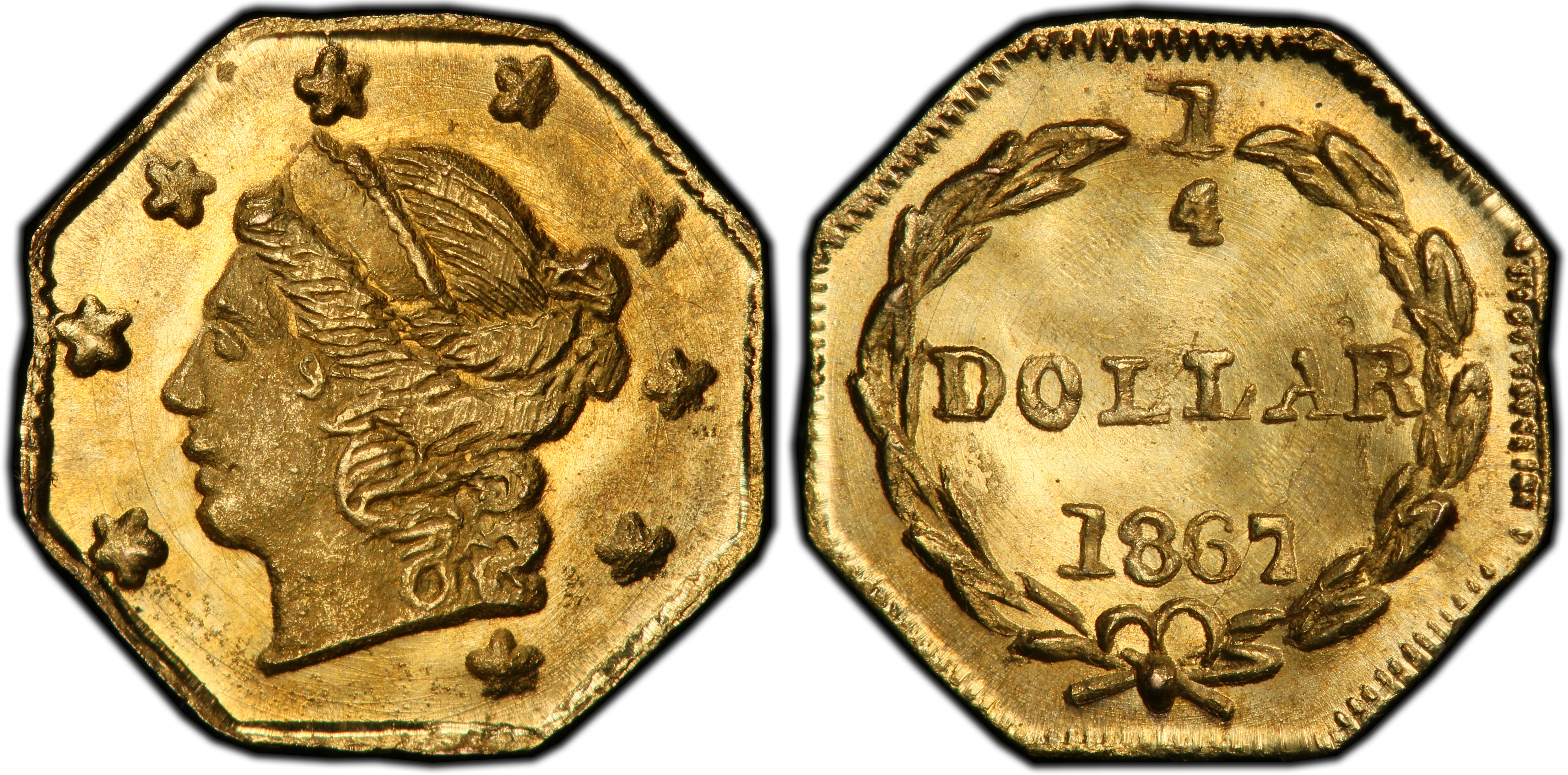 The 1867 G25C BG-709 is a quintessential example of a 'Period Two' California Fractional Gold piece, a fascinating and complex series born from the economic realities of the American West. The initial gold rush (1849-1856) created a severe shortage of small-denomination coinage, leading private minters to strike 'Period One' fractional gold to facilitate daily commerce. These early issues were generally of good quality and intended for circulation. By the late 1850s, the San Francisco Mint was in full operation, alleviating the coin shortage. However, a new market had emerged. Jewelers and entrepreneurs realized the potentional of these miniature gold coins as souvenirs and keepsakes for tourists, Easterners, and Europeans captivated by the romance of the Gold Rush. This gave rise to the 'Period Two' issues (1859-1882), to which the BG-709 belongs. Unlike their predecessors, these coins were not primarily intended for circulation. They were 'jeweler's issues,' often underweight and struck from debased gold, with their intrinsic value being significantly less than their face value. The Coinage Act of 1864 technically outlawed private coinage, but enforcement on the remote West Coast was lax until the early 1880s, allowing these pieces to be openly produced and sold. The minters of Period Two issues are largely anonymous, operating small-scale operations and often using crude, hand-operated presses. The variety of designs proliferated during this era, with the BG-709 featuring a classic Liberty Head motif. The very existence of this coin speaks to a transitional period in California's economy, moving from a frontier society of necessity to a more established region with a burgeoning tourism trade. These pieces were collected from the moment they were made, which accounts for the relatively high proportion of survivors in Mint State condition, though many also fell victim to being mounted in jewelry.