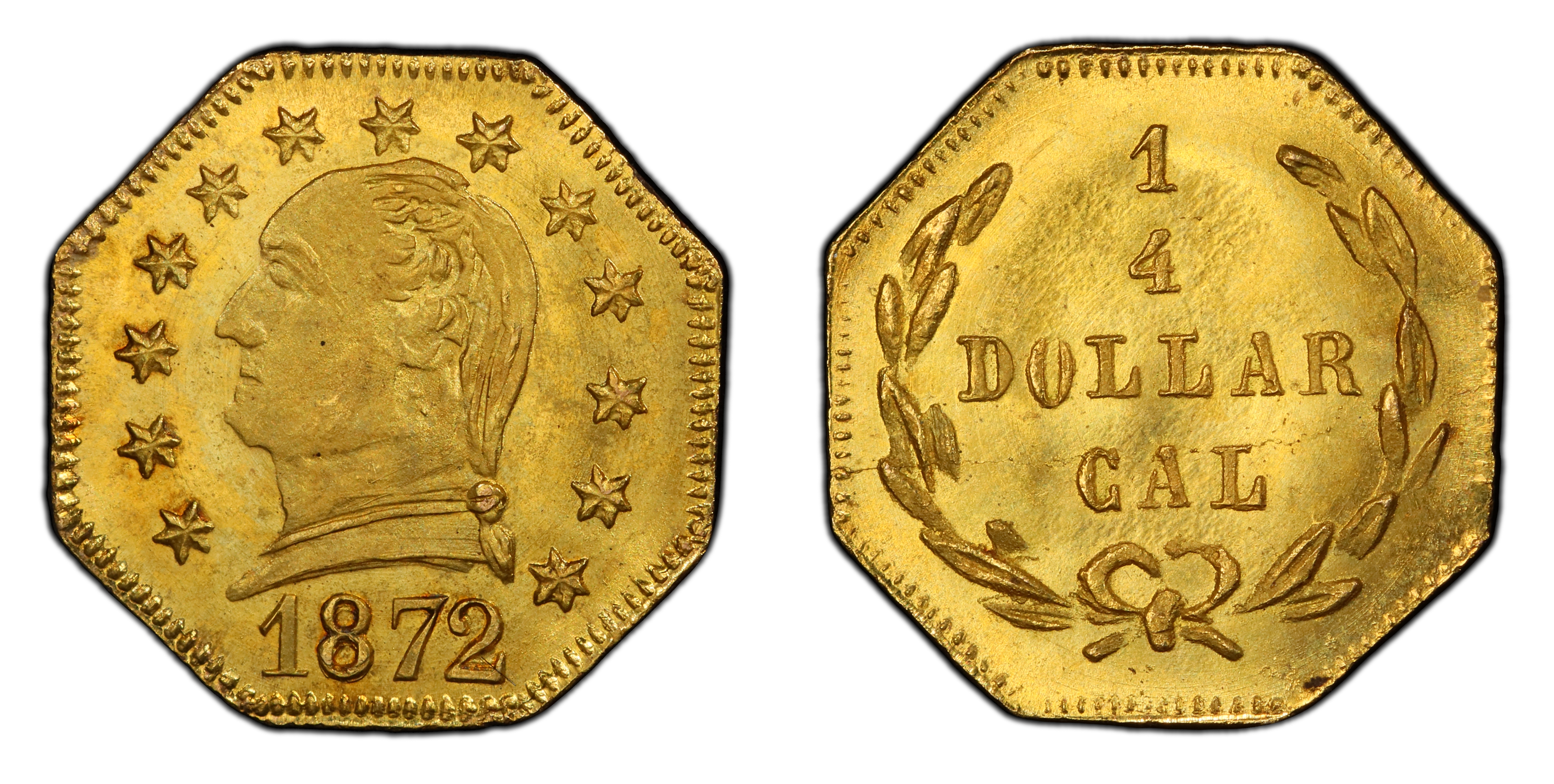 The 1872 BG-722 Washington Head 25 Cents is a quintessential example of 'Period Two' California Fractional Gold. By the 1870s, the initial, desperate need for small circulating currency that spurred the creation of the first fractional gold pieces in 1852 had largely subsided. The San Francisco Mint was producing ample federal coinage, and the fractional pieces had transitioned from a commercial necessity to a popular souvenir and jewelry item. Tourists and locals alike sought these miniature gold coins as mementos of the California Gold Rush, a tangible, glittering link to the state's defining event. This shift in purpose is reflected in the coin's production quality; they were often struck with more care than the earlier, utilitarian issues, sometimes featuring prooflike surfaces. The Washington portrait was a popular and patriotic motif, likely chosen to appeal to a broad audience. However, the legal environment for private minters was precarious. The Coinage Act of 1864 had prohibited private coinage, but enforcement was inconsistent. Minters operated in a gray area, often producing pieces that were technically tokens or charms to avoid federal scrutiny. These 'Period Two' pieces, unlike their 'Period One' predecessors, were knowingly struck underweight relative to their face value, solidifying their status as novelties rather than true circulating money. The BG-722 and its contemporaries represent the maturation of a numismatic niche, born from frontier necessity and sustained by commercial ingenuity and a burgeoning tourist trade that romanticized the Gold Rush era.