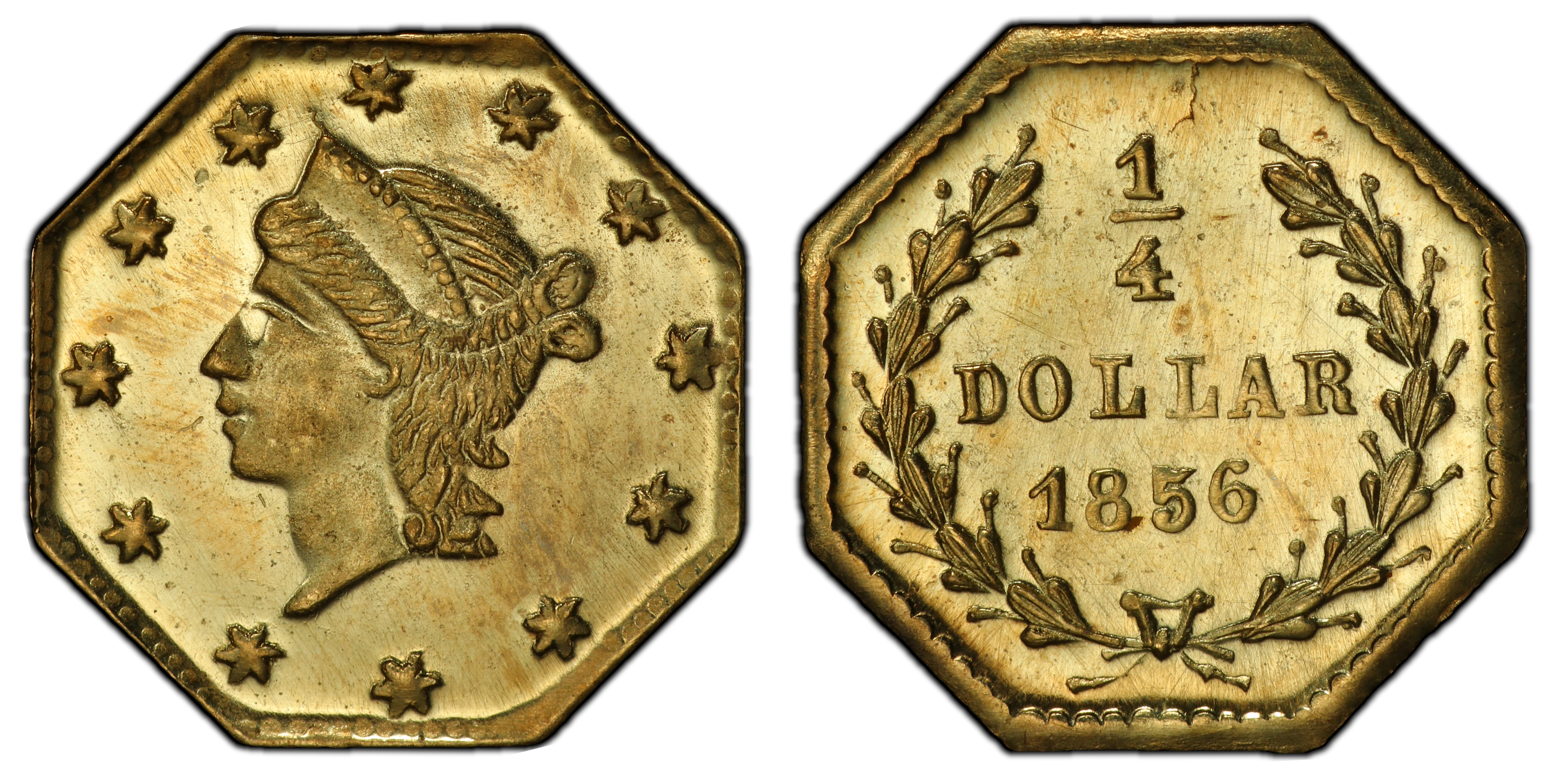 The 1856 G25C BG-111 octagonal 25-cent piece represents a fascinating and essential chapter in the economic history of Gold Rush California. In the early 1850s, the massive influx of prospectors and settlers created a booming economy, yet it was one critically short of small denomination coinage for daily transactions. Gold dust, the primary medium of exchange, was imprecise and cumbersome for minor purchases. While the U.S. government established a branch mint in San Francisco in 1854, its initial output focused on larger denominations, leaving a void for coins valued under a dollar. This necessity spurred private jewelers and metallurgists to fill the gap. Among the most prolific was Antoine Louis Nouizillet, a French jeweler in San Francisco, who produced a wide variety of these 'fractional' gold pieces. The BG-111 is a 'Period One' issue, a designation numismatists use for coins struck between 1852 and 1857, which are believed to have been genuinely intended for circulation. These tiny, octagonal gold coins, mimicking the shape of the massive $50 'slugs' produced by U.S. Assayer Augustus Humbert, would have been a welcome solution for making change. However, their diminutive size made them easy to lose, and their intrinsic gold value was often less than their face value, leading to their eventual rejection for widespread commercial use. Almost as soon as they appeared, they transitioned from functional currency to popular souvenirs and keepsakes that could be easily mailed back East. The Private Coinage Act of 1864 officially banned such private issues, but production of souvenir pieces continued until a Secret Service crackdown in 1883. The BG-111 variety was long considered scarce (rated R-3 by Breen-Gillio), but its numismatic story took a dramatic turn with the recovery of treasure from the S.S. Central America, which sank in 1857. Significant quantities were found in the shipwreck, including stunning prooflike examples, which dramatically increased the known population and made high-grade specimens more accessible to collectors. Today, the BG-111 stands as an iconic and tangible link to the vibrant, chaotic, and entrepreneurial spirit of the California Gold Rush.