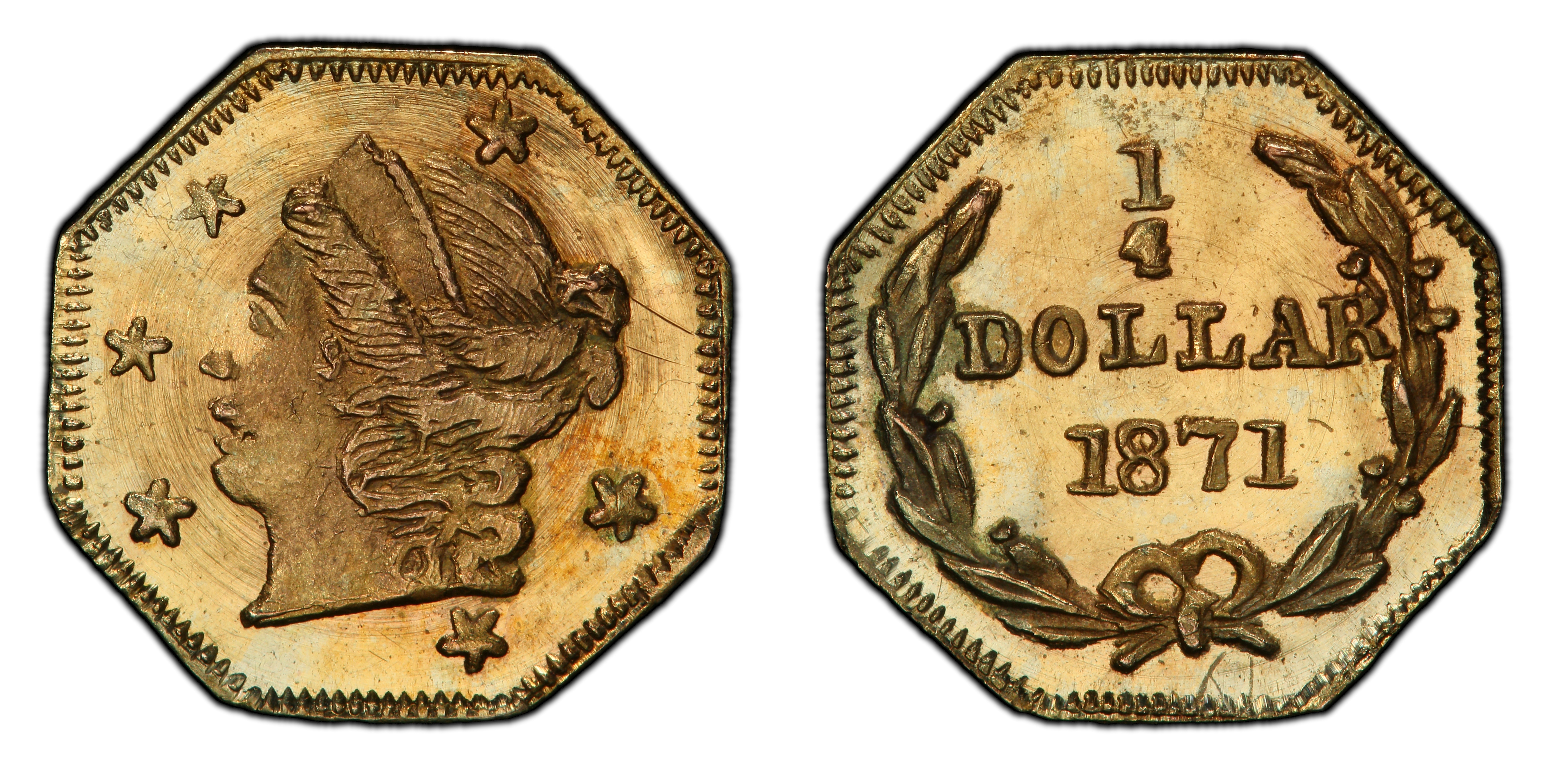 The 1871 Octagonal Liberty Head 25 Cents, cataloged as Breen-Gillio 718, is a numismatic artifact from the second great period of California's private gold coinage. By 1871, the initial, desperate need for small change that characterized the Gold Rush aftermath had largely subsided, thanks to the output of the San Francisco Mint. However, the allure of California gold had not faded. The transcontinental railroad, completed just two years prior, brought a new wave of tourists and settlers eager for tangible souvenirs of the Golden State. This created a thriving market for 'Period Two' (1858-1882) fractional gold pieces. These were no longer primarily instruments of commerce but rather jeweler's issues, struck to satisfy the robust demand for keepsakes and novelty items. Production of these pieces flourished, ironically, after the Private Coinage Act of 1864 made them technically illegal. The law, however, was not rigorously enforced by the Secret Service until the early 1880s, allowing a cottage industry of jewelers and private minters to operate with relative impunity. These minters, many of whom were skilled engravers, produced a dazzling array of designs, often mimicking federal coinage but with their own distinct styles. The BG-718 is a product of this environment. While the specific minter is not identified on the coin, historical evidence points towards the California Jewelry Company. This firm, in 1871, had just purchased the business of Robert B. Gray & Co., a prolific producer of fractional gold. It is highly probable that the California Jewelry Co. continued Gray's work, using existing equipment and perhaps even dies to meet the souvenir demand. The extreme rarity of the BG-718 variety today, with only a couple of examples known, suggests a very small, perhaps experimental, production. It may have been a trial striking from a new die combination or part of a very limited batch made for a specific client. Its existence testifies to the continued innovation and market-driven nature of private coining in post-Gold Rush San Francisco, a fascinating final chapter before federal authorities finally suppressed the practice.