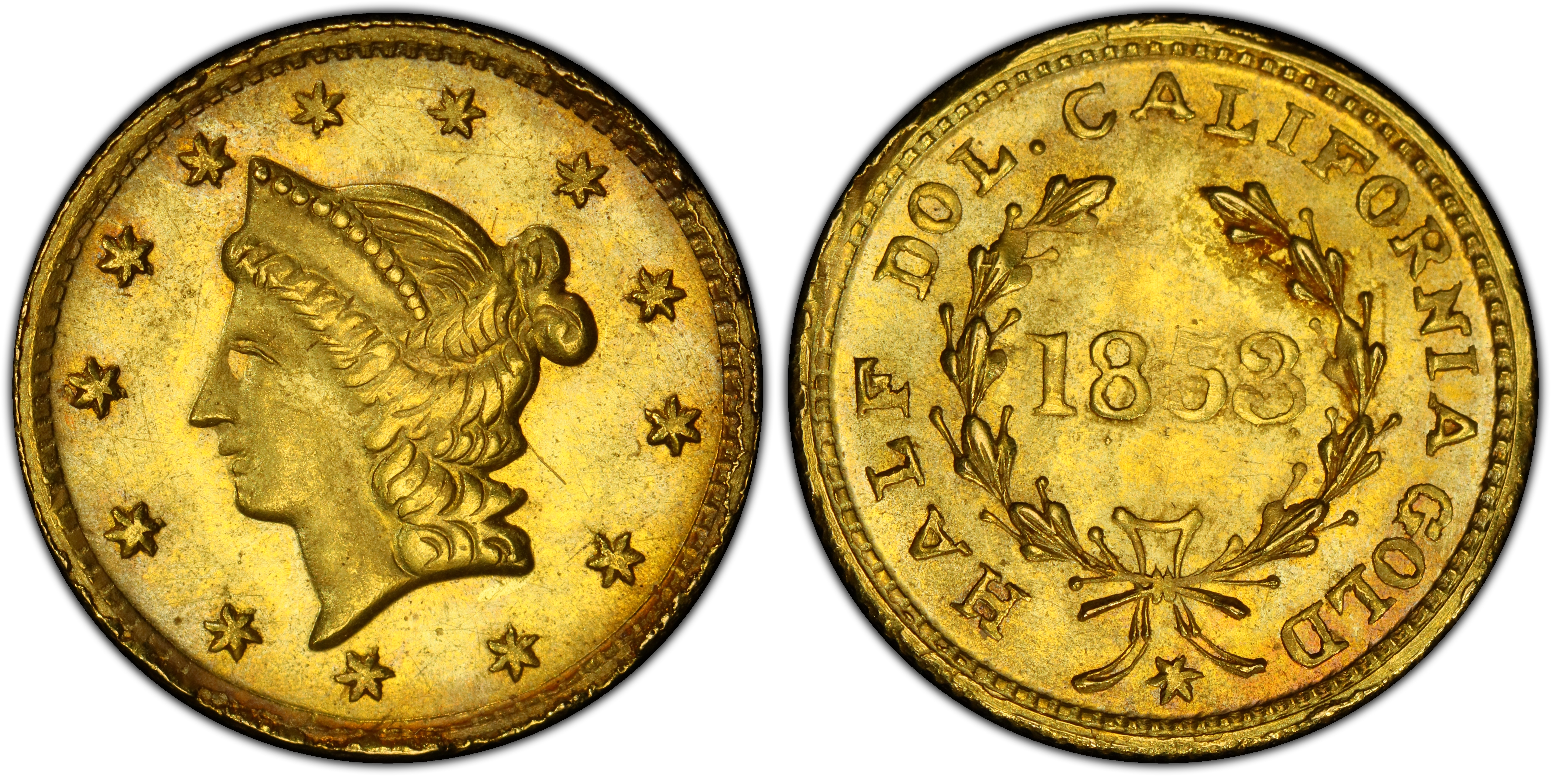 The 1853 Gold 50 Cents, cataloged as Breen-Gillio 430, is a quintessential artifact from the chaotic and economically vibrant era of the California Gold Rush. Following the discovery of gold at Sutter's Mill in 1848, a massive influx of over 300,000 prospectors and merchants descended upon California, creating an instant and severe shortage of circulating coinage for daily transactions. Gold dust, weighed crudely and often inequitably, served as a temporary medium of exchange, but its impracticality for small purchases was a constant source of friction. The nearest United States Mint was in Philadelphia, an arduously long and dangerous journey away. While several private firms began issuing larger denomination gold coins ($5 and up) by 1849, the desperate need for 'pocket change' remained unmet. Into this monetary vacuum stepped a number of enterprising jewelers and metallurgists in San Francisco. Among the most prolific was Antoine Louis Nouizillet, a French immigrant who applied his fine metalworking skills to the production of small-denomination gold pieces. These 'Period One' fractional gold coins, struck from 1852 to 1857, were not official U.S. tender but were generally accepted in local commerce out of sheer necessity. They were crudely produced, often by hand-hammering dies onto blank planchets, resulting in inconsistent strike quality. The BG-430 was one such product of Nouizillet's unofficial mint. Struck from locally sourced gold, which had a naturally high silver content giving it a lighter color, these coins were intrinsically worth less than their face value, making them a profitable venture for their makers but a form of token coinage for the public. Despite their technical illegality and underweight nature, they played a vital role in lubricating the gears of California's booming economy. The establishment of the San Francisco Mint in 1854 spelled the beginning of the end for these private issues. As official U.S. silver and gold coins became readily available, the fractional gold pieces were gradually withdrawn, with most eventually being melted down. This history of utility followed by widespread destruction is the primary driver of their modern-day rarity and numismatic significance.