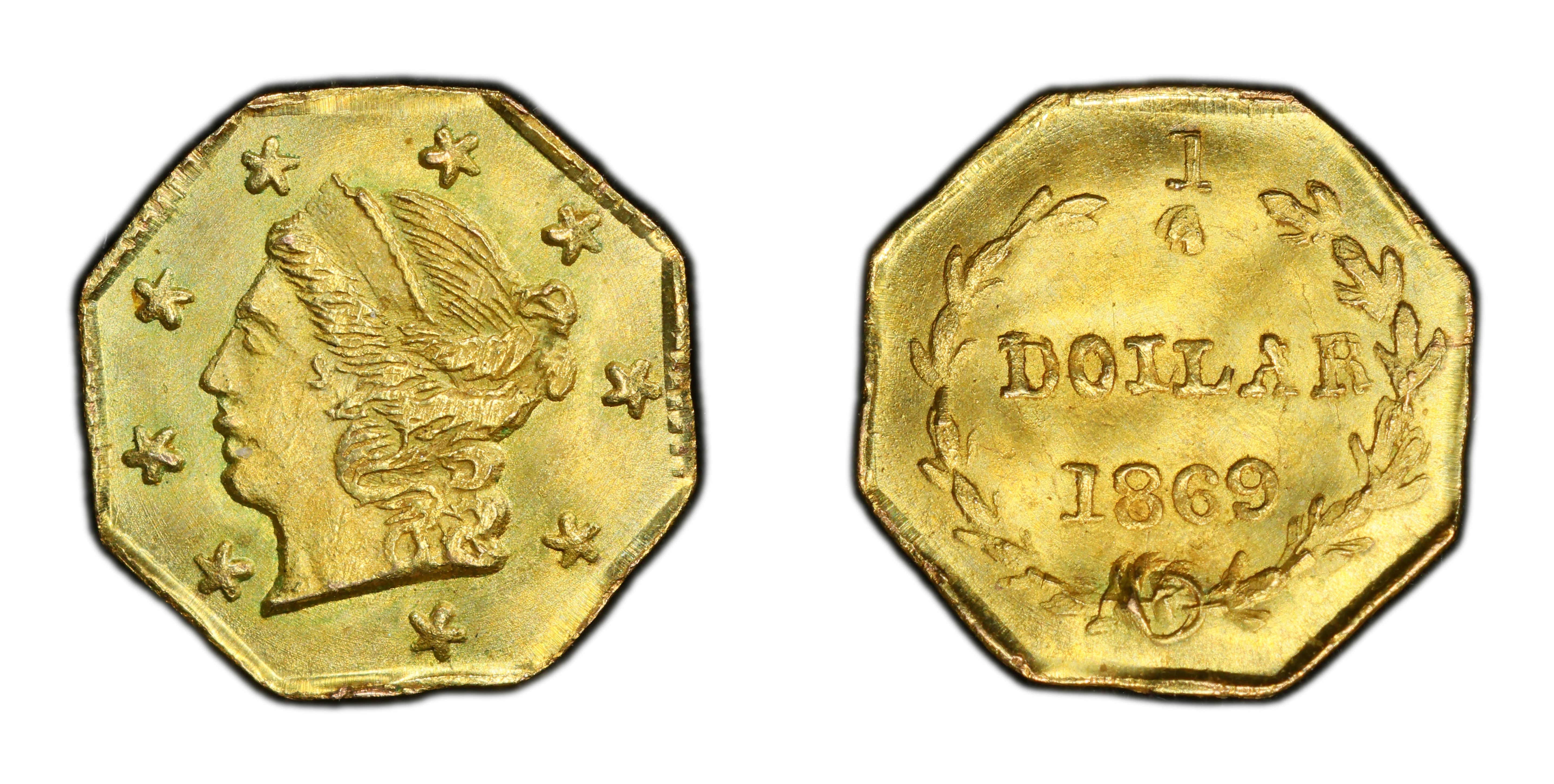 Obverse DescriptionOctagonal planchet. Features a Liberty Head design, facing left, inspired by the contemporary U.S. gold coinage of James B. Longacre. The portrait is surrounded by thirteen six-pointed stars, with the date '1869' positioned below the bust truncation.