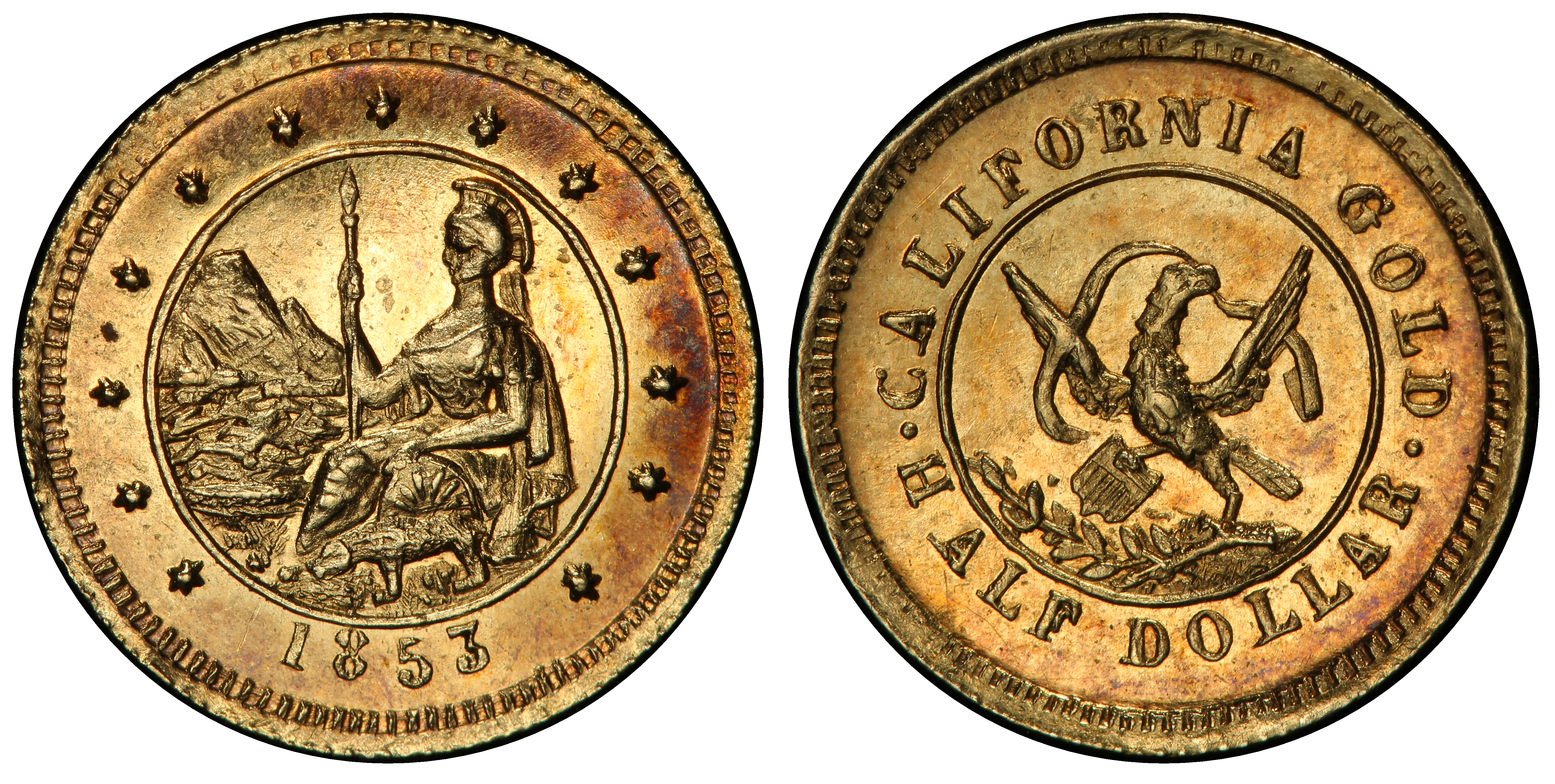 Obverse DescriptionThe obverse features a detailed depiction of the Arms of California. The Roman goddess Minerva, helmeted, is seated holding a spear and a shield emblazoned with a gorgon's head. At her feet to her right is a grizzly bear. In the background are mountains and a body of water with a ship. The scene is enclosed within a plain circle, surrounded by the date 1853 below and thirteen small, elongated stars above along the periphery.