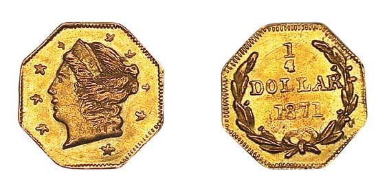 The 1871 25C BG-719 is a product of the second period (1859-1882) of California Fractional Gold production, a fascinating and complex chapter in American numismatics. Following the initial Gold Rush boom, California's economy continued to expand, yet it remained plagued by a chronic shortage of small denomination coinage for daily transactions. The U.S. Mint in San Francisco, established in 1854, primarily focused on larger gold and silver coins, leaving a vacuum for coins valued under a dollar. This void was filled by private minters, predominantly jewelers of French and German origin in San Francisco, who began striking diminutive gold quarter, half, and one-dollar pieces. Unlike the 'Period One' issues which were generally of good weight and intended to circulate widely, the 'Period Two' pieces, including BG-719, were often underweight relative to their face value and stylistically more diverse. They are often termed 'jeweler's issues' and their primary function evolved from filling a monetary need to serving as popular souvenirs and keepsakes for tourists and locals alike. The Act of 1864 had prohibited private coinage, but enforcement was lax, allowing these pieces to be produced until the early 1880s. The BG-719 variety, an octagonal Liberty Head quarter, is a testament to this continued production. Its extreme rarity today suggests a very small initial output, likely struck by a single jeweler using hand-cut dies and a screw press or hammer. These coins were not mass-produced; each was a semi-artisanal product. Their journey through time was perilous, with the vast majority being lost, damaged, or melted for their gold content, making any surviving example a precious link to post-Gold Rush California.