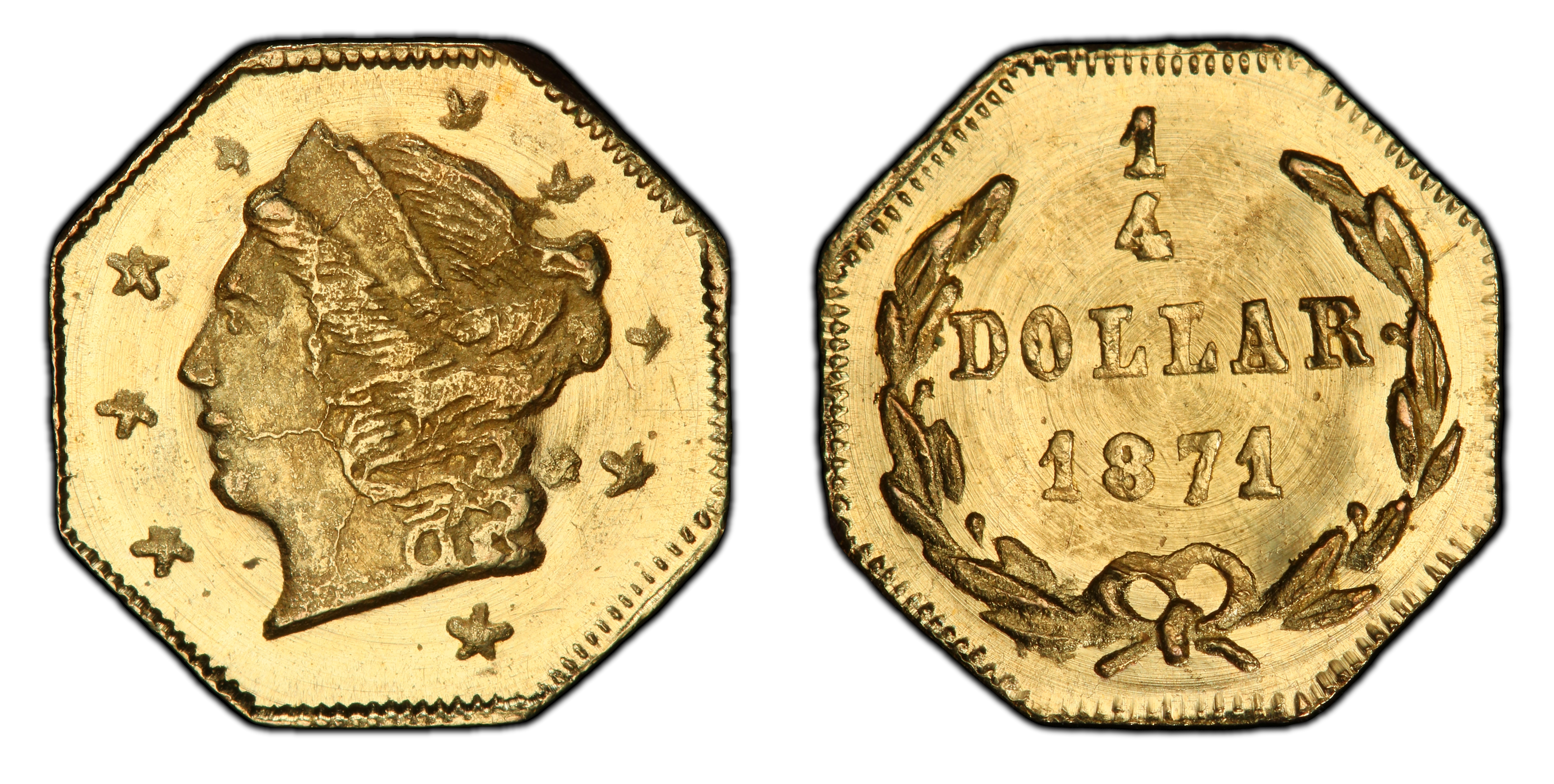 The 1871 BG-720 25 Cent piece belongs to the second major era of California Fractional Gold, commonly known to numismatists as 'Period Two' (1859-1882). Unlike their 'Period One' predecessors which arose from a genuine and acute shortage of small change during the initial Gold Rush frenzy, these later issues were created in a vastly different socio-economic landscape. By the 1870s, the United States Mint in San Francisco was in full operation, supplying the region with ample federal coinage and eliminating the commercial necessity for private issues. Furthermore, the Coinage Act of 1864 had explicitly outlawed the private minting of currency. However, this federal law was not aggressively enforced against small-scale producers until 1883. This legal gray area allowed a number of jewelers and artisans, primarily in San Francisco, to continue striking these miniature gold pieces. Their purpose had shifted dramatically: they were no longer indispensable tools of commerce but rather charming mementos and souvenirs for a burgeoning tourist trade and a growing class of collectors fascinated by the Gold Rush romance. Often termed 'jewelers' issues,' these pieces were typically underweight for their stated face value, their intrinsic worth being secondary to their appeal as novelties. The BG-720, struck in 1871, is a quintessential example of this phenomenon. It was created not to buy a loaf of bread, but to be tucked away in a pocketbook as a tangible, glittering reminder of California's golden promise. Its high rarity today (R-7) suggests an extremely small original production, likely hammered out in a small back-room workshop, intended for a niche market and never entering general circulation in any meaningful way. Its existence is a testament to the enduring allure of gold and the entrepreneurial spirit of craftsmen who capitalized on the legend of the Gold Rush long after its peak had passed.