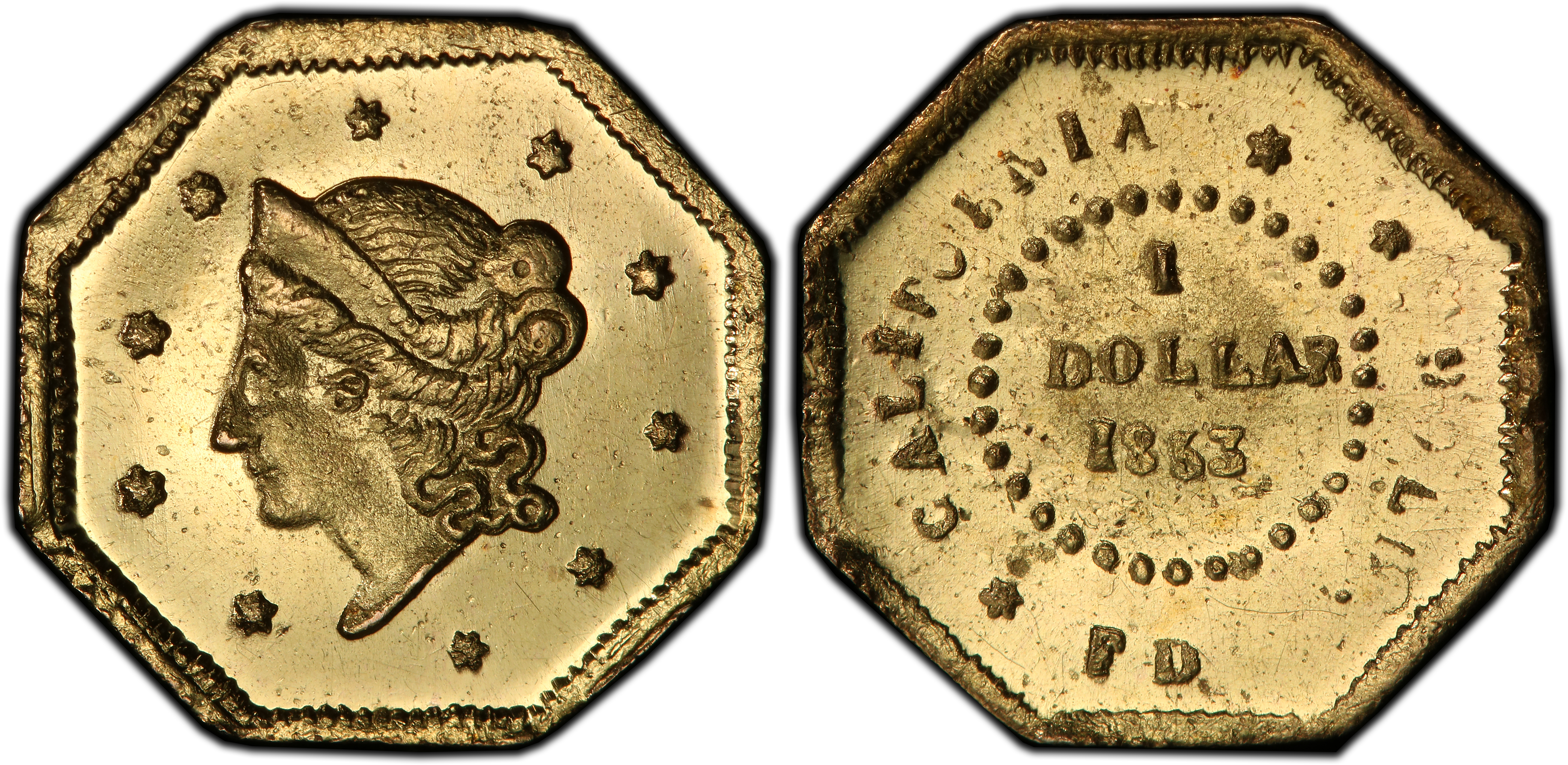 The BG-505 is prized as an authentic circulating issue from the height of the California Gold Rush. Its octagonal shape, clear date, and identified maker ('FD') make it a very popular type coin. It offers a direct connection to the tumultuous and romanticized history of the American West.