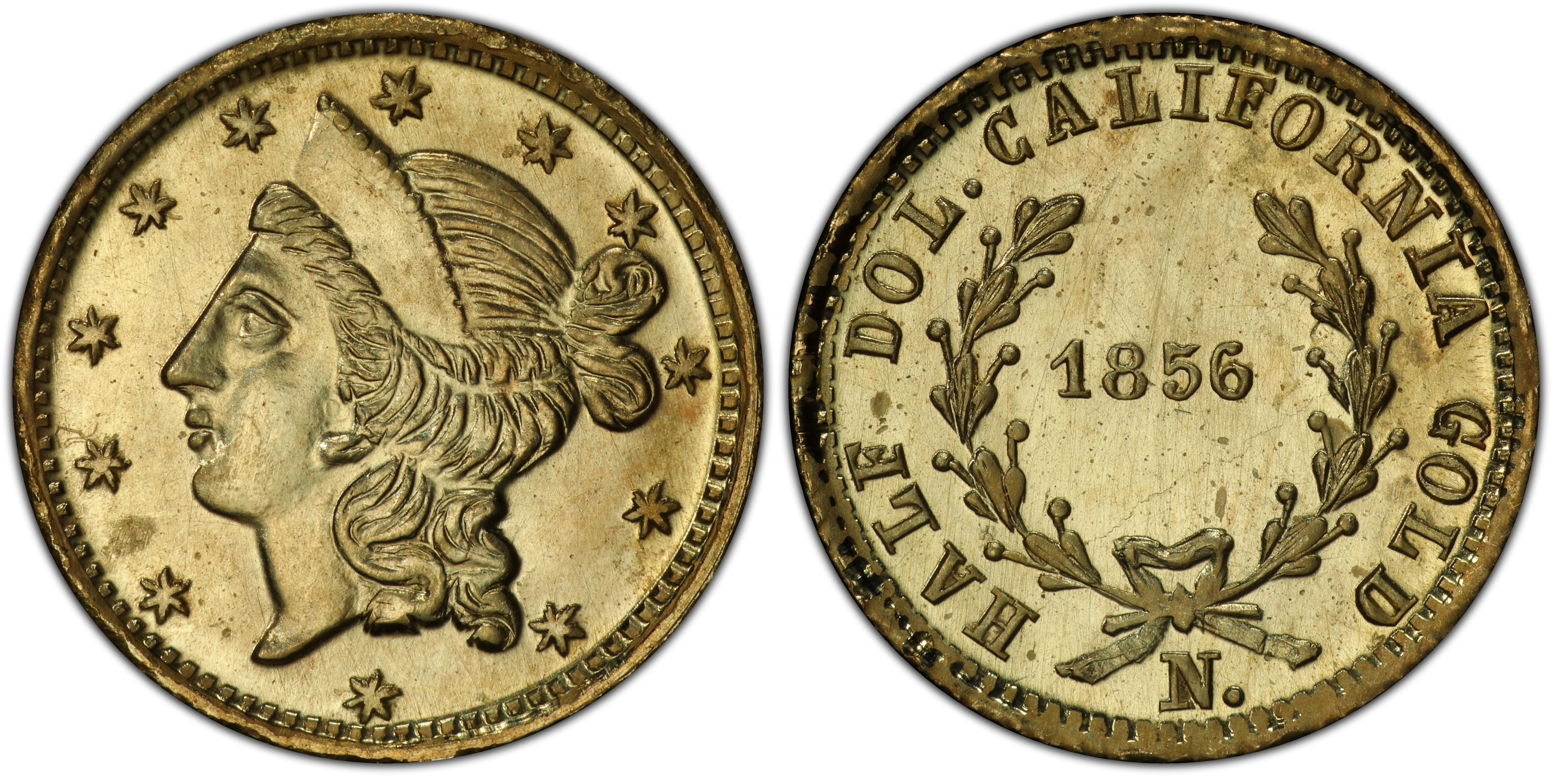 Obverse Inscription Reverse DescriptionThe date '1856' is centrally located within a wreath composed of two branches tied with a ribbon at the bottom. The inscription 'HALF DOL.' appears at the upper-left periphery and 'CALIFORNIA GOLD' is at the lower periphery, outside the wreath.