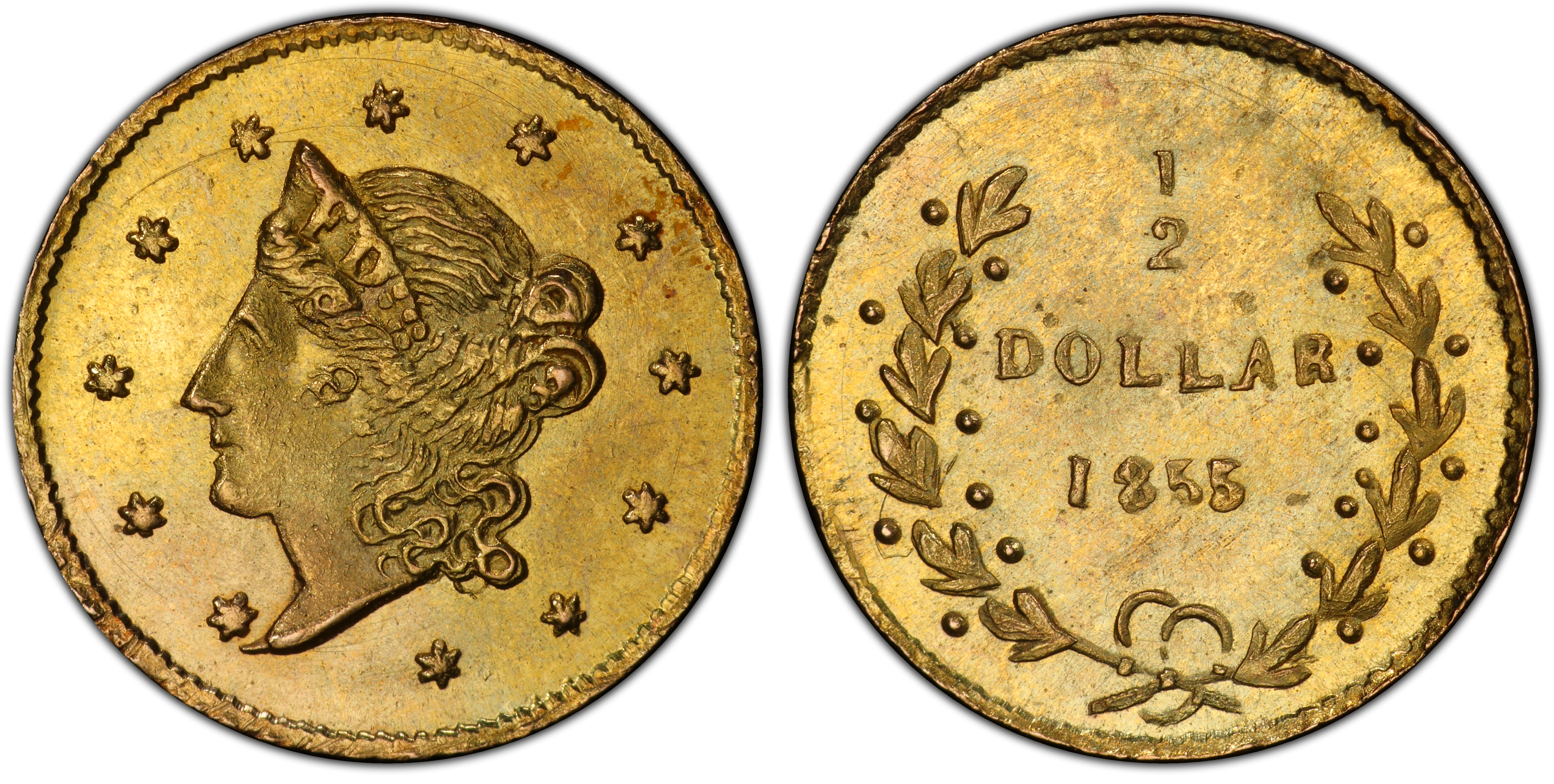 Obverse DescriptionA small Liberty Head facing left, similar in style to the U.S. Type 1 Gold Dollar. The portrait is surrounded by thirteen six-pointed stars arranged in an arc. The date '1855' appears below the bust.