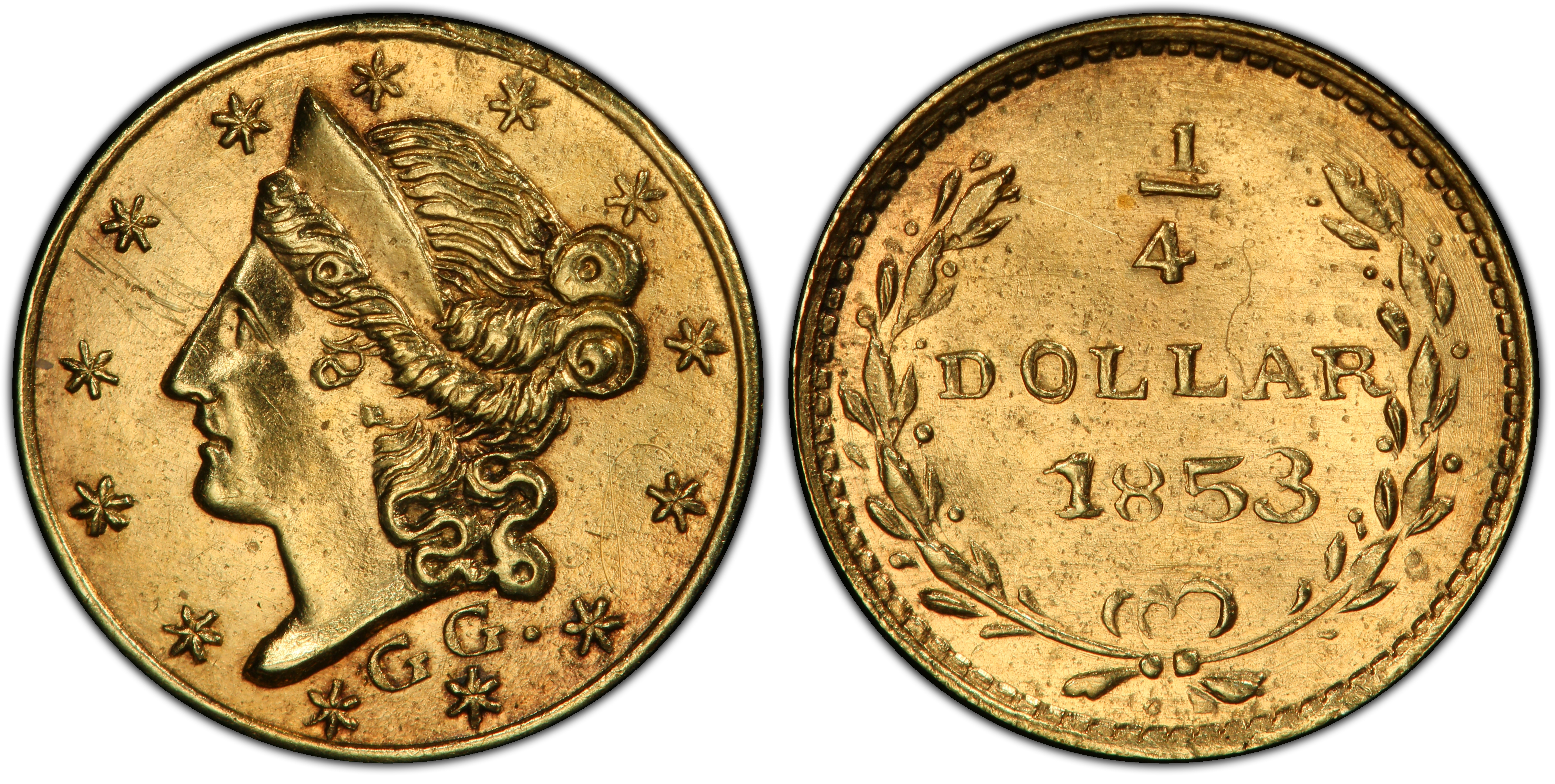 Authentication TipsAuthentication requires careful die analysis. 1) Verify the obverse die is the correct state shared with BG-217, with the distinctive 'GG' initials below the bust. 2) The reverse die is unique and must match known exemplars: the '1/4' fraction is noticeably misaligned and crudely executed, and the date '1853' is positioned low and shifted to the right. 3) Genuine Period One fractionals have a distinct fabric, often with weak or uneven strikes due to hammer or crude press production. Modern fakes are often sharply struck with uniform, lifeless surfaces. 4) The gold color should be consistent with native California gold, often a slightly lighter, greenish-gold or brassy-gold hue due to the natural silver alloy.