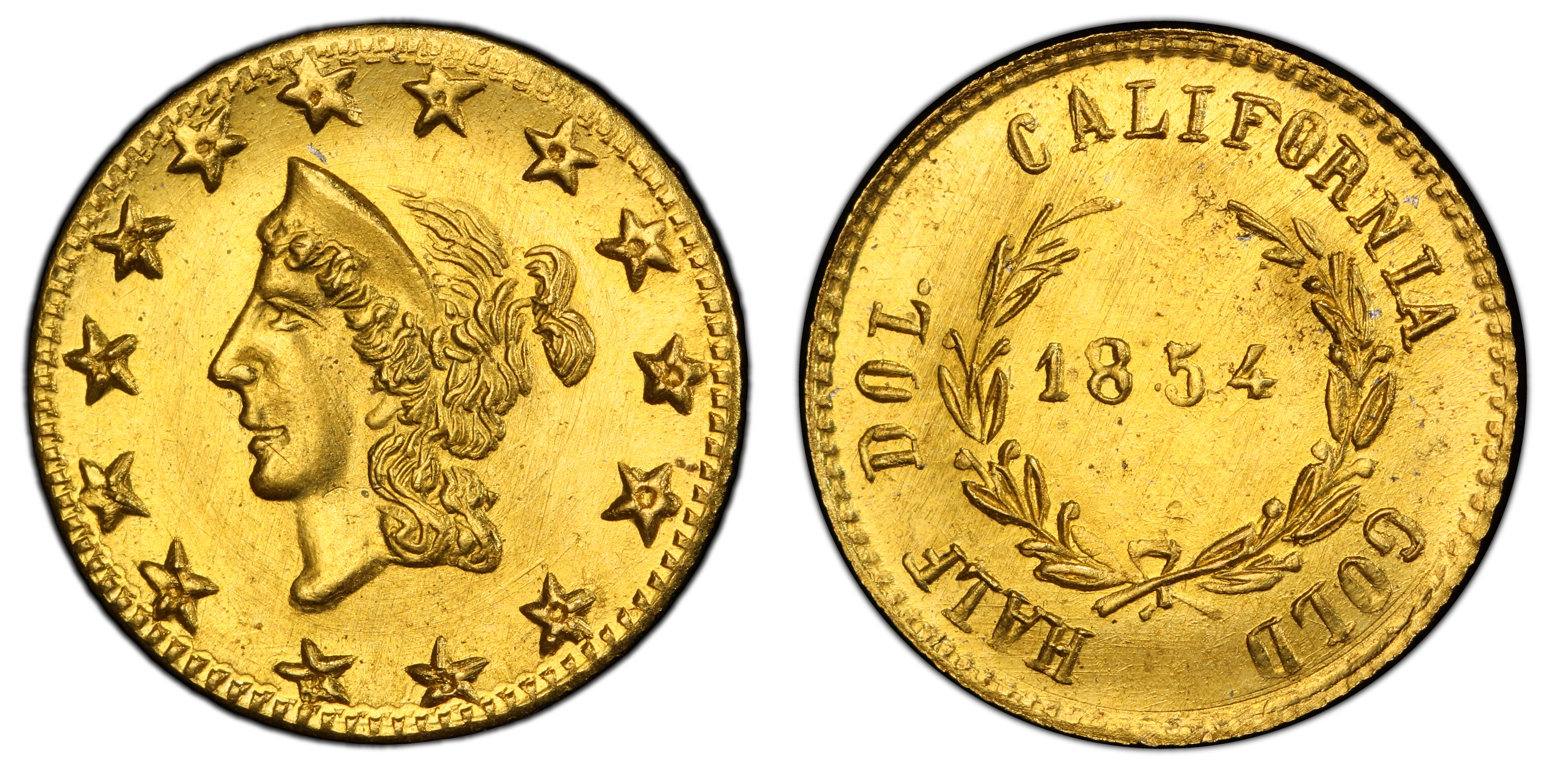 Reverse DescriptionThe reverse design is relatively simple, featuring the denomination '1/2' at the center, enclosed within a delicate wreath of two olive branches tied with a bow at the bottom. The legend 'CALIFORNIA GOLD' is inscribed above the wreath, and the date '1854' appears below it.