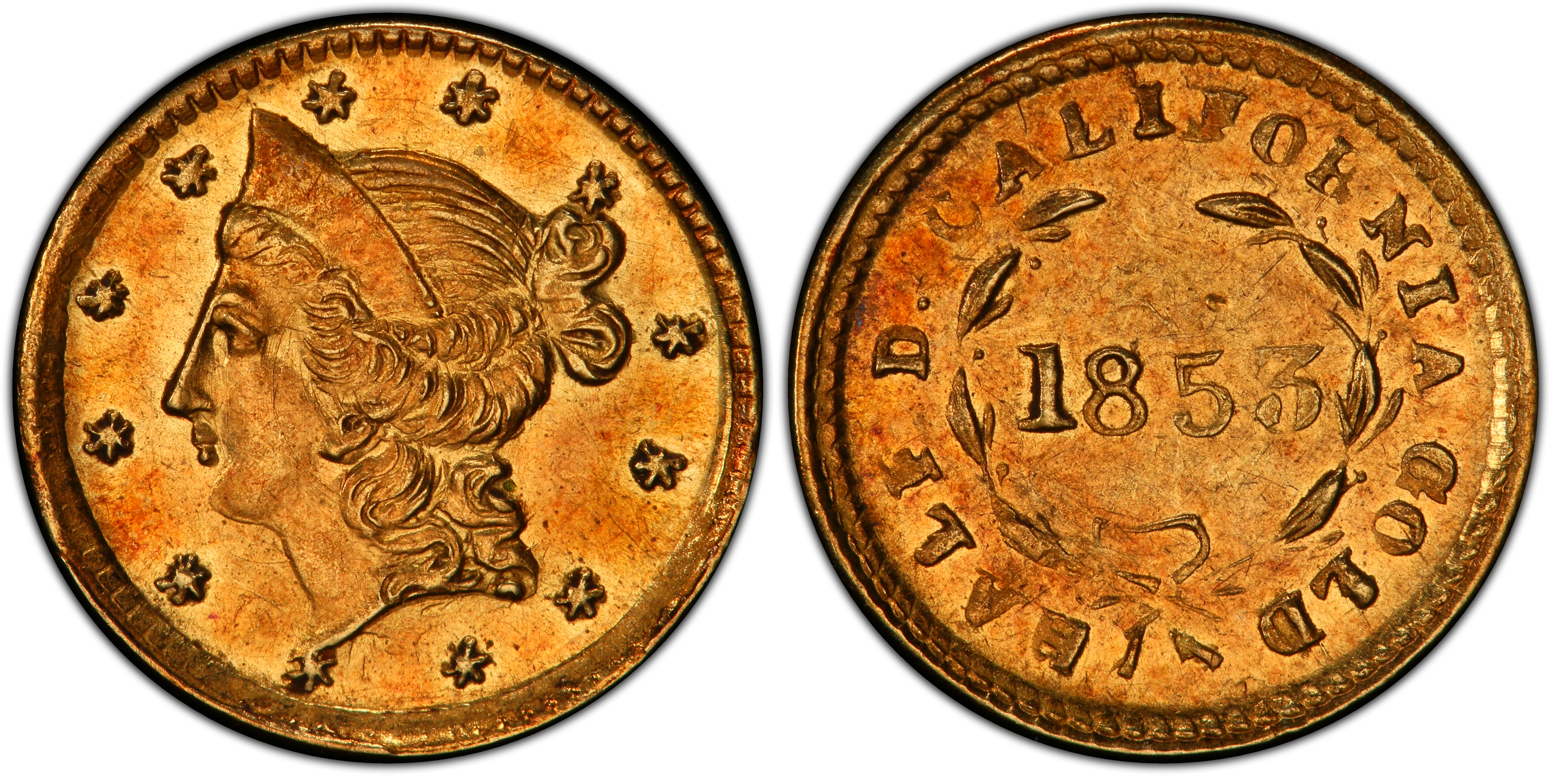 Obverse Inscription Reverse DescriptionThe reverse features the denomination '1/2' at the center, surrounded by an ornate wreath of two branches tied with a bow at the bottom. The legend 'CALIFORNIA GOLD' is inscribed around the upper periphery, and the date '1853' is below the wreath.
