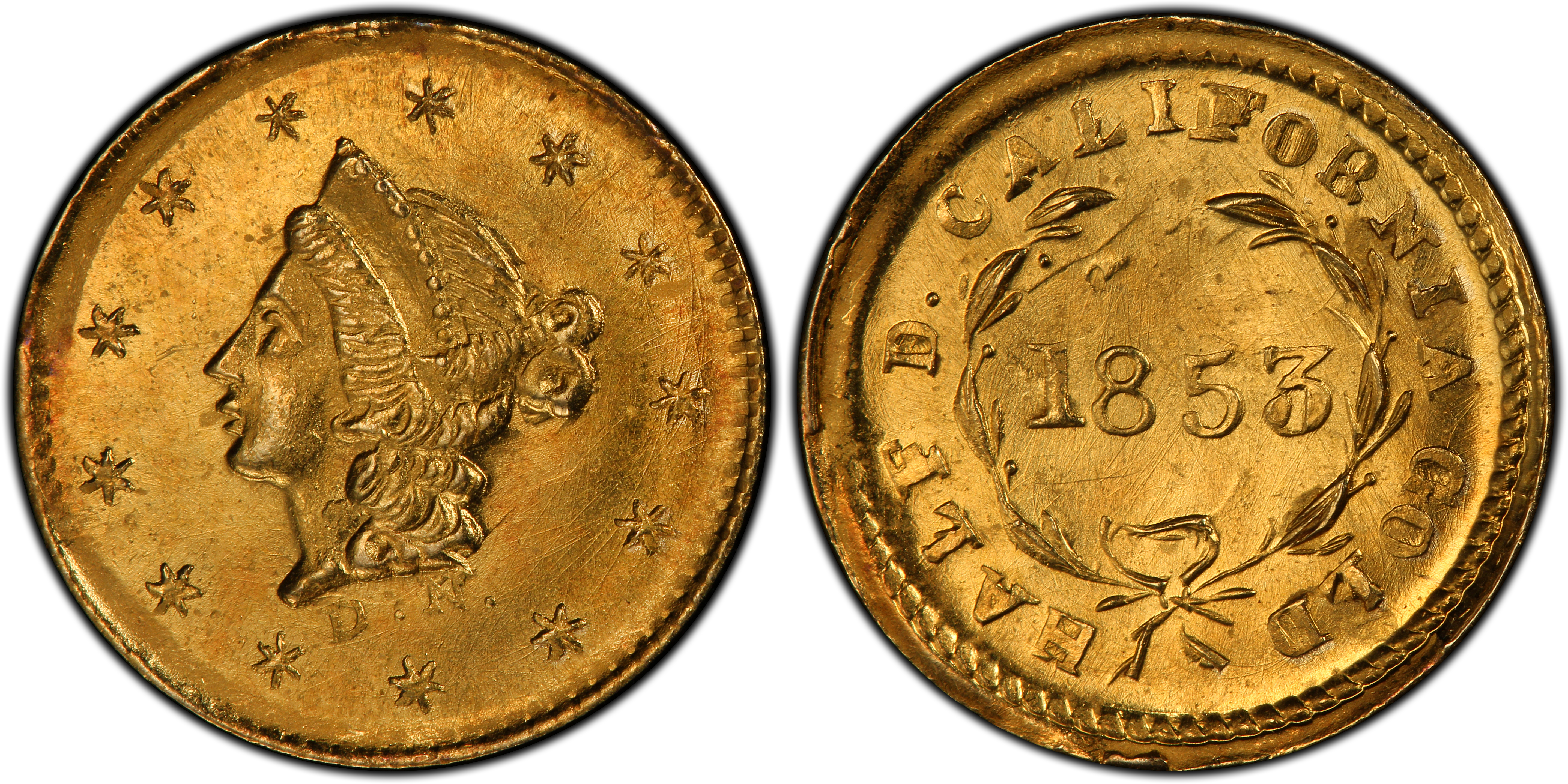 The 1853 BG-408 50 Cents piece is a quintessential artifact from the 'Period One' (1852-1857) era of California Fractional Gold. Its existence is a direct consequence of the unique economic conditions in California following the 1848 gold discovery. The massive influx of population during the Gold Rush created a vibrant, cash-based economy, yet the region was geographically isolated and suffered from a chronic shortage of official United States small-denomination coinage. While private minters and the U.S. Assay Office produced large denomination gold coins ($5 to $50) from the abundant local bullion, there was a severe lack of circulating coins for everyday transactions. A pinch of gold dust, the default medium of exchange, was imprecise and prone to waste. Into this void stepped enterprising jewelers and metalsmiths, primarily in San Francisco, who began striking their own fractional-denomination gold coins. The BG-408 was produced by the partnership of M. Deriberpe, an engraver, and Antoine Louis Nouizillet, a prominent French jeweler. Their 'D.N.' initials proudly stamped below the bust signify one of the few attributable makers of these early issues. These 'Period One' coins were intended for actual commerce and were generally designed to resemble the official U.S. gold dollar, as seen in the Liberty head motif of the BG-408. However, most were underweight for their stated value, making them technically tokens, but they were nonetheless accepted in trade out of sheer necessity. Production was crude by federal mint standards; coins were often hand-struck using a hammer method, resulting in inconsistent strike quality. By 1854, the new San Francisco Mint began to ramp up production of federal coinage, gradually alleviating the coin shortage. As a result, the commercial necessity for fractional gold waned, and by the late 1850s, their primary role shifted to that of souvenirs for tourists and keepsakes for those back East. The BG-408, as a rare R-6 variety, represents a tangible link to this brief, chaotic, and fascinating period of monetary improvisation on the American frontier.