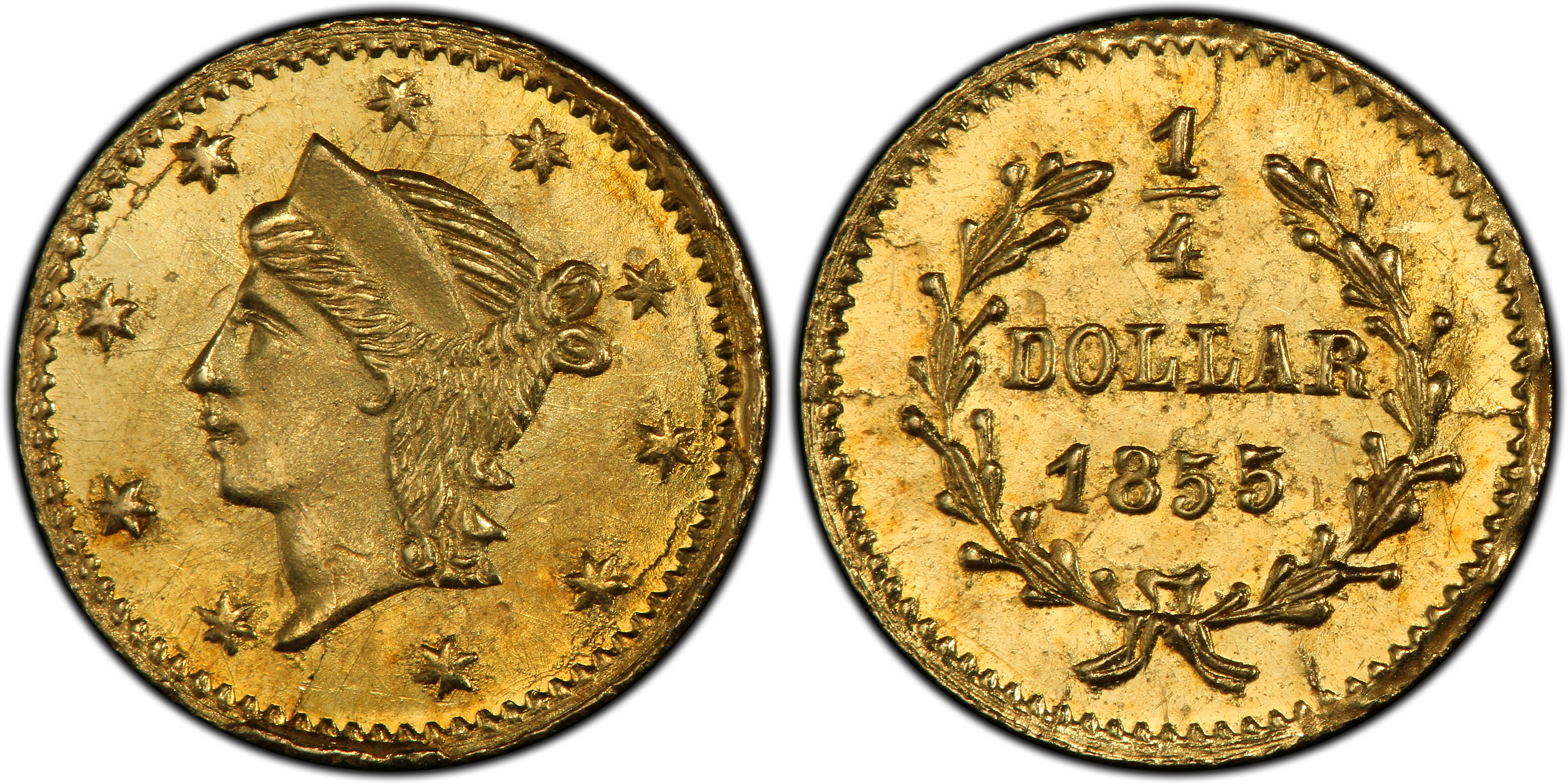The 1855 BG-225 25 Cents is a quintessential artifact from what numismatists classify as 'Period One' of the California Fractional Gold series. This initial period, from 1852 to 1857, represents the most authentic and utilitarian phase of this fascinating private coinage. Following the initial chaos of the Gold Rush that began in 1848, an immense quantity of gold dust and nuggets flooded the California economy, but a severe, chronic shortage of small denomination coinage created a significant impediment to daily commerce. A pinch of gold dust for a drink was an inexact and wasteful system. The newly established San Francisco Mint, which opened in 1854, focused its efforts on larger denomination coins, leaving the void in small change unfilled. Private jewelers and metalsmiths in San Francisco stepped in to meet this acute commercial need by striking their own fractional denomination gold coins. These tiny pieces, denominated in 25 Cents, 50 Cents, and One Dollar, were not legal tender but were widely accepted due to necessity. The BG-225 was struck in this environment of commercial improvisation. Most of these early issues were produced by the 'hammer method,' a crude process where dies were struck by hand with a sledgehammer, resulting in inconsistent strike quality. The BG-225 is particularly notable for its die state; the obverse die developed a catastrophic crack running from Liberty's ear to the rim, which severely limited its useful life and is a key reason for the variety's formidable rarity today. By the late 1850s, as the U.S. Mint increased its output of small change, the practical need for these fractional pieces diminished, and they transitioned from circulating currency to popular souvenirs and jewelry items in 'Period Two'. The BG-225, as a Period One issue, stands as a genuine monetary relic of the Gold Rush boomtown economy of San Francisco.