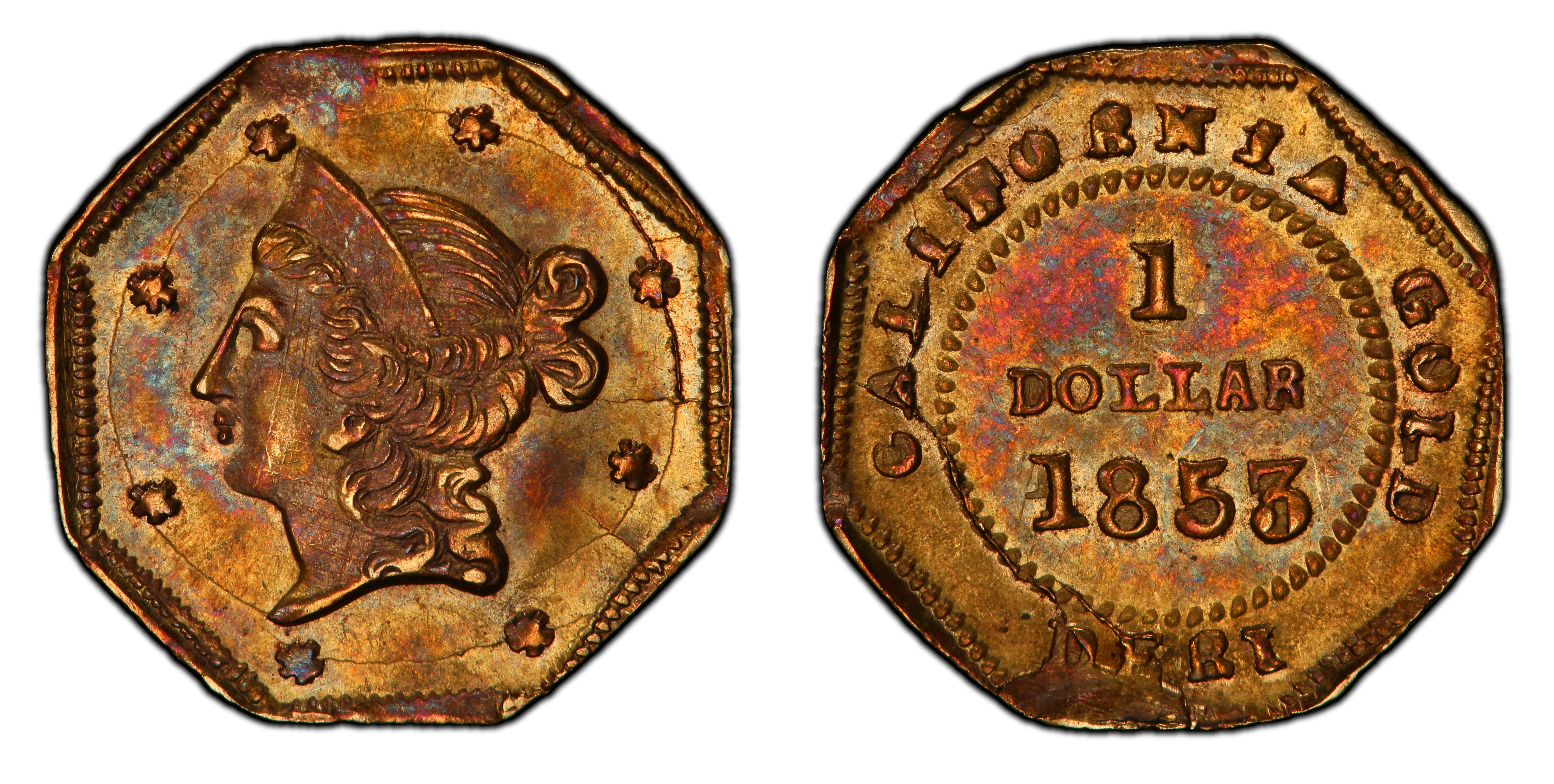 Obverse DescriptionOctagonal coin featuring a Liberty Head portrait, stylistically similar to the contemporary U.S. Mint gold dollars by James B. Longacre. The head is surrounded by thirteen stars along the border.