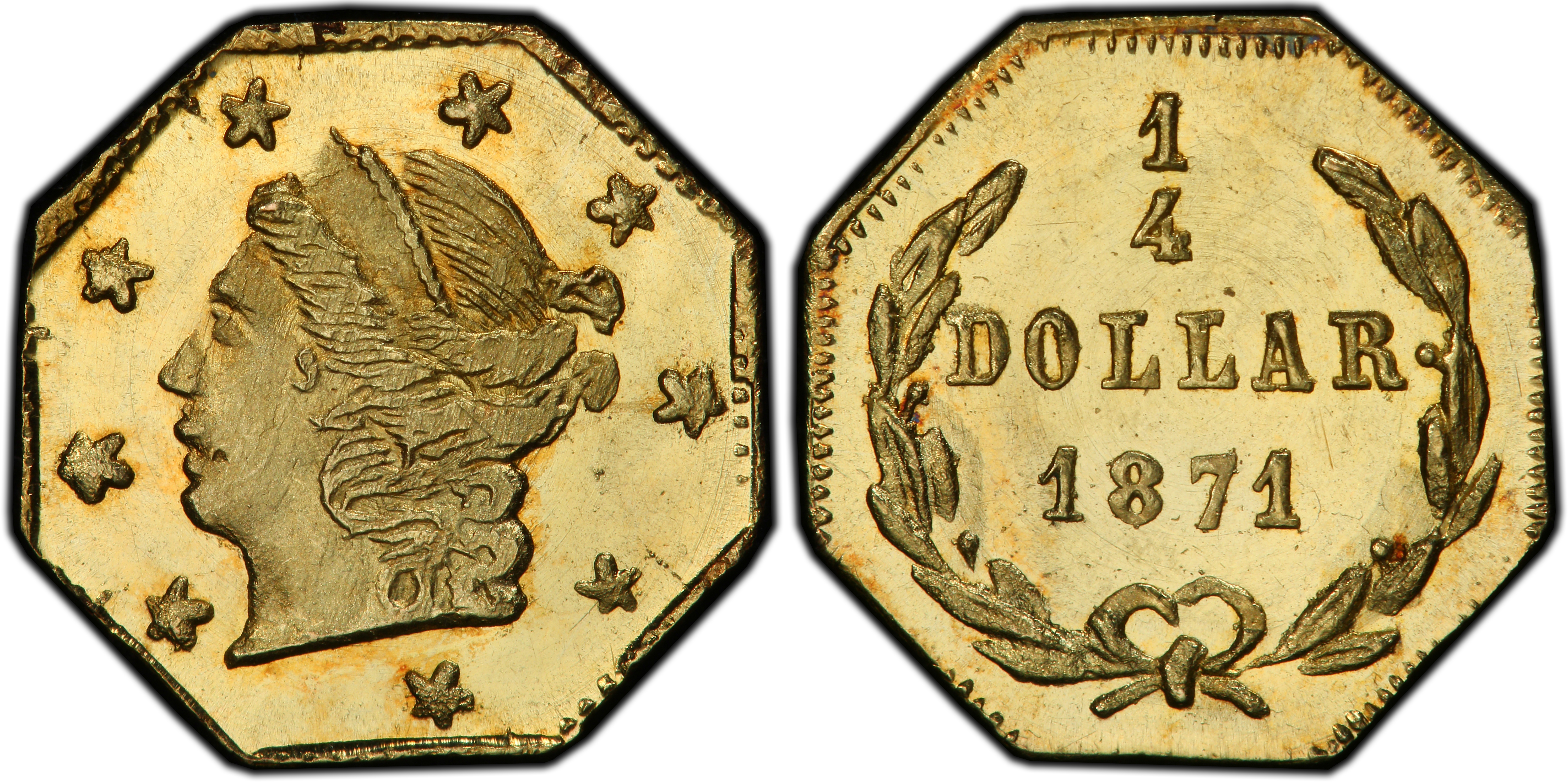 The 1871 BG-717 25 Cents token emerges from the second major phase of California Fractional Gold production (1859-1882). Unlike the initial 'Period One' issues, which were struck with a higher intrinsic value to genuinely alleviate the severe shortage of small change during the Gold Rush, these 'Period Two' pieces, often termed 'jeweler's issues,' had a more complex role. By the 1870s, the initial chaos of the Gold Rush had subsided, and the San Francisco Mint was in full operation, reducing the functional need for private coinage. However, local commerce, particularly for small transactions, still faced inconveniences. Simultaneously, California had become a destination, and a powerful sense of regional pride and romanticism about the '49er era was growing. Private minters, many of whom were jewelers of French origin, stepped into this dual market. They produced beautifully crafted, yet typically underweight, gold tokens that served both as occasional currency in a pinch and, more importantly, as popular souvenirs and keepsakes for tourists and residents alike. The Coinage Act of 1864 had officially prohibited private coinage, but enforcement on the remote West Coast was lax until the early 1880s, allowing this cottage industry to persist. These tiny gold pieces were tangible symbols of the state's immense gold wealth and the independent spirit of the frontier. The BG-717, with its distinctive Liberty head and octagonal shape, is a quintessential example of this later period, embodying the transition from a purely utilitarian private currency to a cherished numismatic and historical memento. Its existence reflects a unique chapter in American economic history where federally-issued money had not yet fully monopolized circulation, leaving a niche for these fascinating and historic private issues.