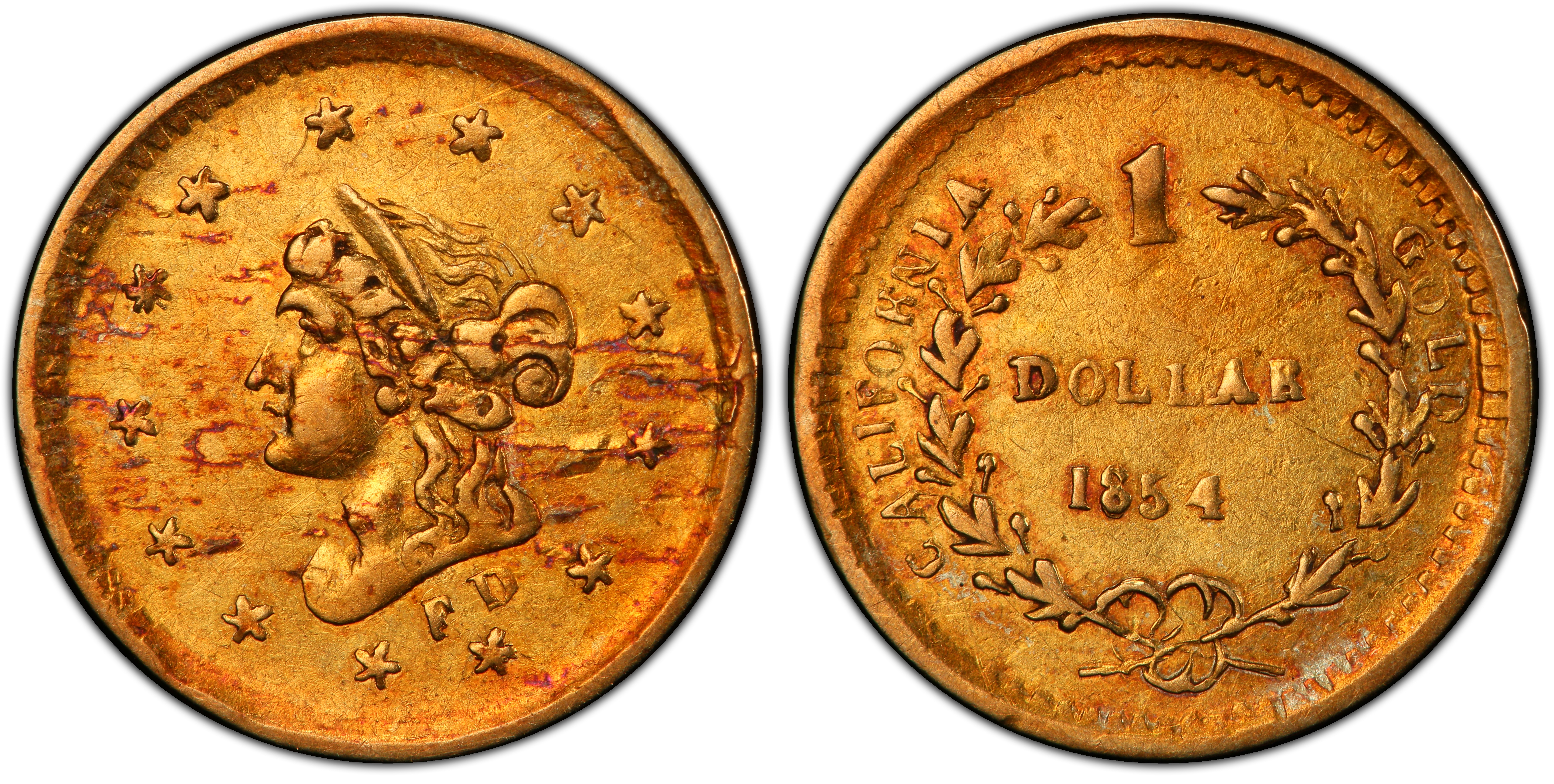 Authentication TipsGenuine examples typically exhibit a slightly crude, hand-struck appearance. The details, while perhaps soft, should be consistent with known examples. Look for the correct placement and style of the 'FD' initials below the bust. Counterfeits are common and may be cast, showing porosity and soapy details, or struck with incorrect letter and number punches. Weight and specific gravity tests are crucial, as many fakes are gold-plated brass. Comparison to high-resolution images of certified examples is essential.