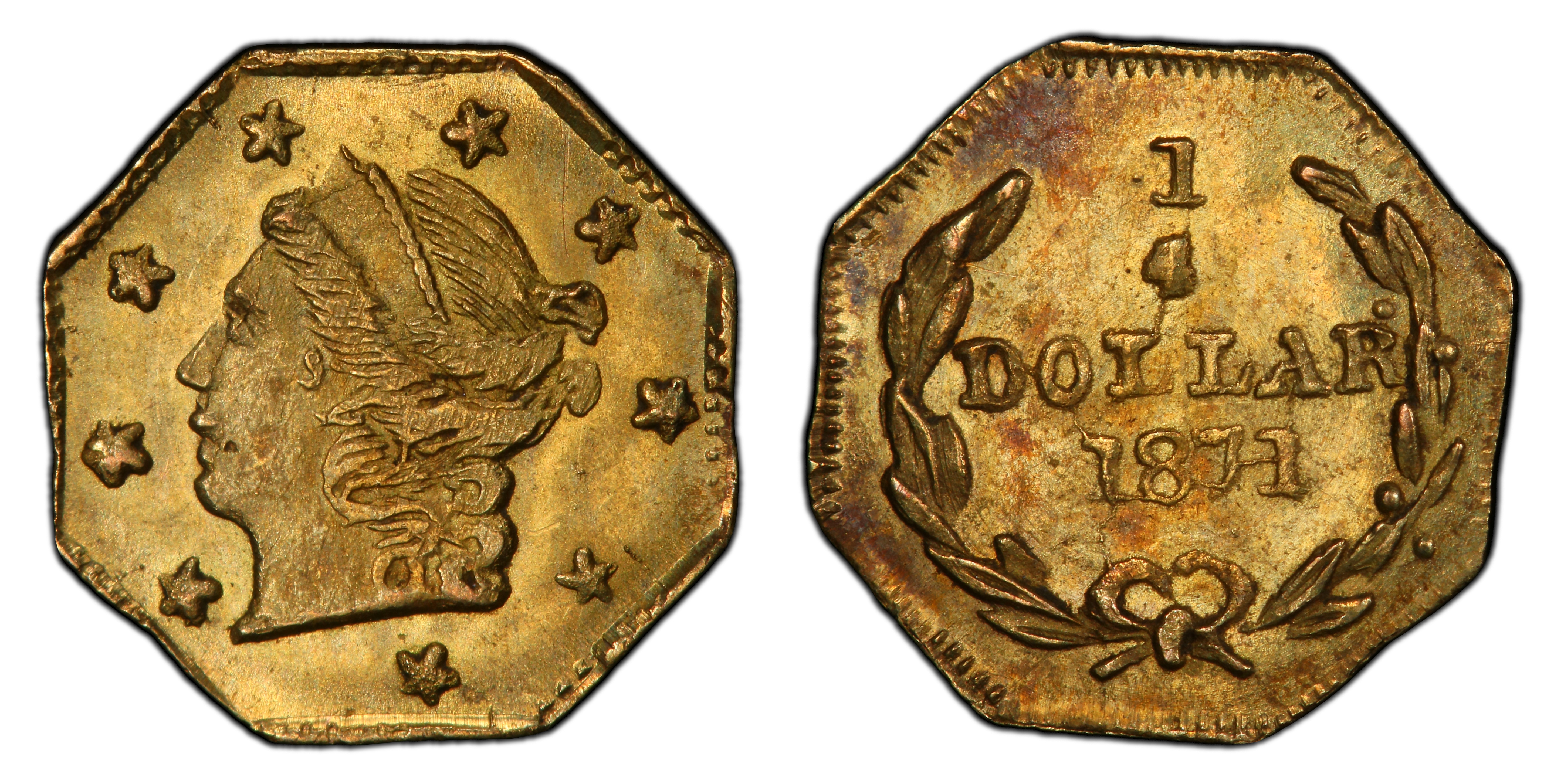 Obverse DescriptionA Liberty Head, facing left, with 13 stars surrounding the periphery. The portrait is in the style of the contemporary federal gold coinage but often rendered with less refinement. The date, 1871, is below the truncation of the neck.