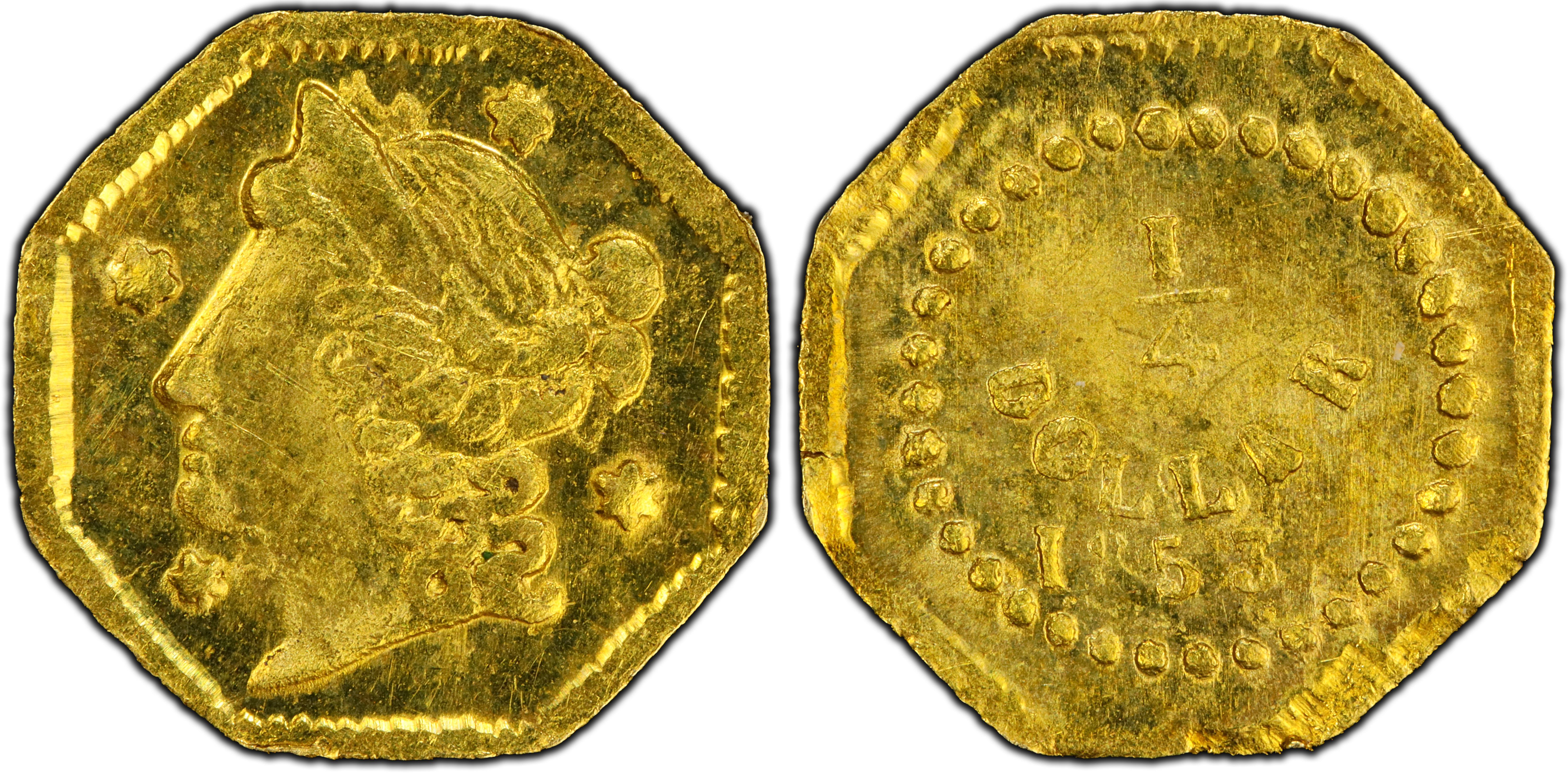 The 1853 BG-102 25 Cents represents a critical and fascinating chapter in American economic history, born from the chaotic yet vibrant crucible of the California Gold Rush. Following the discovery of gold at Sutter's Mill in 1848, a massive influx of prospectors and merchants descended upon California, ballooning the population and creating a dynamic, yet unstable, economy. While vast quantities of gold were being extracted, a severe shortage of circulating small-denomination coinage plagued daily commerce. Gold dust, weighed in 'pinches,' was an imprecise and cumbersome medium of exchange for minor transactions. Federal coinage was scarce on the West Coast, as the San Francisco Mint would not become fully operational until 1854. Into this void stepped a number of private jewelers and metallurgists in San Francisco, who began striking their own small-denomination gold coins in 1852 to facilitate trade. These 'California Fractional Gold' pieces, including the quarter dollar, half dollar, and dollar denominations, became an essential, if unofficial, part of the local monetary system. The BG-102 is a prime example of a 'Period One' (1852-1857) issue, a classification denoting the earliest pieces that were generally of honest weight and intended for genuine circulation. These were not tokens or souvenirs, but functional coins that traded hands in saloons, general stores, and among miners for everyday needs. The octagonal shape, reminiscent of the larger and highly respected $50 slugs produced by private assayers, likely lent an air of familiarity and trust. Although the exact attribution is not definitive, evidence points to the firm of Frontier, Deviercy & Co. as the likely producers of this variety. These French-emigre jewelers were among the most prolific minters of the era. The coins served their purpose until a sufficient supply of federal silver and gold coinage from the San Francisco Mint rendered them obsolete, after which most were melted, lost, or worn out in circulation, accounting for their present-day rarity.