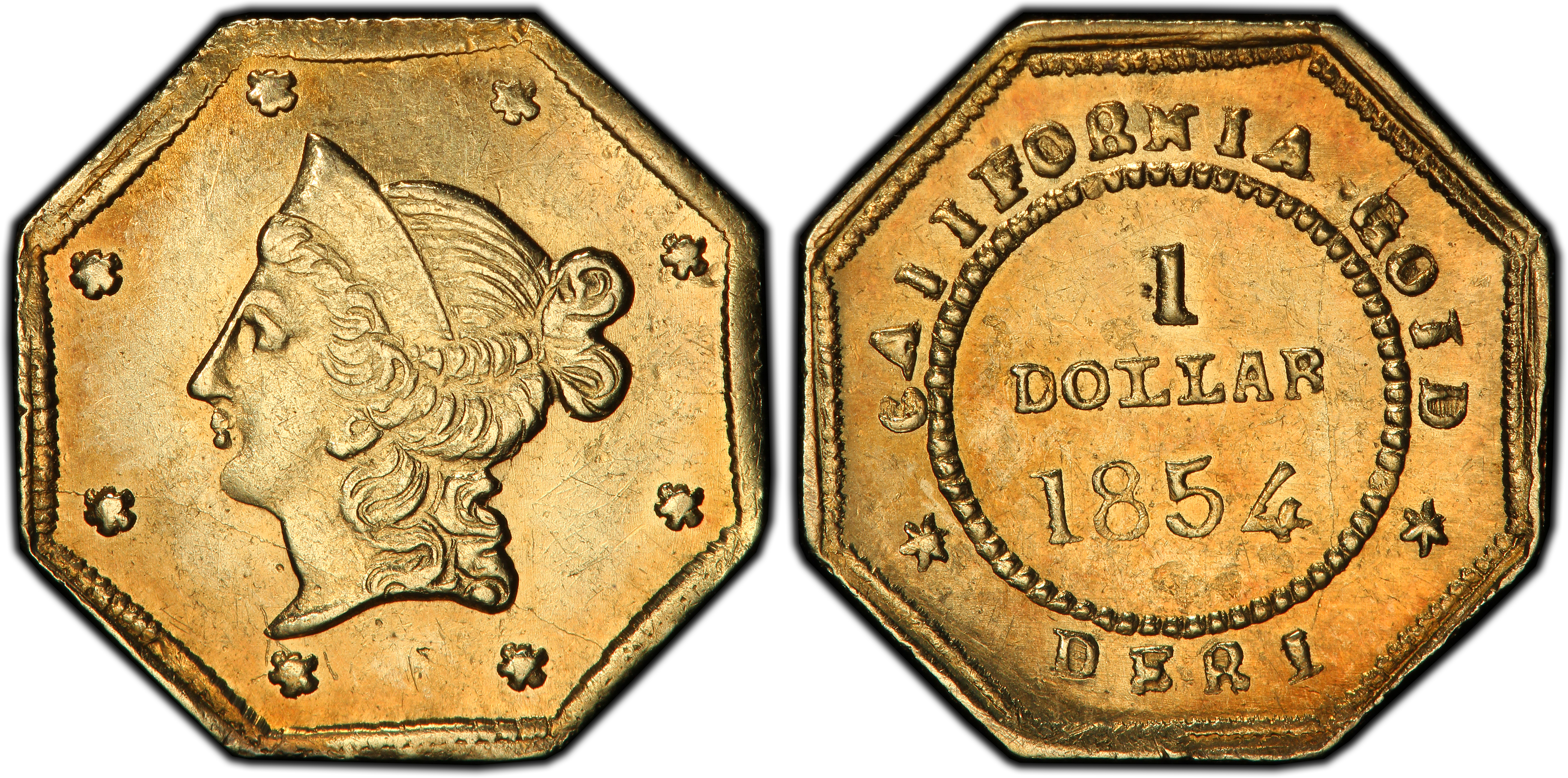 The 1854 Octagonal Gold Dollar, cataloged as Breen-Gillio 528, is a quintessential artifact from the chaotic and economically vibrant zenith of the California Gold Rush. By 1854, San Francisco was transforming from a frenetic boomtown into a burgeoning metropolis, yet its monetary system remained critically underdeveloped. The sheer volume of raw gold dust and large-denomination ingots pouring from the mines created an ironic and crippling shortage of small-denomination coinage for daily commerce. A shave, a meal, or a drink could not be easily purchased with a pinch of gold dust, a notoriously inaccurate and fraud-prone method of exchange. The newly opened San Francisco Mint, which began operations in April 1854, initially focused on producing larger gold coins and struck a mere 14,632 federal gold dollars that year, a quantity woefully insufficient to quench the region's thirst for circulating small change. Into this monetary vacuum stepped numerous private jewelers and metalworkers, many of French origin, who saw a lucrative opportunity. Among the most prolific was M. Deriberpie, who operated a jewelry business in San Francisco. Capitalizing on the demand, he produced a series of octagonal gold dollars, including the BG-528, which were intended to directly facilitate trade. These 'Period One' fractionals were not government-sanctioned but were tolerated out of sheer necessity. They were crudely but effectively manufactured, likely by the hammer-striking method, where dies were struck by hand onto gold planchets. This process resulted in inconsistent strike quality, with peripheral details often weak. The gold content of these pieces was also notoriously inconsistent and almost always below their stated face value, a fact that eventually led to public distrust and their disappearance from circulation once federal coinage became plentiful. Recent numismatic research based on die states has revealed that Deriberpie's 1854-dated dollars were struck in a sequence different from their catalog numbers, with variety BG-529 being struck before BG-527 and BG-528. This suggests a rapid production pace, with dies failing and being replaced as needed. The BG-528 represents one of the final octagonal dollar varieties from this maker, a testament to a brief but vital chapter of private enterprise solving a public need before the federal government could fully assert its monetary authority on the West Coast.