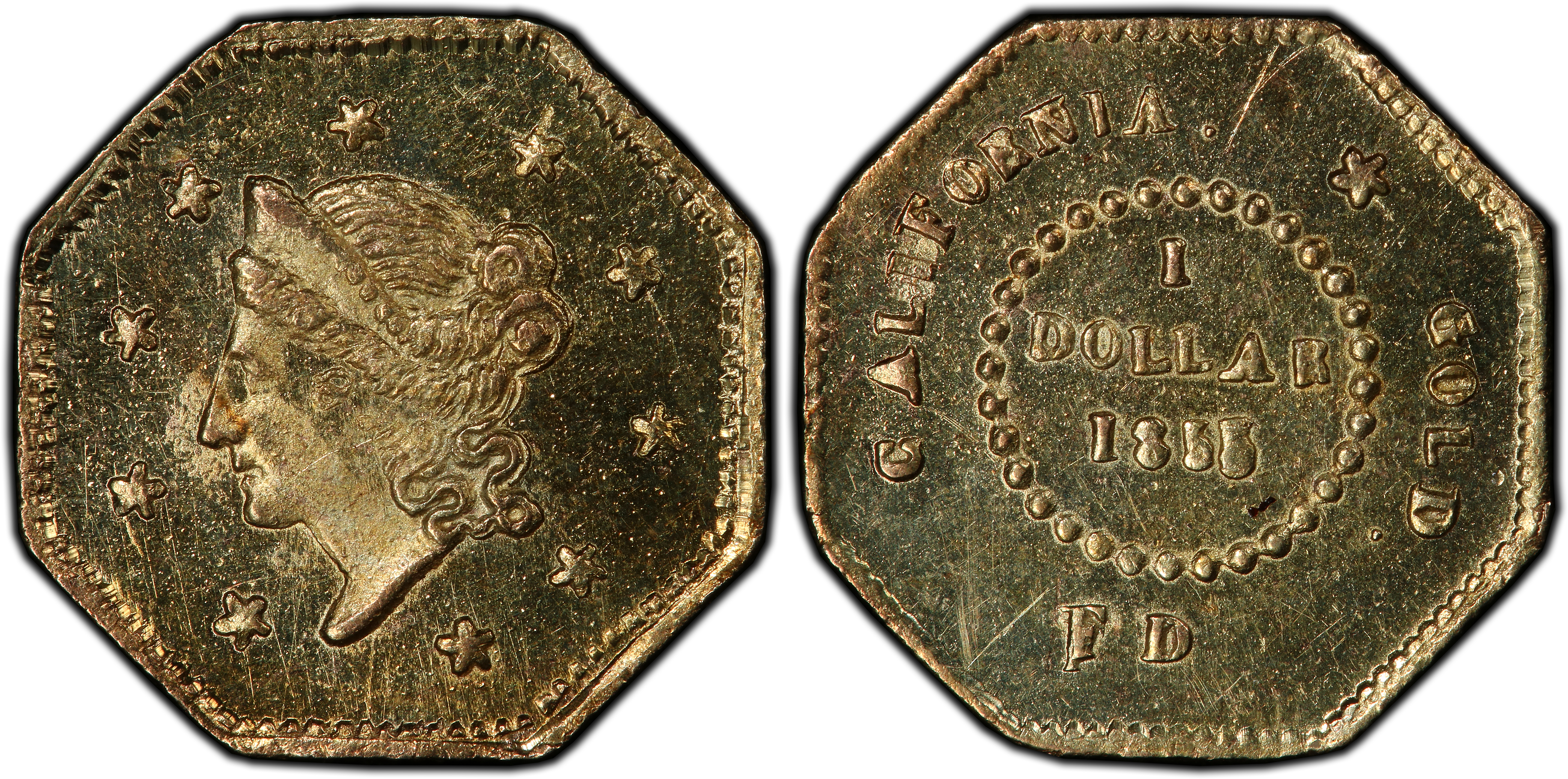 This coin is highly sought after as a genuine 'Period One' circulating issue from a known maker, Frontier & Deviercy. The octagonal shape, clear overdate (5 over 4), and direct connection to the peak of the Gold Rush make it a cornerstone piece for specialists in territorial and fractional gold.