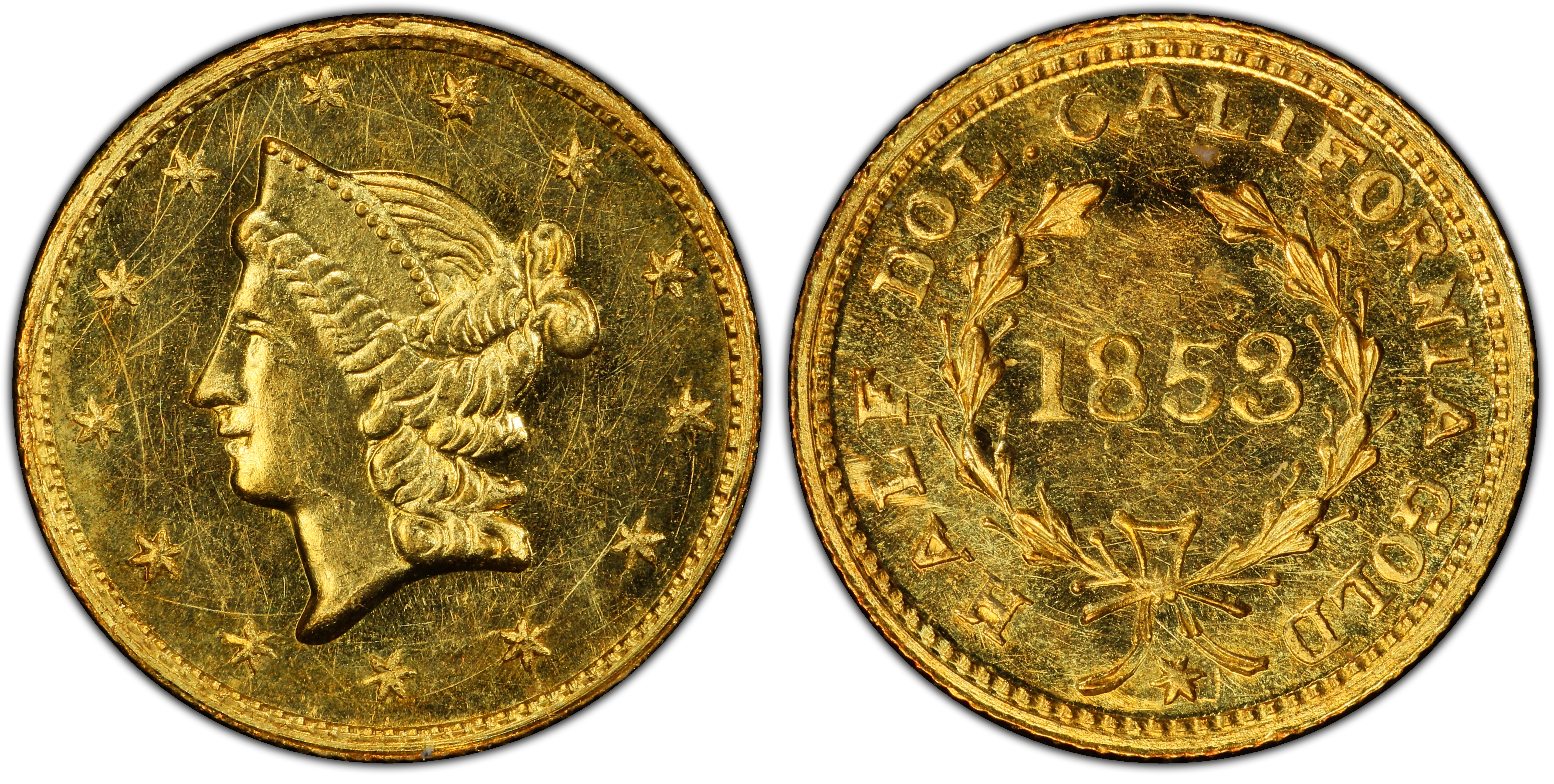 The 1853 Fifty Cents, cataloged as Breen-Gillio 429, stands as a tangible relic from the chaotic and economically volatile heart of the California Gold Rush. Following the discovery of gold at Sutter's Mill in 1848, a massive wave of over 300,000 fortune-seekers descended upon California. This unprecedented influx of population created booming cities like San Francisco virtually overnight, but it also generated a severe, crippling shortage of small-denomination coinage. With the nearest U.S. Mint in Philadelphia—a perilous and months-long journey away—and private assayers focused on converting raw dust into large-denomination ingots and coins ($5 and up), daily commerce was grinding to a halt. Transactions for simple goods and services were often conducted with a 'pinch' of gold dust, an inaccurate and contentious system ripe for dispute. Into this monetary vacuum stepped a number of enterprising jewelers and metallurgists, who saw both a public need and a business opportunity. One such figure was Antoine Nouizillet, a French jeweler operating in San Francisco. Between 1852 and 1856, a period numismatists classify as 'Period One' of California Fractional Gold, these private minters produced fractional-denomination gold coins—25 cents, 50 cents, and dollars—that were intended for and saw actual circulation. The BG-429 is a prime example of these necessary and widely used coins. Struck from native California gold, which characteristically contained a high percentage of silver, these pieces were often slightly underweight compared to their federal counterparts but were accepted in trade out of sheer necessity. Their existence was a direct rebuke to the federal government's inability to service the new West Coast economy. These tiny gold pieces circulated freely until the San Francisco Mint, which opened in 1854, finally ramped up production of sufficient federal coinage by 1856-1857, rendering the private issues obsolete. The BG-429's survival in any grade is a testament to its journey through the pockets and purses of Gold Rush pioneers.