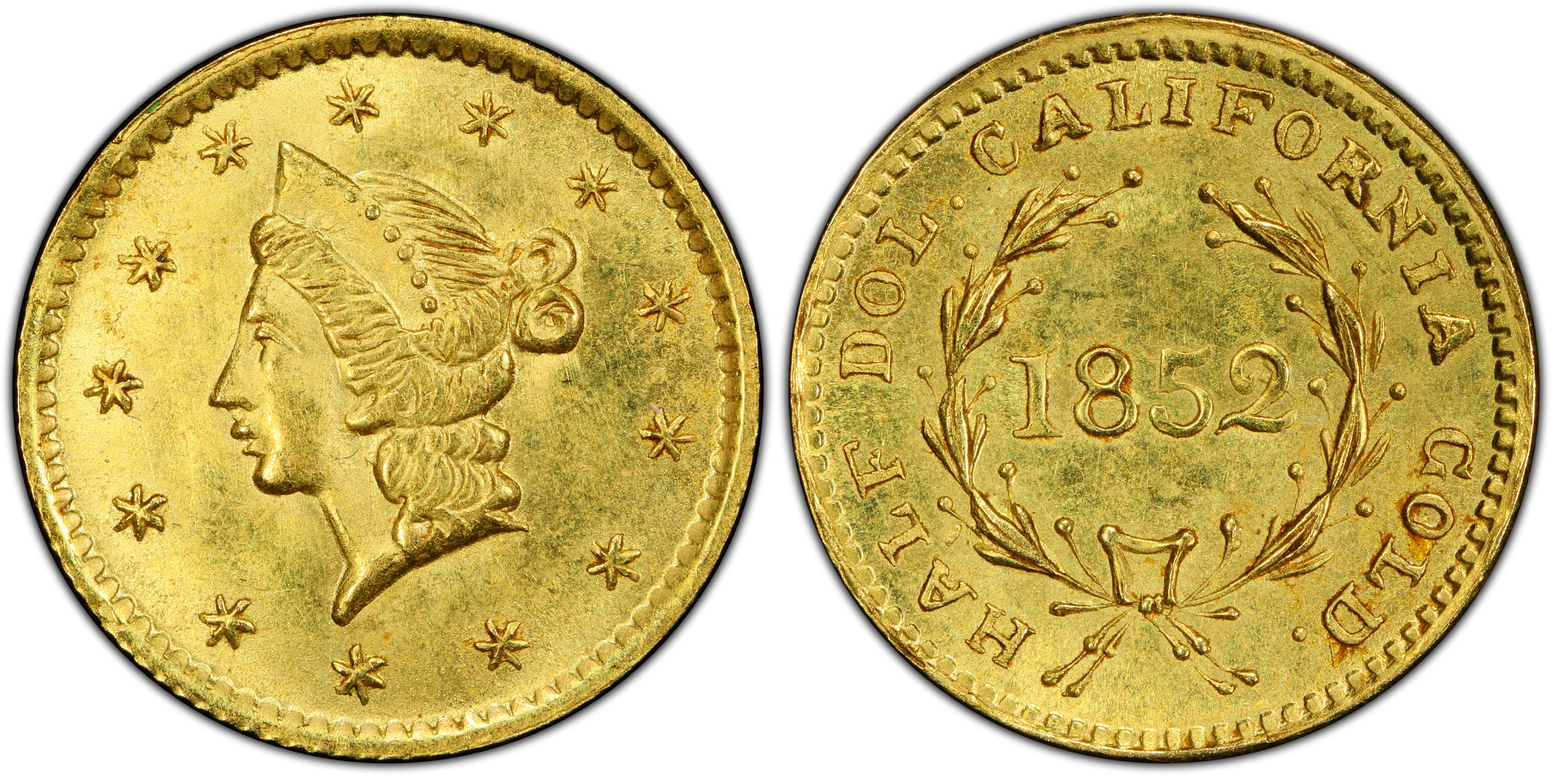 The 1852 'Arms of California' Gold Half Dollar, cataloged as Breen-Gillio 401 (BG-401), stands as a tangible relic of the chaotic and dynamic early years of the California Gold Rush. Following the discovery of gold at Sutter's Mill in 1848, a massive influx of prospectors and merchants descended upon California, creating a vibrant but unstable economy. The fundamental problem was a severe shortage of circulating coinage. Gold dust and nuggets served as the primary medium of exchange, but this was inefficient, prone to waste, and susceptible to fraud. The U.S. government was slow to establish an official branch mint in the West (the San Francisco Mint would not open until 1854), creating a vacuum that private minters eagerly filled. These private issues, ranging from assay bars to denominated coins, provided a crucial service by converting raw gold into a more uniform and convenient form of money. Amidst this flurry of private coinage, a need arose for small-denomination coins to facilitate everyday transactions, as even the smallest federal coin, the silver three-cent piece, was scarce. Into this environment came the jewelers and engravers who produced California Fractional Gold. These tiny coins, in denominations of 25 cents, 50 cents, and one dollar, were not sanctioned by the government but were widely accepted out of sheer necessity. The BG-401 is one of the earliest of these issues, struck in the pivotal year of 1852. While the identity of the minter is not definitively proven, numismatic scholarship, particularly the research of Robert D. Leonard, Jr. and Walter Breen, strongly points to Antoine Louis Nouizillet, a French-born jeweler and engraver working in San Francisco. Nouizillet's style, particularly the crudely rendered yet charming design elements, links this piece to others of the period. The coin itself, with its depiction of the California State Seal, was a bold assertion of local identity and economic independence. These coins circulated freely in commerce, though their intrinsic value was often slightly less than their face value, a common trait of private issues. Their small size made them easy to lose, a factor contributing to their modern-day rarity. The era of private gold coinage began to wane with the opening of the San Francisco Mint, and federal laws in 1864 further curtailed their production, cementing their status as a fascinating but short-lived chapter in American monetary history.