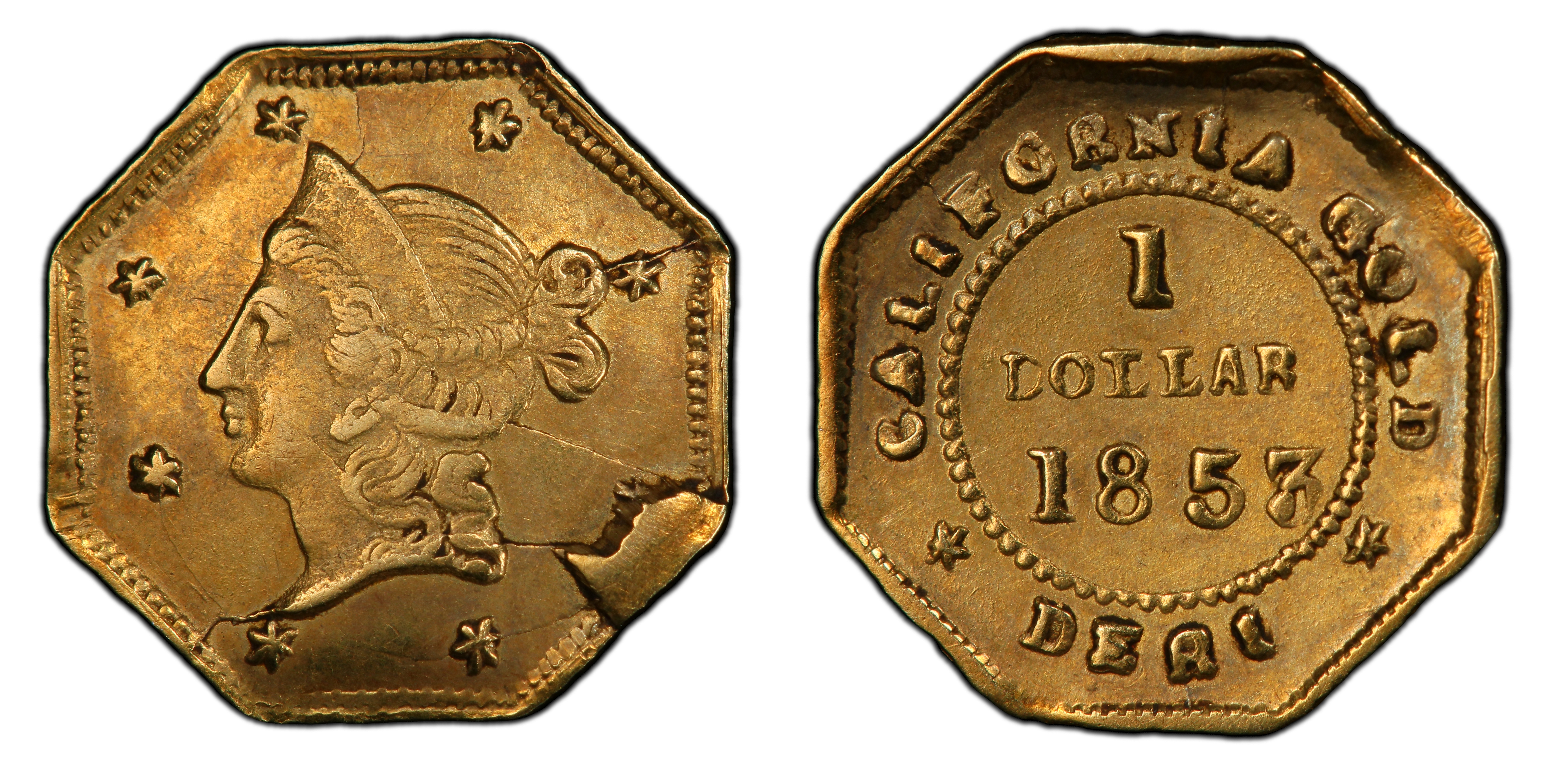 The 1853 BG-523 octagonal gold dollar is a tangible relic from the zenith of the California Gold Rush, a period of frantic economic expansion and acute monetary chaos. Following the discovery of gold at Sutter's Mill in 1848, a massive influx of prospectors and merchants descended upon California, creating booming commercial centers virtually overnight. This rapid growth, however, was not matched by an adequate supply of federal coinage. Gold dust, a cumbersome and often inequitable medium of exchange, initially filled the void, but its use was fraught with issues of inconsistent weight and purity. The U.S. government was slow to respond; the San Francisco Mint would not open until 1854, and even then, its initial output of small denomination coins was woefully insufficient. Into this monetary vacuum stepped a number of enterprising private jewelers and assayers. Operating in San Francisco, these craftsmen began striking their own small-denomination gold coins to facilitate everyday transactions. The BG-523 is a prime example of these 'Period One' issues (1852-1857), which are distinguished from the later, souvenir-oriented 'Period Two' pieces by their genuine intent to circulate as currency. The minter, M. Deriberpe, was one of several French jewelers active in San Francisco who applied their skills to this new trade. These fractional pieces, though often slightly underweight, were readily accepted in commerce, serving as the lifeblood of the region's economy for several years. They were typically produced by the 'hammer method,' where a gold planchet was placed between two dies on an anvil and struck with a sledgehammer, a process accounting for the frequent variations in strike quality. The passage of the private coinage act in 1864 eventually rendered these issues illegal, and most were subsequently melted. The few that survive, like the BG-523, are prized by numismatists not just for their rarity, but as direct links to the turbulent and inventive economy of Gold Rush California.