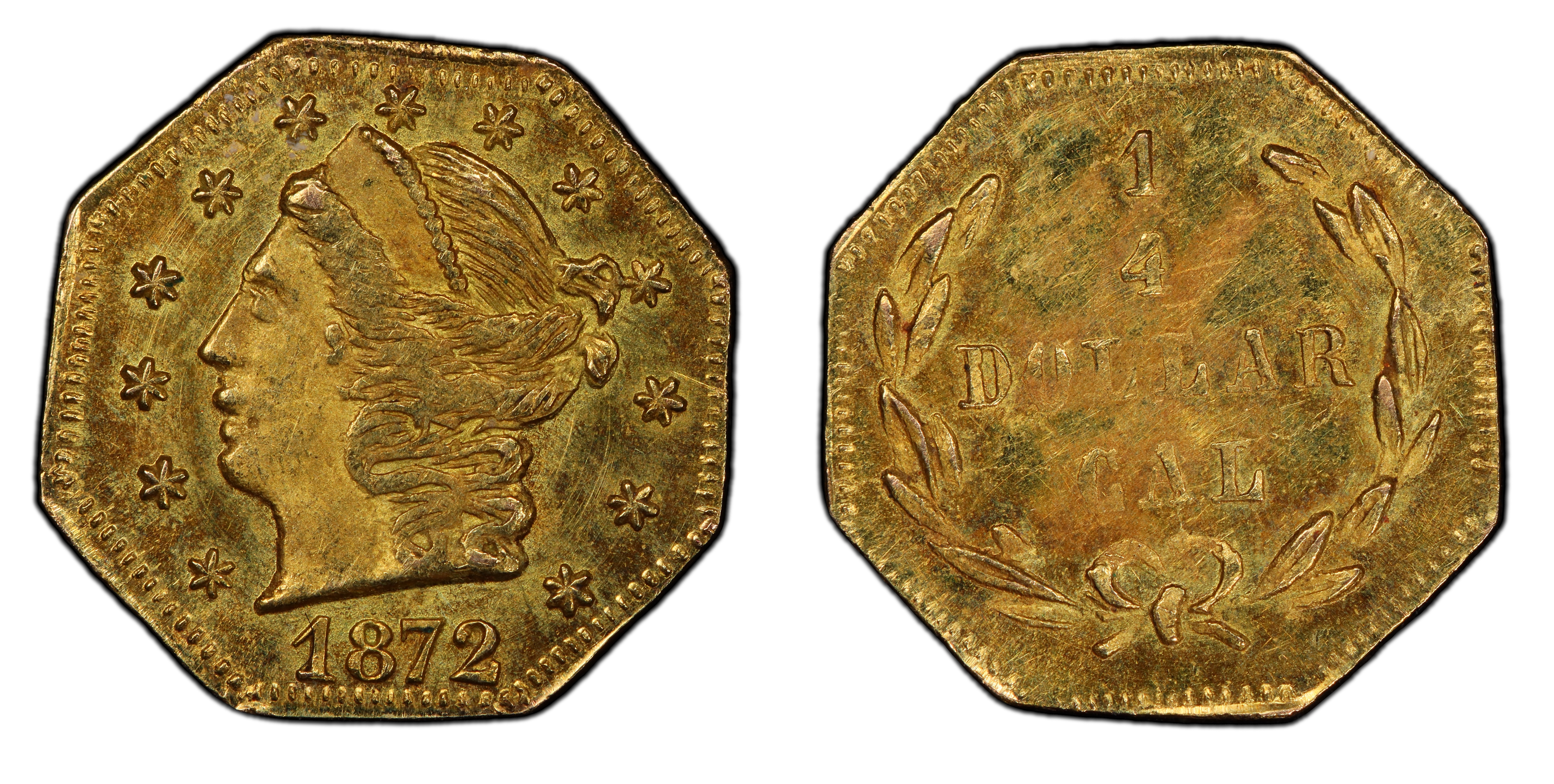 The 1872 25-cent BG-725 is a product of the second great period of California Fractional Gold production (1858-1882). Unlike the initial 'Period One' issues (1852-1857), which were struck out of a genuine commercial need to alleviate a severe shortage of small-denomination coinage during the Gold Rush, these later pieces were created primarily as souvenirs and keepsakes. By the 1870s, the San Francisco Mint was in full operation, and the acute need for private coinage had subsided. Instead, local jewelers capitalized on the romantic allure of the Gold Rush, producing these miniature gold coins for tourists, merchants, and collectors back East. The BG-725, dated 1872, falls squarely into this era of nostalgia-driven production. These pieces were often struck with less regard for intrinsic value, with gold content varying and sometimes being significantly less than their face value would imply. They were manufactured using the 'hammer method,' where dies were struck by hand, leading to significant variations in strike quality. The passage of the Private Coinage Act of 1864 made such private issues illegal, but the law was not strictly enforced in California until a Secret Service crackdown in 1883, allowing jewelers to continue their profitable souvenir trade for nearly two decades. The BG-725 is a tangible artifact from this fascinating gray area of American numismatic history, representing a transition from utilitarian necessity money to a commercialized memento of the Wild West.