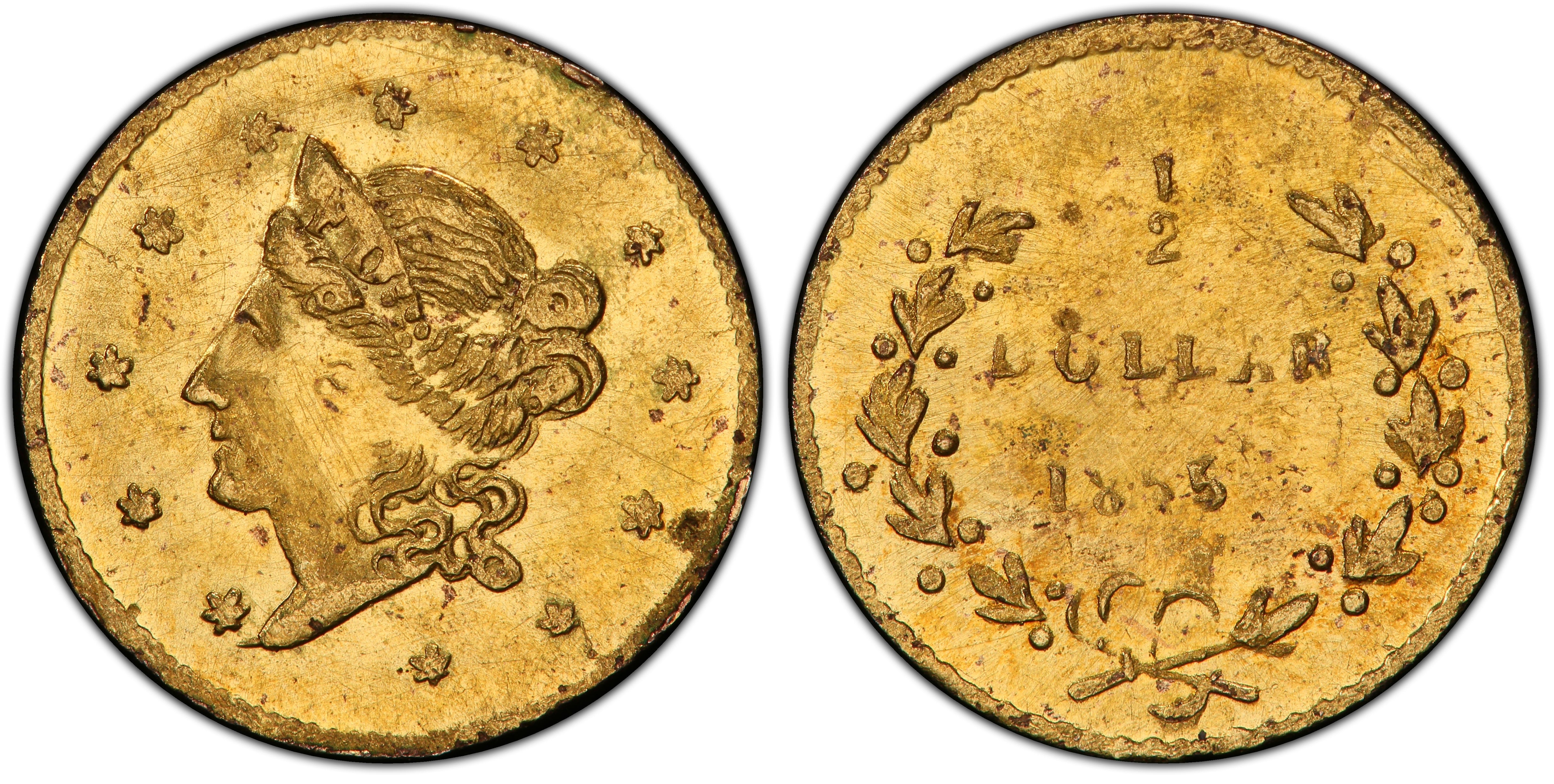 Reverse DescriptionA wreath composed of two branches tied by a bow at the bottom. The inscription is arranged within the wreath, with 'HALF' at the top, 'DOL.' below it, and the legend 'CALIFORNIA GOLD' around the periphery, outside the wreath.