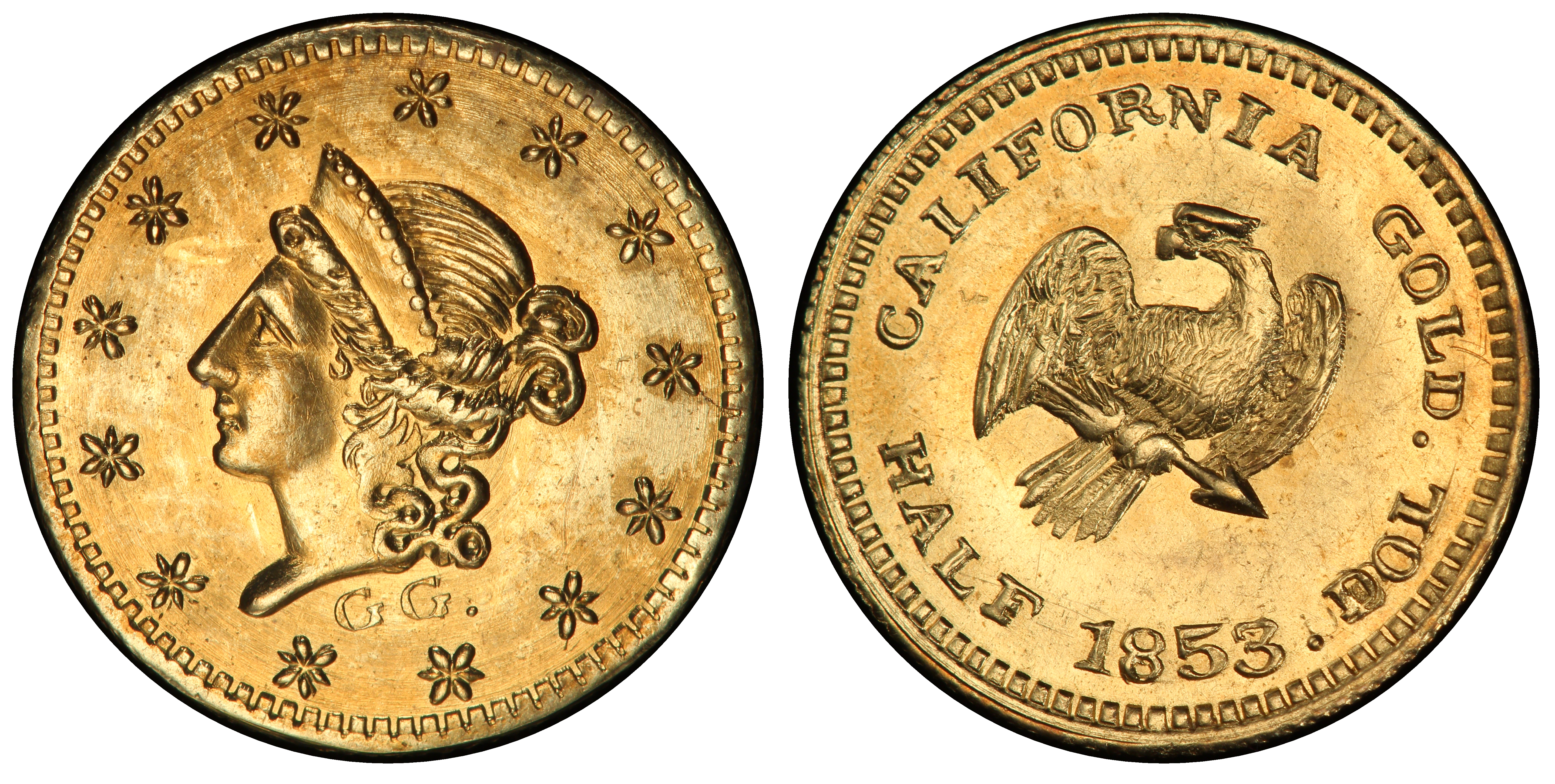 The 1853 Gold 50 Cents, cataloged as Breen-Gillio 411, is a quintessential artifact from the first period of private coinage during the California Gold Rush. Following the discovery of gold at Sutter's Mill in 1848, a massive influx of prospectors and merchants descended upon California, creating a vibrant but chaotic economy. While private assayers like Moffat & Co. and Wass, Molitor & Co. produced large-denomination gold coins to convert raw dust and nuggets into a manageable form, a severe and crippling shortage of small-denomination coinage plagued daily commerce. Common transactions—buying a meal, a tool, or a drink—were complicated by the lack of official U.S. coins, forcing the use of clumsy and often inequitable pinches of gold dust. Into this void stepped a number of jewelers and artisans in San Francisco who, beginning in 1852, began striking their own fractional gold coins in 25-cent, 50-cent, and one-dollar denominations. These 'Period One' issues (1852-1857) were not officially sanctioned but were intended to circulate out of sheer necessity. They were struck by hand, using a hammer and anvil to impress designs from crude, privately prepared dies onto small gold planchets. The BG-411 is a product of this environment. Its anonymous maker, likely a San Francisco jeweler, created dies that mimicked the style of federal coinage to foster public acceptance. However, like most of its contemporaries, the coin was underweight for its face value, a common practice that maximized the minter's profit but drew criticism. Despite this, the overwhelming need for small change ensured their use in local trade, at least until the San Francisco Mint began full-scale production of federal coinage in 1854, gradually rendering the private issues obsolete. The high rarity of the BG-411 today suggests a very limited original mintage, likely produced to fill an immediate, short-term need before the dies failed or the minter ceased operations. Its survival is a testament to the ingenuity and ad-hoc capitalism that defined the Gold Rush era.