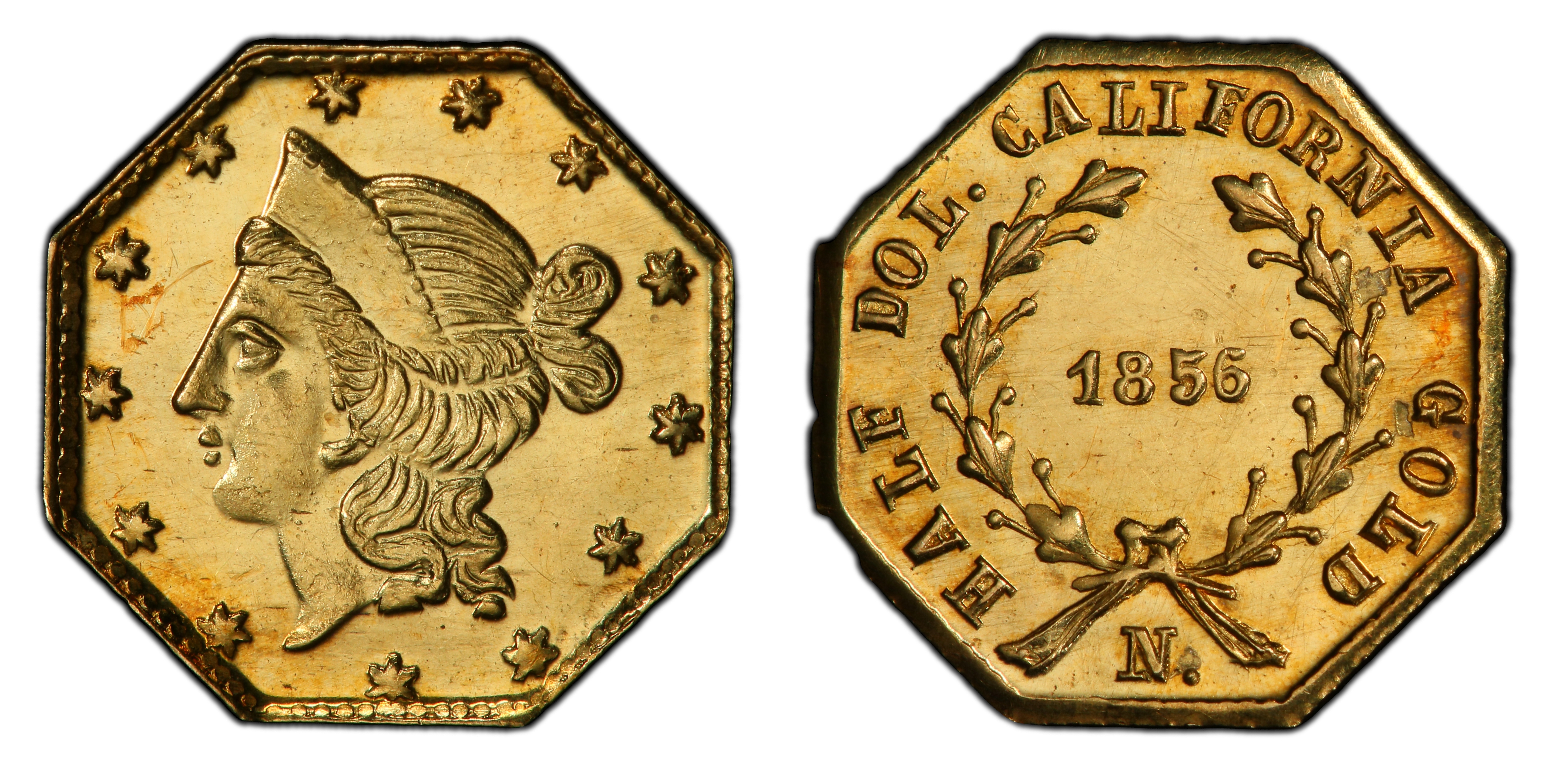 Obverse Inscription Reverse DescriptionA wreath, described in auction records as having four pairs of berries on each branch, encircles the date '1856'. The denomination 'HALF DOL.' appears at the left border, outside the wreath. The coin has a distinct octagonal shape.