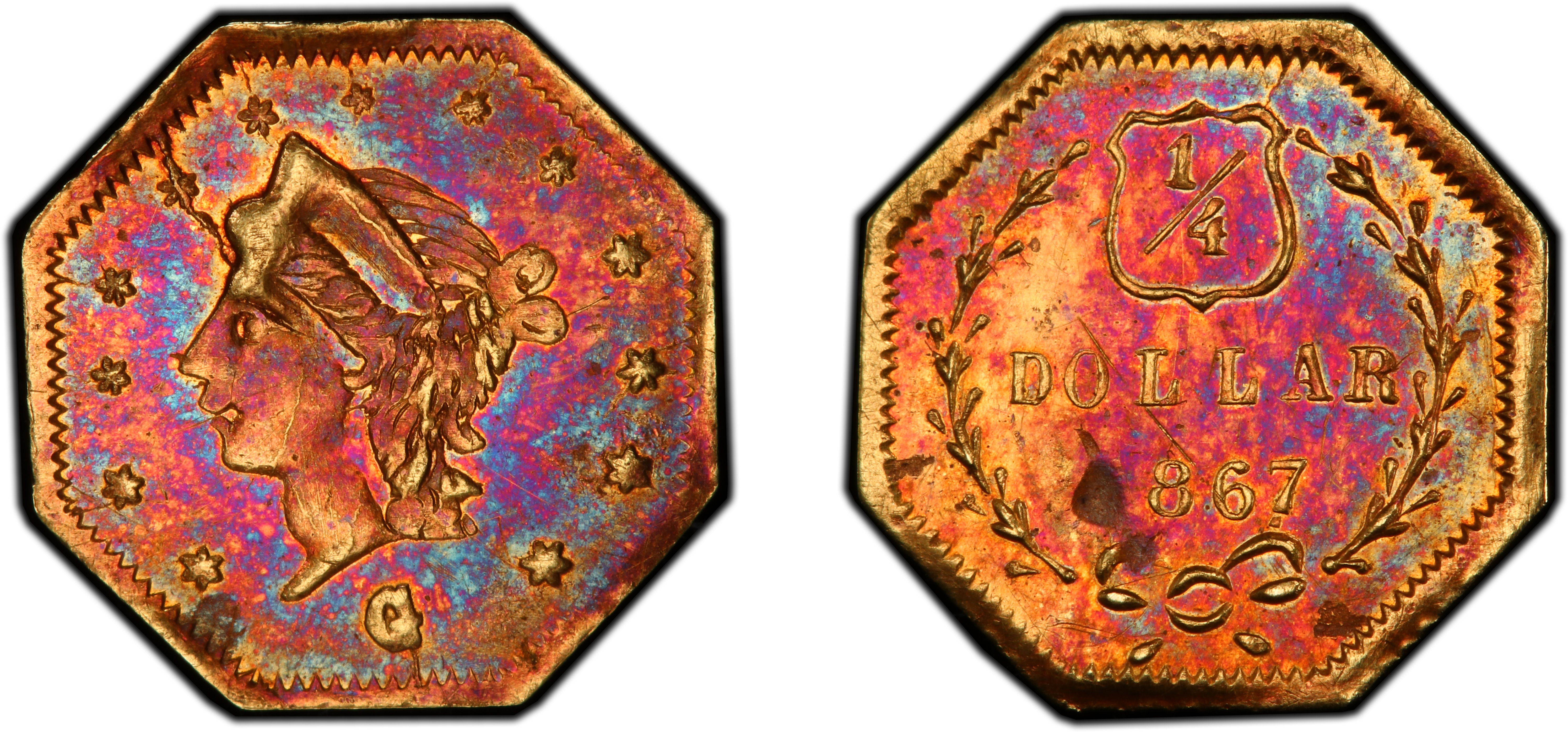 The 1867 BG-742 25 Cents is a product of what numismatists classify as 'Period Two' of California Fractional Gold production (1859-1882). Unlike the earlier 'Period One' pieces (1852-1856), which were struck out of genuine commercial necessity to alleviate a severe shortage of small change during the initial Gold Rush, Period Two issues served a dual purpose. By the late 1860s, the United States Branch Mint in San Francisco was producing ample federal coinage for the region. However, the allure of California gold was potent, and a robust market for souvenirs and curiosities had developed, driven by tourism and a romanticized view of the '49er era. Local jewelers, many of whom were highly skilled metallurgists and engravers, stepped in to meet this demand. These 'jeweler's issues' were not intended to circulate as money in the same way as their predecessors, but rather as mementos and private tokens. The Coinage Act of April 22, 1864, had made the private minting of coins illegal, but this law was not strictly enforced against these small, denominational tokens until 1883. This legal gray area allowed for their continued production. The BG-742 is a quintessential example of this era's output: privately struck, bearing a denomination, and echoing the designs of federal coinage, yet ultimately a commercial product rather than a necessity. The extreme rarity of the BG-742 variety today suggests its original production was very limited, likely the work of a single small-scale jeweler whose identity is now lost to history. These pieces represent the sunset of private minting in California, a final echo of the economic autonomy and frontier spirit of the Gold Rush.