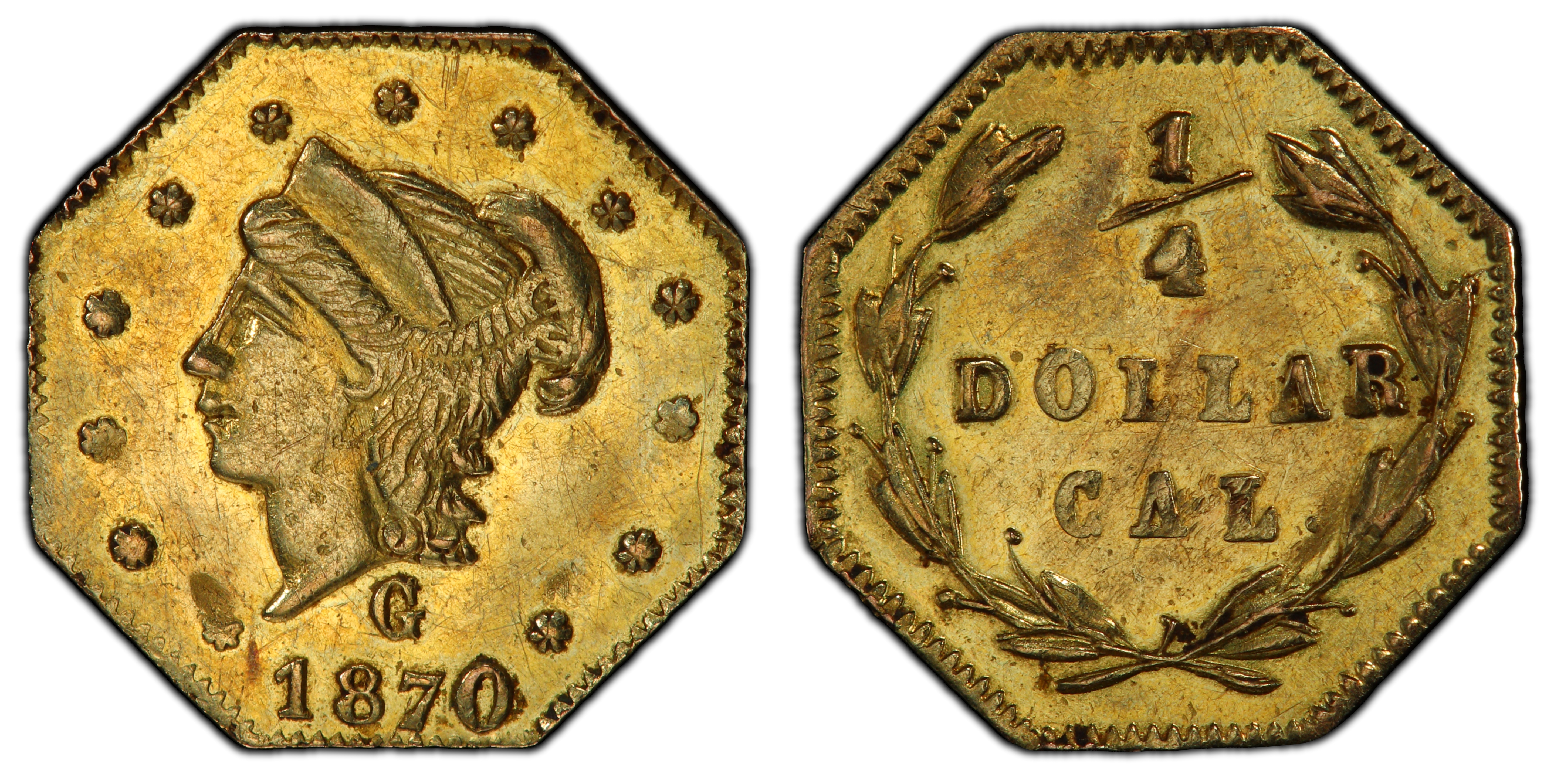 The 1870 G25C BG-760 is a classic example of a 'Period Two' California Fractional Gold piece, a fascinating and complex series born from the California Gold Rush. The initial wave of fractional gold, known as Period One (1852-1857), was struck to alleviate a severe shortage of small change for daily commerce. These early issues were generally of good quality and circulated widely. However, by 1870, the context had shifted dramatically. The San Francisco Mint was in full operation, producing ample federal coinage and mitigating the initial need for private issues. The Coinage Act of 1864 had officially declared private coinage illegal, pushing such activities into a legal gray area. Consequently, Period Two fractionals, including BG-760, were not primarily intended to serve as circulating currency. Instead, they were produced by jewelers and merchants as souvenirs, keepsakes for tourists, and novelty items for a public still enchanted by the allure of the Gold Rush. These later pieces were often deliberately underweight and of lower fineness than their stated face value, functioning more as tokens than true coinage. The BG-760 is an artifact of this later era, representing the commercial adaptation of a numismatic tradition. Struck in the workshop of San Francisco jeweler Robert B. Gray, it showcases the delicate craftsmanship of the time, though on a minuscule scale. Its extreme rarity today suggests a very limited original production, likely made as part of a small batch for private sale. Astonishingly, the BG-760 variety was unknown to the numismatic community until its discovery by researcher David Doering between 1980 and 1982, adding a modern chapter to its quiet history and underscoring the potential for new discoveries within this intricate series.