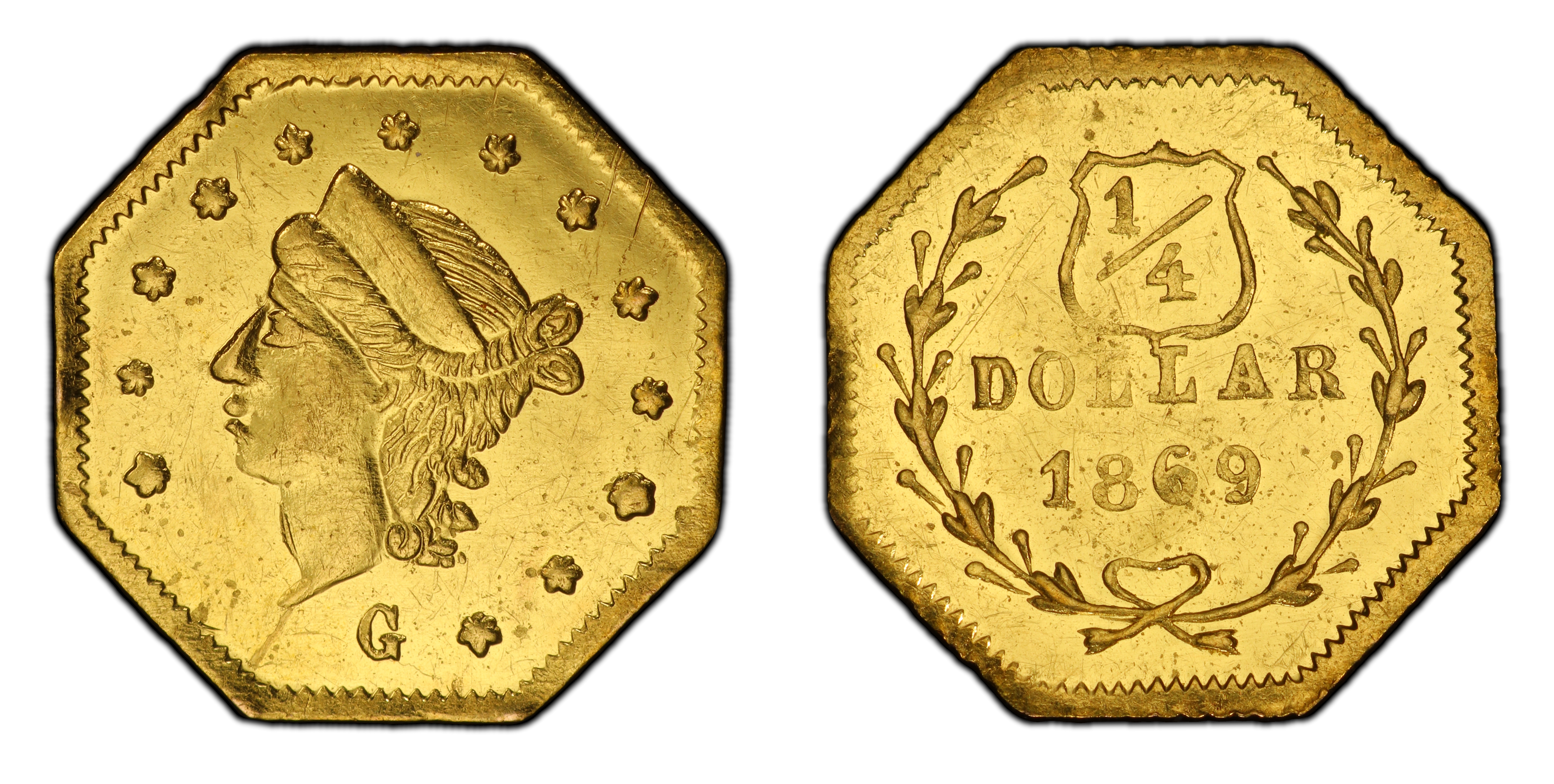 The 1869 G25C BG-749 emerges from the second major period of California Fractional Gold production (1859-1882), a fascinating era that followed the initial gold rush fervor. By the late 1860s, the California economy had matured, but a chronic shortage of small-denomination federal coinage persisted, particularly on the West Coast. The U.S. Mint in San Francisco, which began full operations in 1854, focused on larger denominations, leaving a void for everyday transactions. Local jewelers and metallurgists stepped in to fill this gap, producing tiny 25-cent, 50-cent, and dollar pieces. Unlike the earlier 'Period One' issues (1852-1856), which were intended to be functional currency and more closely resembled federal coinage, these 'Period Two' pieces, often termed 'jeweler's issues,' were typically underweight for their stated value and featured a wider variety of designs. They served a dual purpose: facilitating small commerce and acting as popular souvenirs for a growing tourist trade and as keepsakes for locals. The Coinage Act of 1864 had prohibited private coinage, but enforcement was lax, allowing production to continue for nearly two decades. These pieces were manufactured using hand-operated presses or even the hammer method, resulting in coins of varying strike quality. The BG-749 variety, with its classic Liberty Head design, is a quintessential example of this period's output. Its existence is a direct reflection of the unique economic conditions of post-Gold Rush California, where the lingering abundance of gold and scarcity of small change created a niche market for private minters. These tiny gold pieces circulated to some extent but were also cherished as miniature symbols of California's gold-based prosperity, eventually becoming highly sought-after collectibles.