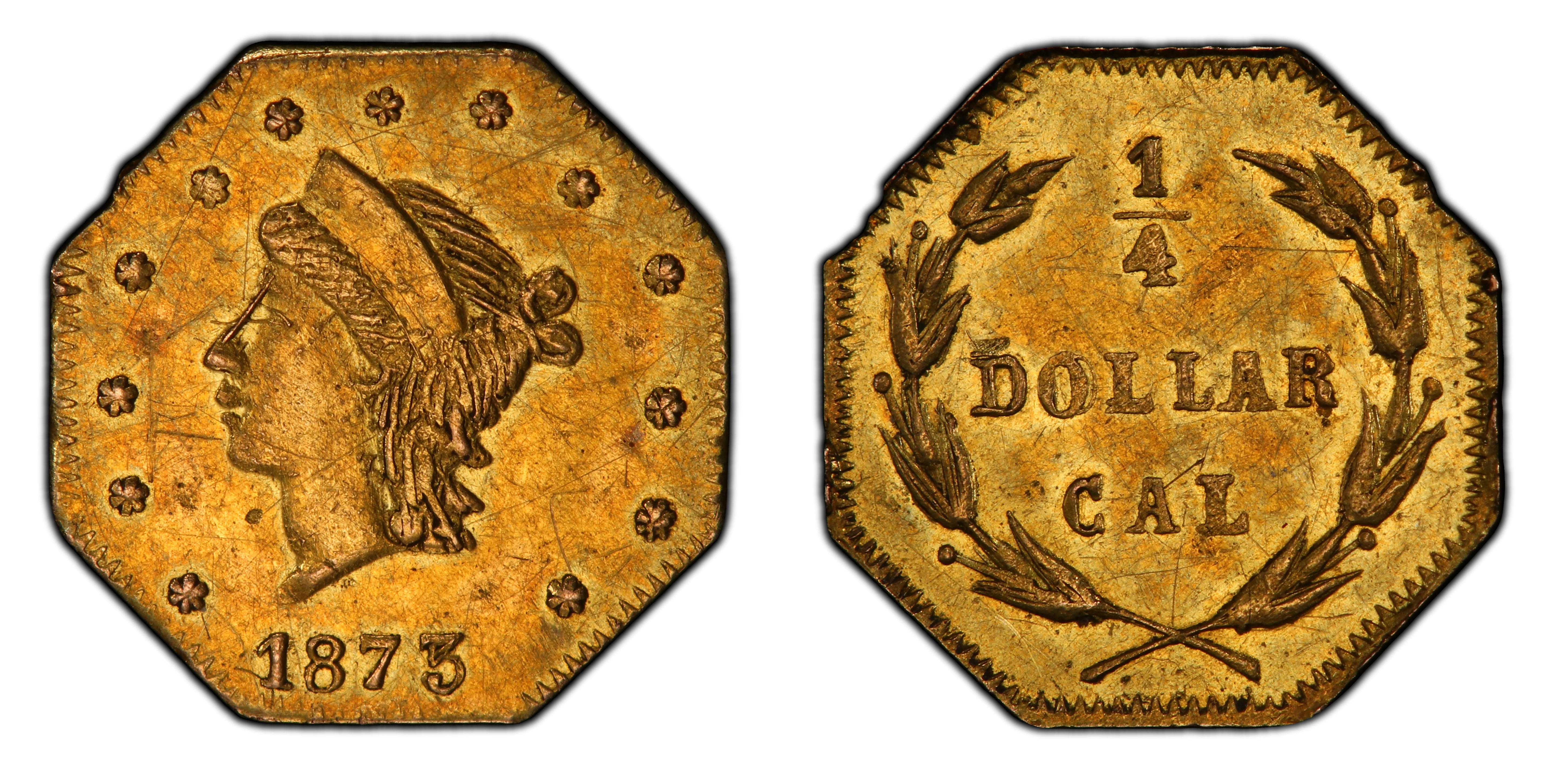 The 1875 Octagonal Liberty Head Quarter Dollar, cataloged as BG-777 in the Breen-Gillio reference, is a quintessential example of a 'Period Two' California Fractional Gold piece. The history of these fascinating miniatures is deeply rooted in the California Gold Rush, which began in 1848. The initial influx of gold prospectors and settlers created a chaotic economy, flush with gold dust but severely lacking in small-denomination coinage for everyday transactions. To fill this void, private jewelers and metallurgists began striking their own coins in 1852. These early 'Period One' (1852-1857) issues were utilitarian and intended for circulation, closely mimicking federal designs and containing reasonably honest gold content. By the time the San Francisco Mint was fully operational in the late 1850s, the acute need for these private issues had subsided. However, a new market emerged. California had become a major tourist destination, and romanticized souvenirs of the Gold Rush were in high demand. This gave rise to the 'Period Two' issues (1859-1882), often termed 'jeweler's issues.' These pieces, including the BG-777, were not primarily intended to circulate as money but were sold as keepsakes, charms, and curios. They were often significantly underweight for their stated value and exhibited a wide variety of designs, reflecting the creative liberty of their makers rather than a need for monetary uniformity. Struck in the commercial hub of San Francisco, the BG-777 was produced using the primitive 'hammer method,' where dies were struck by hand, leading to variability in strike quality. The passage of the Coinage Act of 1864 technically made private coinage illegal, but the law was not seriously enforced against these small souvenir pieces until the Secret Service cracked down in 1883, effectively ending their production. Today, the BG-777 is prized not as a coin that fueled the Gold Rush economy, but as a tangible link to the era's enduring legacy and the burgeoning tourist trade that followed.
