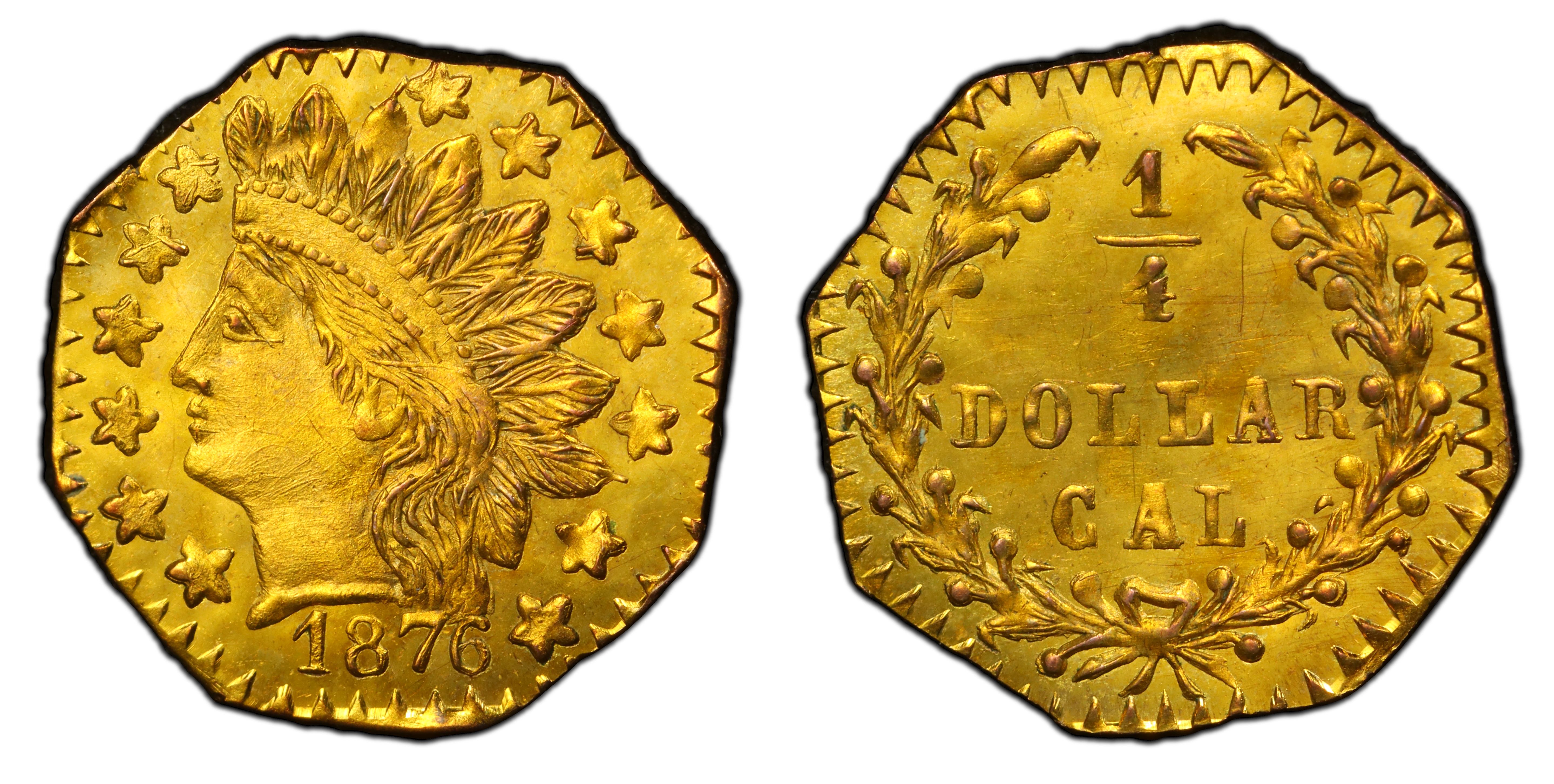 The 1876 BG-799 25 Cents represents a fascinating chapter in American currency, born from a unique economic environment decades after the initial frenzy of the California Gold Rush. This piece is classified as a 'Period Two' or 'Jeweler's Issue' of California Fractional Gold. By the 1870s, the acute shortage of small change that prompted the initial wave of privately-minted gold 'slugs' and fractional coins had been largely resolved by the output of the official San Francisco Mint. The need for a circulating private currency had vanished. However, the allure of California gold remained potent, transforming these tiny gold pieces from essential monetary instruments into coveted souvenirs, keepsakes, and jewelry items. San Francisco jewelers, many of French origin, stepped in to meet this new demand. They produced a vast array of small-denomination gold pieces, often back-dated to the Gold Rush heyday or bearing contemporary dates like 1876, which coincided with the nation's Centennial celebration, further boosting demand for mementos. These 'Jeweler's Issues' were not intended to and did not circulate as money. Consequently, they were often underweight for their stated value and their gold content could vary significantly, from as low as 14-karat up to near-pure gold. The production method was rudimentary, often involving a sledgehammer to strike the dies, resulting in coins with inconsistent strike quality. The BG-799 is a specific die marriage within a family of similar octagonal Indian Head quarter dollars dated 1876. Its existence is a testament to the cottage industry that thrived on nostalgia for the Gold Rush and the public's desire for miniature gold treasures. The federal government took a dim view of these private issues, viewing them as a violation of its sole authority to coin money. The Coinage Act of 1864 had already forbidden private coinage, but enforcement was lax until the Secret Service finally clamped down on the practice in 1883, bringing the era of California Fractional Gold to an abrupt end. The BG-799, therefore, is a relic from the twilight of this uniquely Californian numismatic tradition, more a commercial product than a coin, yet inextricably linked to the legacy of the western gold fields.