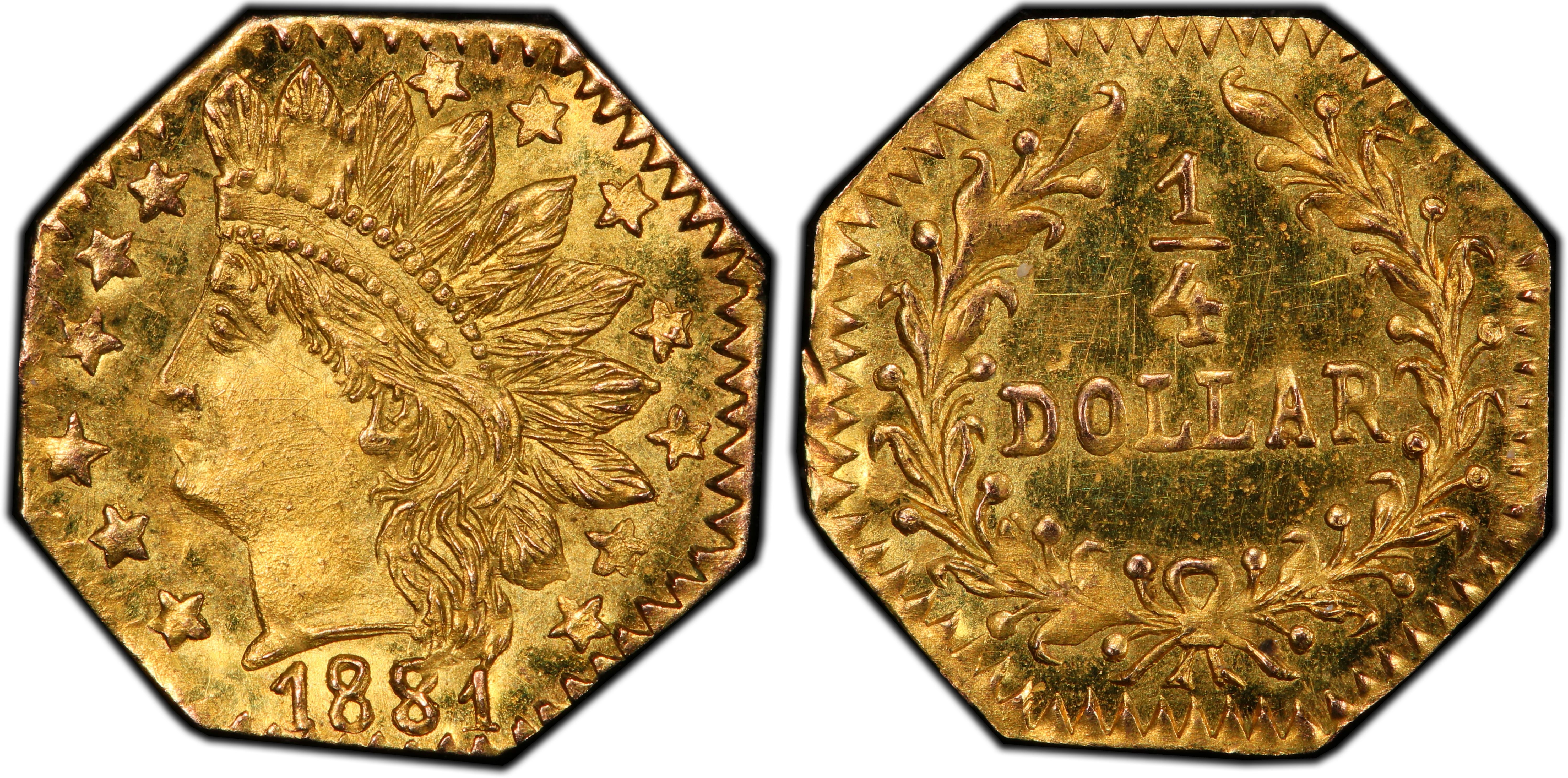 The 1881 BG-799O 25 Cents represents the twilight of the fascinating California Fractional Gold series. By this late date, the original purpose of these miniature gold pieces—to alleviate the chronic shortage of small denomination coinage during the initial Gold Rush frenzy—had long since passed. The establishment and efficient operation of the San Francisco Mint by the mid-1850s had saturated the region with official federal silver and gold coins, rendering private issues for commerce obsolete. The pieces struck from the late 1850s through the early 1880s, classified by numismatists as 'Period Two' issues, served an entirely different function. They were primarily produced by jewelers and merchants as souvenirs, trinkets, and novelties for a burgeoning tourist trade and for collectors back East who were captivated by the romance of the Gold Rush. Christopher Ferdinand Mohrig, a San Francisco jeweler and one of the most prolific producers of these late-date fractionals, created the BG-799O. His operation, however, was on a collision course with the federal government. The United States Secret Service, under the increasingly zealous direction of Chief James J. Brooks, began to aggressively investigate and suppress the manufacture of private coinage, arguing it violated the government's exclusive constitutional authority. While early issues had circulated out of necessity, these later 'jeweler's issues' were seen as a direct challenge to federal law, particularly the Coinage Act of 1864 which explicitly forbade private minting. Minters often employed tactics to circumvent prosecution, such as backdating coins or, in some cases, omitting the word 'DOLLAR' to argue the pieces were mere tokens. Mohrig himself was arrested in 1876, and his dies and equipment were confiscated, yet production of various pieces by him and others continued sporadically until the final crackdown in 1882-1883 effectively ended the era of private U.S. gold coinage. The BG-799O, dated 1881, stands as one of the very last gasps of this uniquely American numismatic tradition, a beautifully crafted memento from a time when private enterprise directly addressed the monetary needs—and later, the romantic imagination—of a nation.
