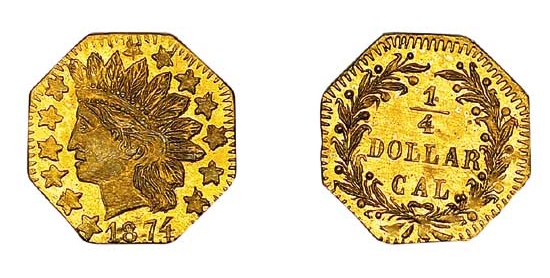 The 1874 BG-795 25 Cent piece belongs to the 'Period Two' (1859-1882) of California Fractional Gold production, a fascinating and complex chapter in American numismatics. Unlike the earlier 'Period One' (1852-1856) issues, which were struck out of genuine commercial necessity to alleviate a shortage of small change during the initial frenzy of the Gold Rush, Period Two pieces were created under vastly different circumstances. By the 1870s, the San Francisco Mint was in full operation, supplying ample quantities of official U.S. silver and minor coinage, effectively ending the need for private fractional gold to facilitate daily transactions. Instead, the production of these miniature gold coins shifted to serve a burgeoning tourist and souvenir market. San Francisco had transformed from a chaotic boomtown into a major American city and a destination for travelers. Jewelers and private minters, whose names are now mostly lost to history, capitalized on the romantic allure of the Gold Rush by manufacturing these attractive, gold-based keepsakes. These pieces were not intended to circulate as money, but rather to be sold as charms, keepsakes, and mementos of a visit to the 'Golden State.' The Coinage Act of 1864 had explicitly prohibited private coinage, but the law was not aggressively enforced against these small, denominational tokens until the Secret Service finally cracked down in 1883, bringing the era of California Fractional Gold to a definitive end. The BG-795, with its popular Indian Head motif and octagonal shape, was a quintessential example of this souvenir-driven production. Its existence speaks to a California that was no longer a raw frontier, but one that was beginning to mythologize and commercialize its own recent past.