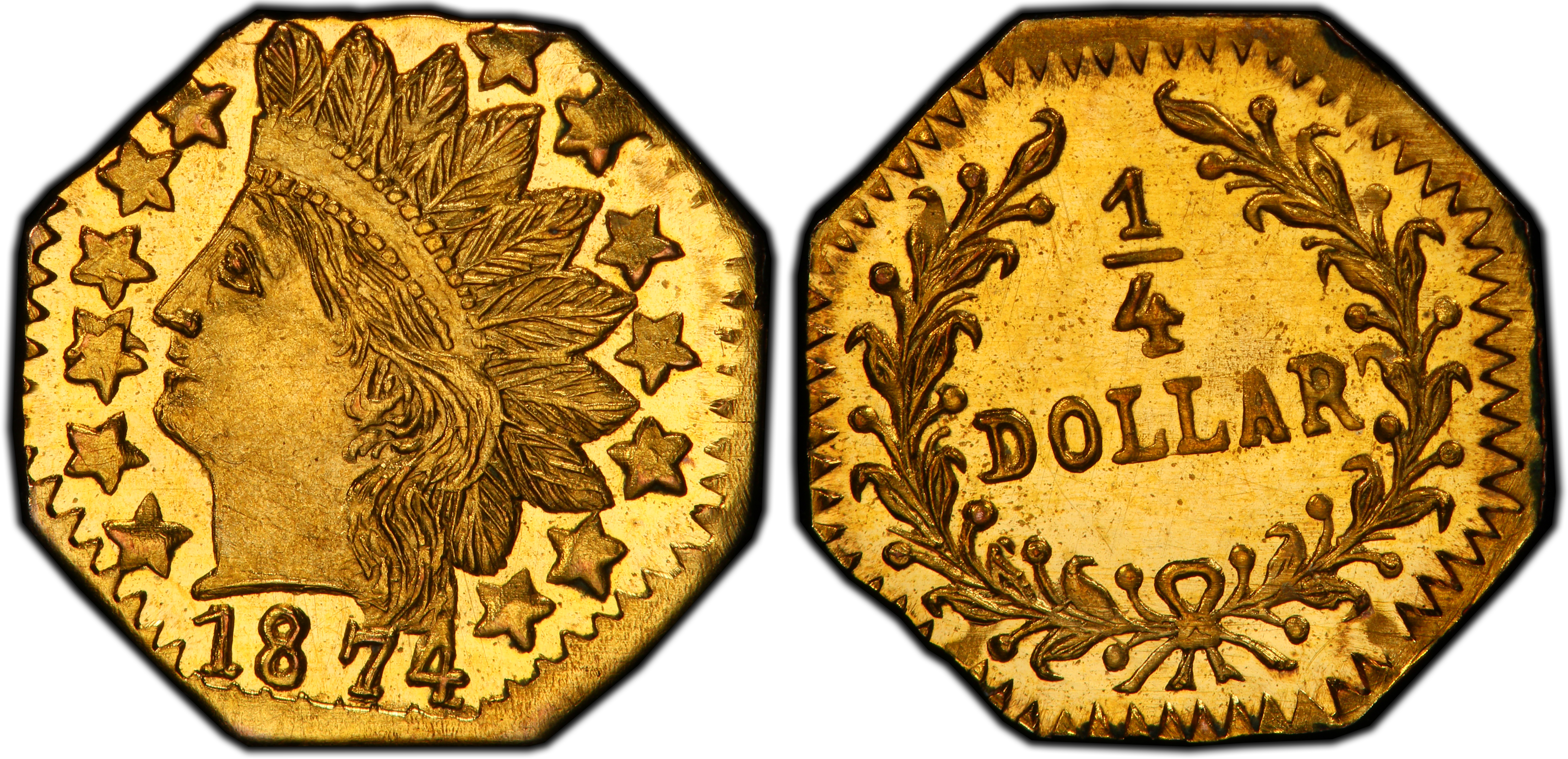 The 1874 Octagonal 25 Cent piece, cataloged as Breen-Gillio 799Q, belongs to the second great era of California Fractional Gold production, often termed 'Period Two' (1859-1882). Unlike their 'Period One' predecessors which arose from a genuine necessity for small-denomination circulating coinage during the initial chaos of the Gold Rush, these later issues were primarily created to satisfy a burgeoning market for souvenirs and keepsakes. By the 1870s, the United States Mint in San Francisco was in full operation, adequately supplying the region with official federal coinage and obviating the need for private issues in commerce. However, the romance of the Gold Rush had captured the nation's imagination. Tourists, businessmen, and settlers journeying to California sought tangible mementos of their experience. Astute local jewelers, many of whom had been involved in the earlier period of minting, recognized this demand and began producing a wide variety of attractive, miniature gold coins. These pieces were intentionally underweight, containing significantly less gold than their face value, effectively making them profitable tokens rather than true currency. The BG-799Q, with its popular Indian Head motif—a design choice mirroring contemporary federal coinage to lend an air of legitimacy and appeal—was a product of this commercial environment. It was likely struck using the 'hammer method,' where dies were struck by hand, leading to frequent variations in strike quality. The passage of the Coinage Act of 1864 had made all private coinage illegal, but the law was not strictly enforced against these small souvenir pieces until the Secret Service, under Chief James J. Brooks, began a crackdown in 1883, bringing the era of California Fractional Gold to a definitive close. These tiny gold pieces, therefore, represent the sunset of a uniquely American phenomenon, transitioning from a practical monetary solution to a nostalgic commodity.