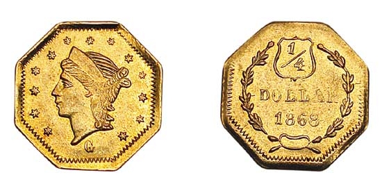 The 1868 BG-744 25 Cents is a quintessential example of a 'Period Two' California Fractional Gold piece. The series itself was born from the chaotic, commerce-starved environment of the California Gold Rush. Following the discovery of gold in 1848, a massive influx of population created an acute shortage of small denomination coinage for daily transactions. Initially, gold dust, pinches of gold, and foreign coins served as makeshift currency, but this proved impractical and unreliable. To fill this void, private minters, primarily jewelers in San Francisco with the requisite skills in working with precious metals, began striking their own small-denomination gold coins in 1852. These 'Period One' (1852-1857) issues were generally of good weight and intended to circulate to alleviate the coin shortage. However, by the time the 1868 BG-744 was produced, the context had shifted significantly. The San Francisco Mint, opened in 1854, was producing ample federal coinage, effectively ending the necessity for private fractional gold to circulate as money. Consequently, 'Period Two' pieces (1859-1882) were largely created to serve the burgeoning souvenir and tourist trade. Jewelers recognized a market in selling these charming, miniature gold coins as mementos of the Gold Rush. These pieces were often intentionally underweight and not expected to pass as legal tender, functioning more as tokens or keepsakes. The Coinage Act of 1864 made private coinage illegal, but it was not strictly enforced against these small souvenir pieces until 1883, allowing their production to flourish through the 1860s and 1870s. The BG-744, with its classic Liberty Head design reminiscent of federal coinage but octagonal shape, perfectly fits this historical nicheāa tangible link to the romanticism of the Gold Rush, produced for a public eager to own a piece of that legacy.