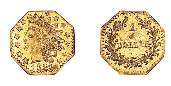 Obverse DescriptionThe obverse features a stylized head of an Indian princess facing left, adorned with a feathered headdress. Thirteen stars encircle the portrait along the octagonal border, with the date '1880' below. The '0' in the date is clearly punched over a '7' from an older die.