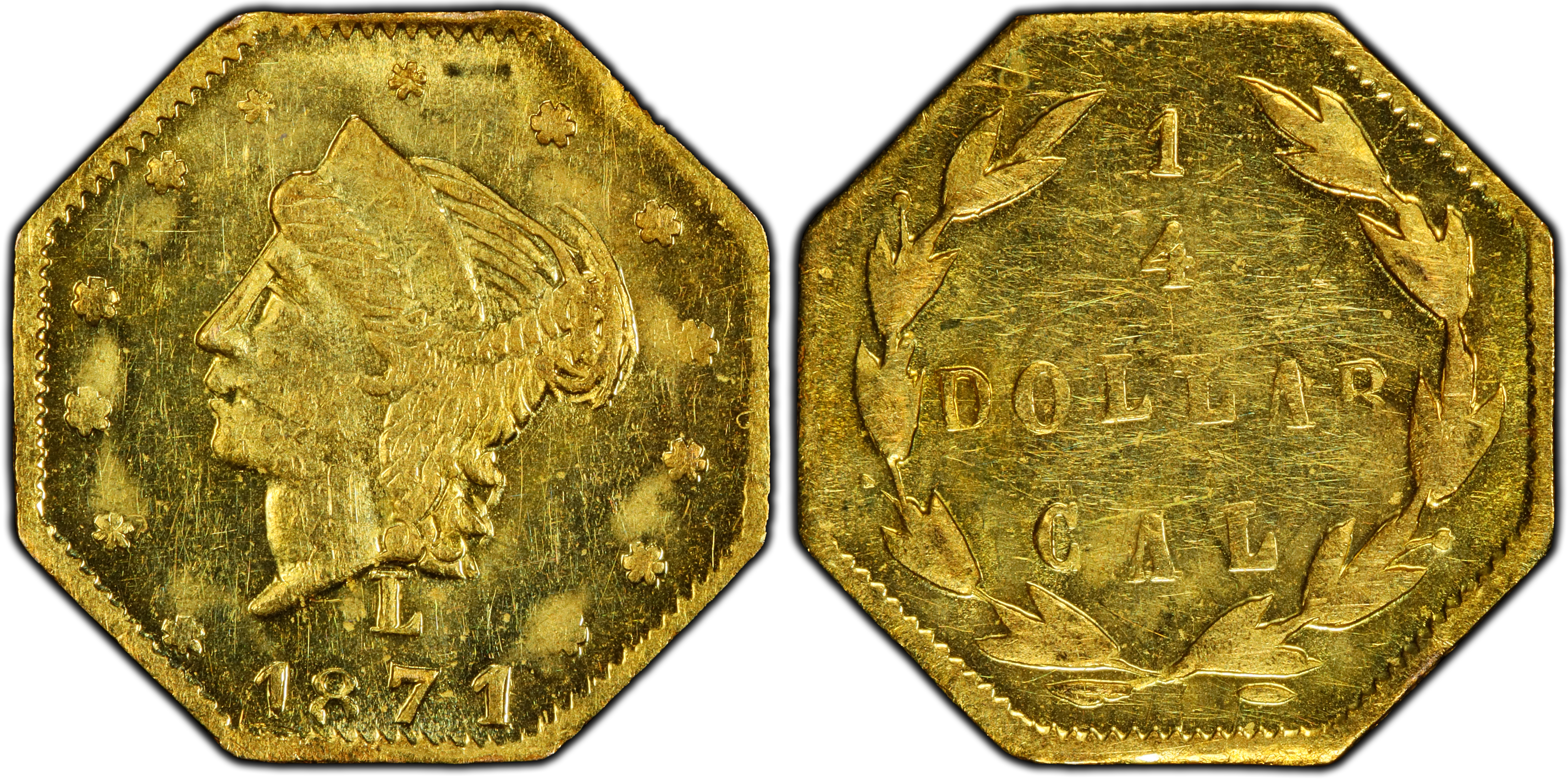 The 1871 Octagonal Liberty 25 Cents, cataloged as Breen-Gillio 771, is a quintessential example of a 'Period Two' California Fractional Gold piece. By 1871, the initial, desperate need for small denomination coinage that characterized the California Gold Rush had long subsided. The San Francisco Mint, operating since 1854, was in full production, supplying the West with ample federal silver and gold coins. The impetus for producing these tiny, privately-struck gold pieces had shifted entirely from commerce to curiosity. These later issues, often called 'jeweler's pieces,' were not intended to circulate as money but were created to satisfy a burgeoning tourist and souvenir market. San Francisco had transformed from a chaotic boomtown into a sophisticated city, a destination for travelers from the Eastern states and Europe who were captivated by the romanticism of the Gold Rush. These miniature gold coins served as perfect mementos of their visit. Legally, their production existed in a gray area. The Private Coinage Act of 1864 had made such private minting illegal, but the law was not aggressively enforced by the Secret Service until the early 1880s. This legal ambiguity allowed numerous anonymous jewelers and craftsmen, primarily in San Francisco, to continue striking a wide variety of designs. Unlike the earlier 'Period One' (1852-1857) issues, which were generally of honest weight and intended to alleviate a genuine coin shortage, Period Two pieces were notoriously underweight for their stated denomination. Their artistic quality also varied, with some being finely crafted while others were crude. The BG-771, with its traditional Liberty Head motif, harkened back to federal designs, lending it a veneer of legitimacy that appealed to buyers, even though its function was purely novelty. Their small size and gold content made them affordable keepsakes. Many were mounted into jewelry, such as stickpins, cufflinks, and watch fobs, which explains why many surviving examples are found holed, looped, or with evidence of solder. Today, the BG-771 is a tangible link to this secondary chapter of the Gold Rush story, representing the commercialization of its legacy and the entrepreneurial spirit of California's craftsmen.